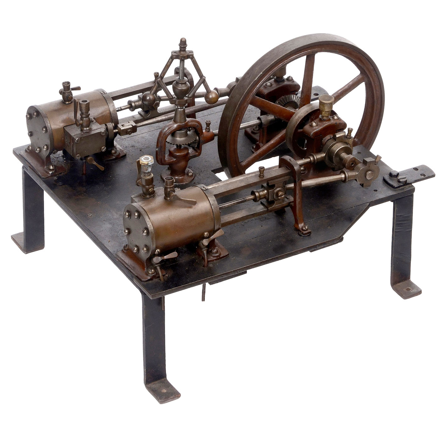 Cast metal and steel, cylinders Ø 6,7 cm each, crosshead guides in plain bearings, slide control with eccentric rings, 10 in. flywheel, speed regulator, on metal plate, 15 3/5 x 18 ½ in., smooth-running but untested.