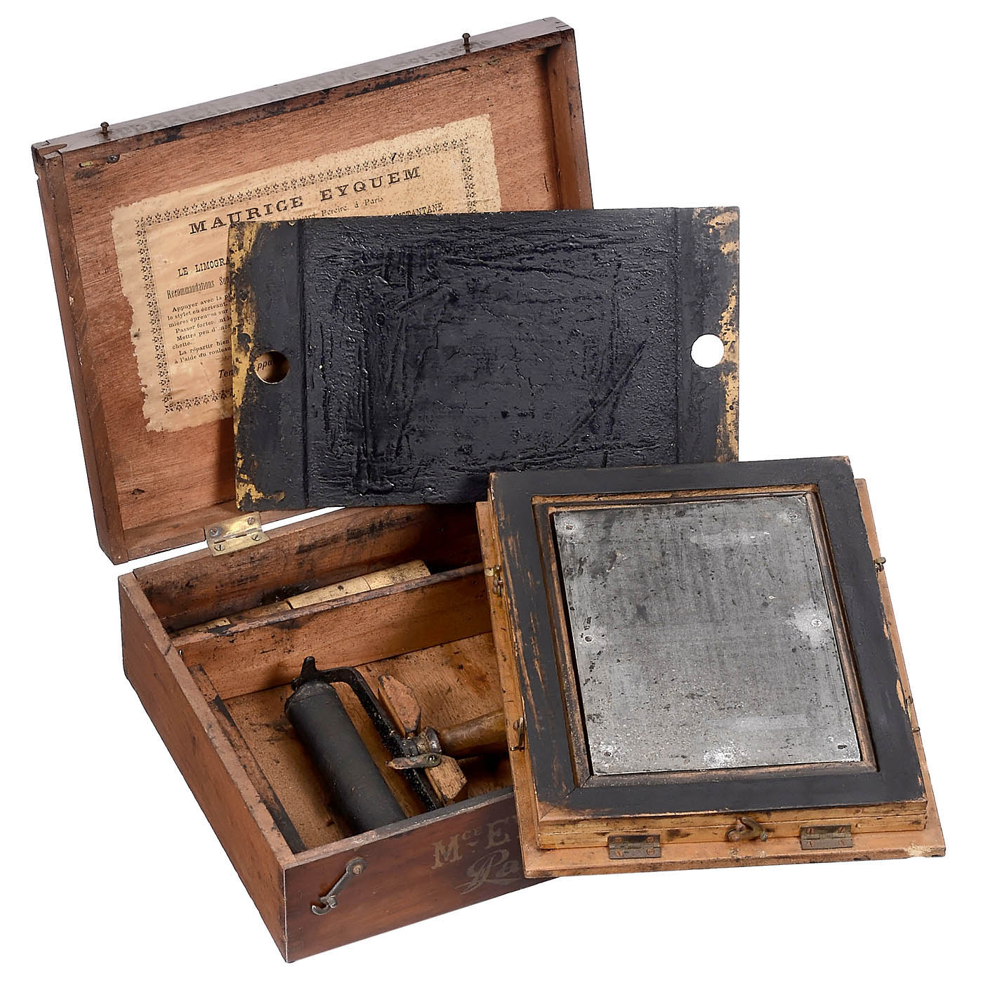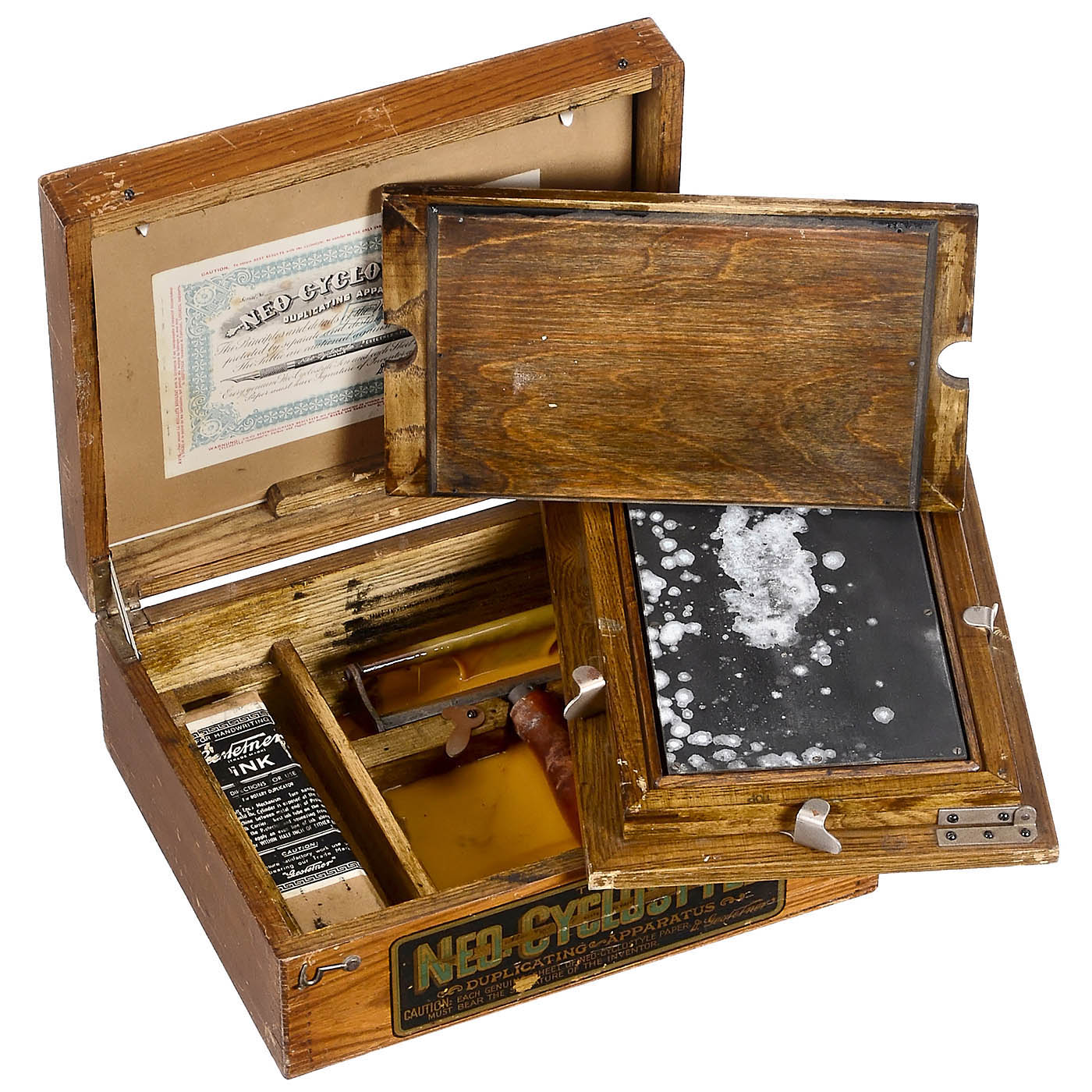 1) Smith Premier SP Duplicator, c. 1910. - 2) Gestetner's Neo-Cyclostyle duplicating machine, c. 1890, with pen, some ink and roller, in need of cleaning. - And: 3) Limographe Appareils à Imprimer, Maurice Eyquem, Paris, stencil copier, used in French schools until 1965.