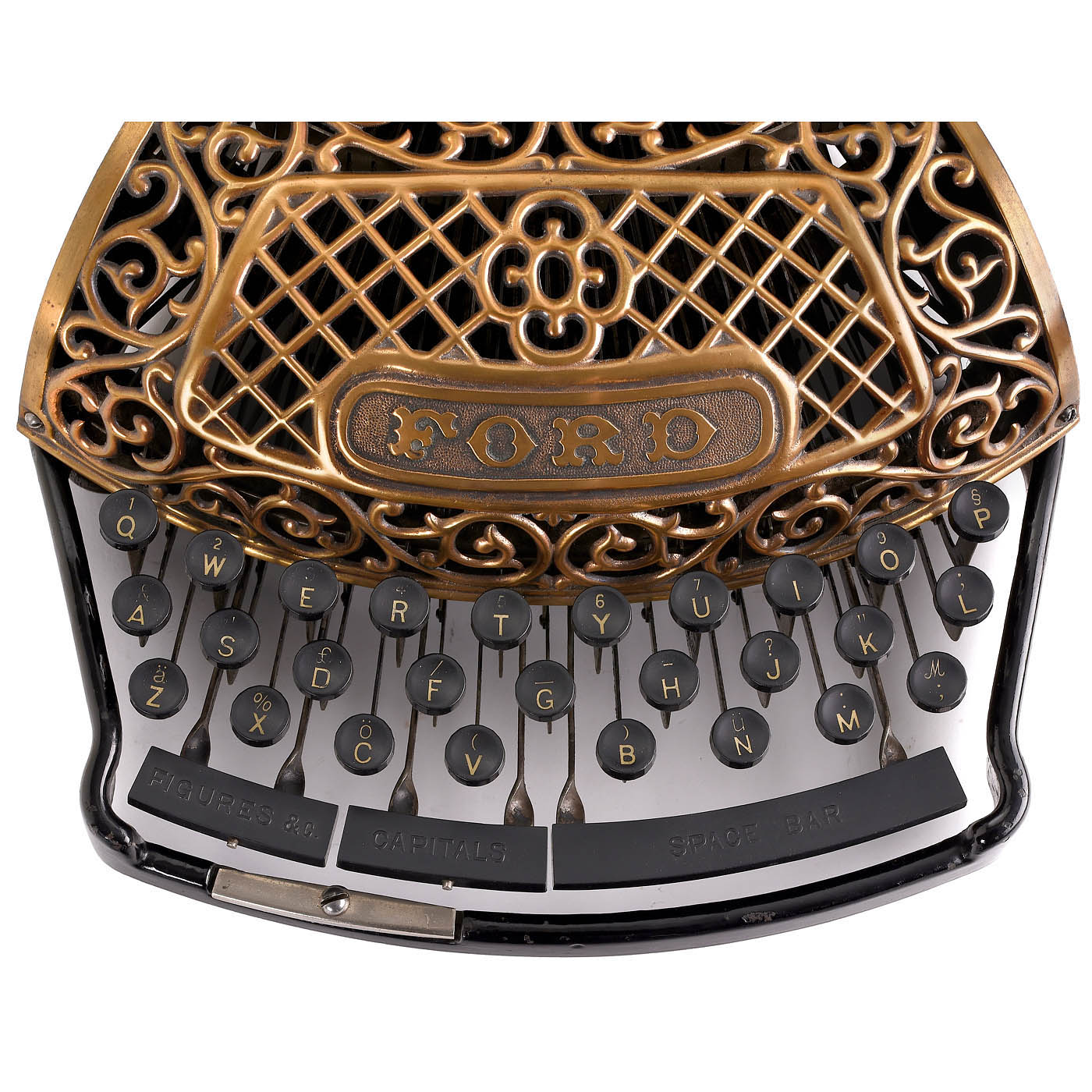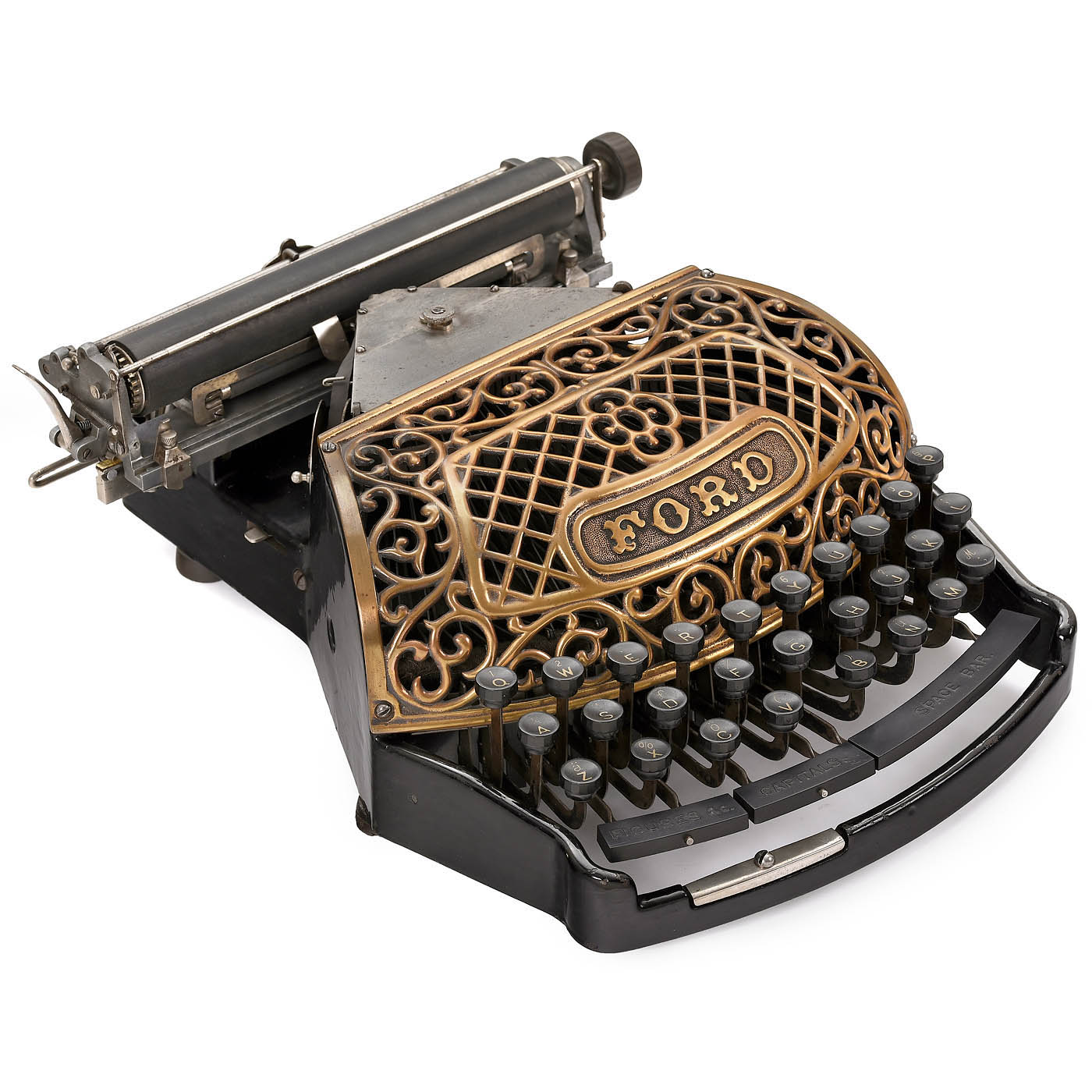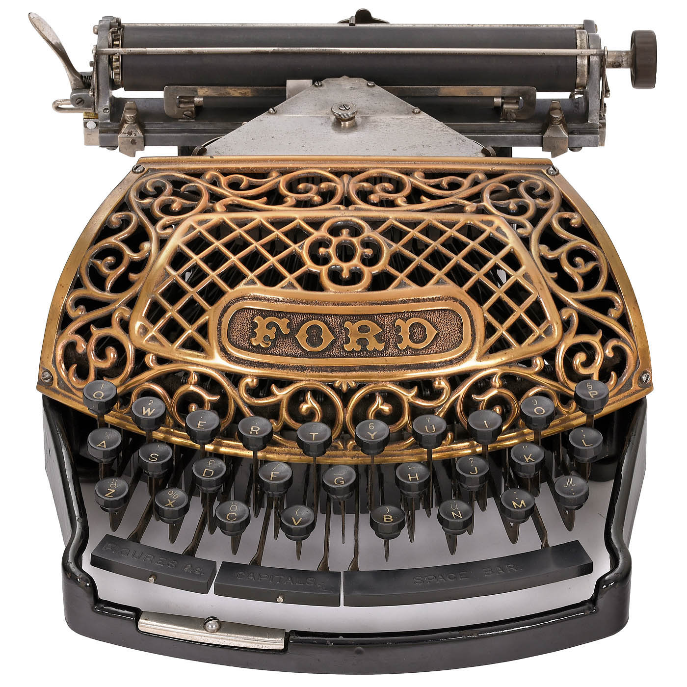 Ford Typewriter Company, New York, low serial no. 417, thrust-action three-bank double-shift ribbon typewriter with beautifully decorated copper-plated type-bar cover, black-enameled cast-iron frame and aluminum carriage. - Literature: P. Lippman, "American Typewriters", 1991, p. 83; Martin, 1949, p. 143. - A fine collector's item and exhibition piece in fully-working original condition.
