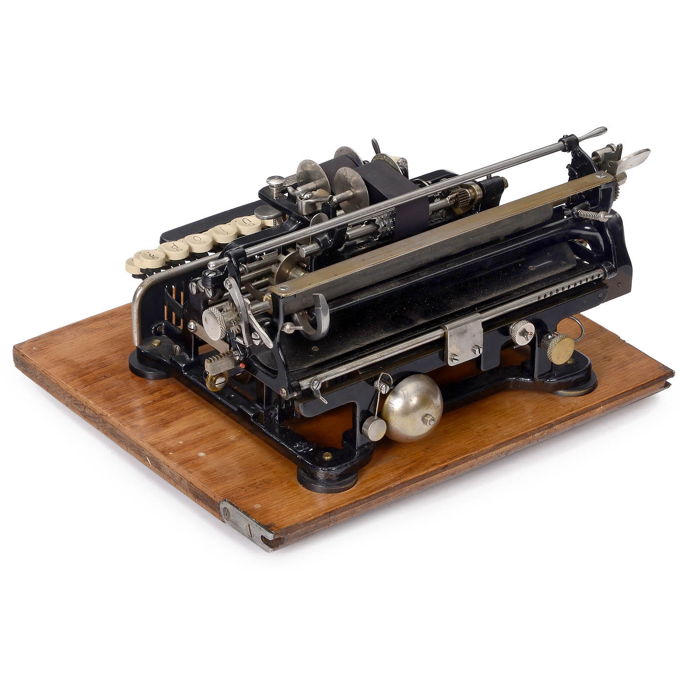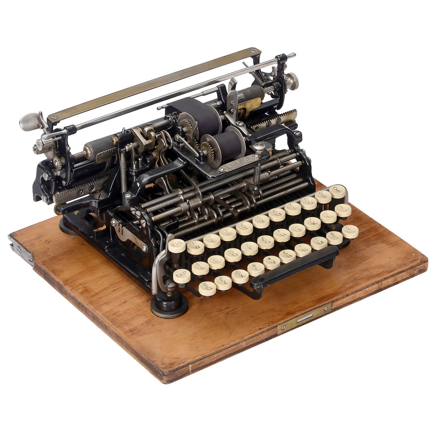 Early precursor of the "Chicago", still with open construction, invented by Samuel John Seifried, manufactured by Munson Typewriter Company, Chicago, USA, with horizontal type sleeve that is hit from behind by a hammer, low serial no. 2809! Good optical condition, mechanism partially resinous. - Literature: Martin, 1949, S. 119. - Very rare machine!