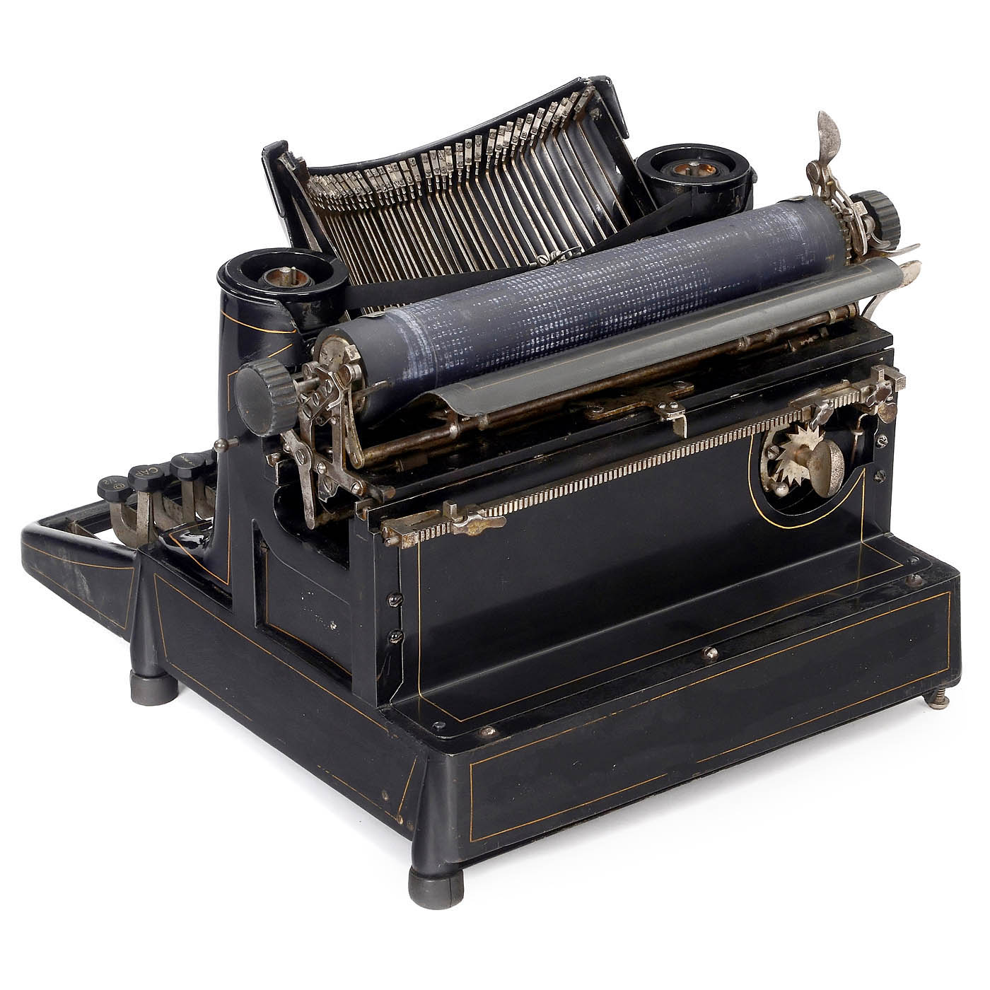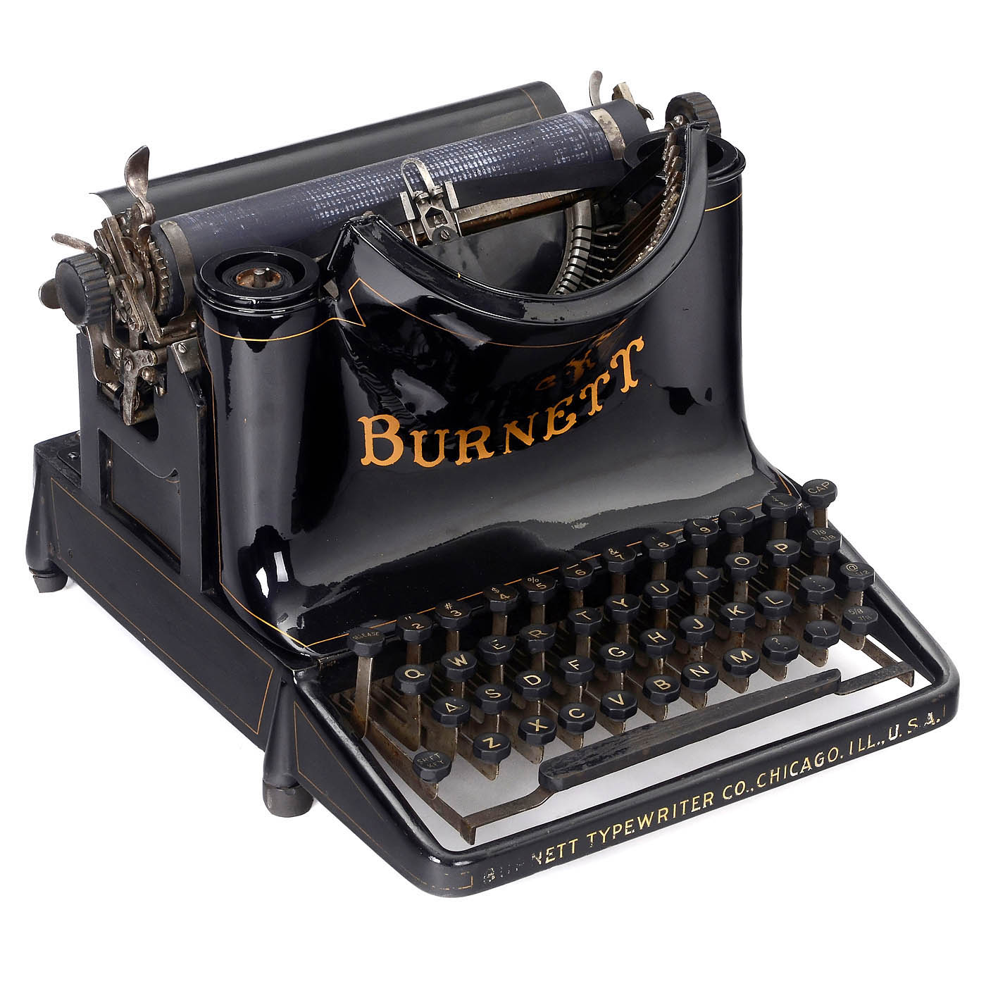 A tremendously rare American typewriter produced for a few months only by the Burnett Typewriter Co., Chicago. Only 12 machines are known world-wide. Spectacular sloping typebar arrangement, streamlined front cover and typewriter ribbon cover. Serial no. 17. Ink ribbon transpoert defective, cover new varnished. - Literature: Martin, 1949, p. 231. - A very special highlight and a superb exhibition piece in any advanced private or public collection.