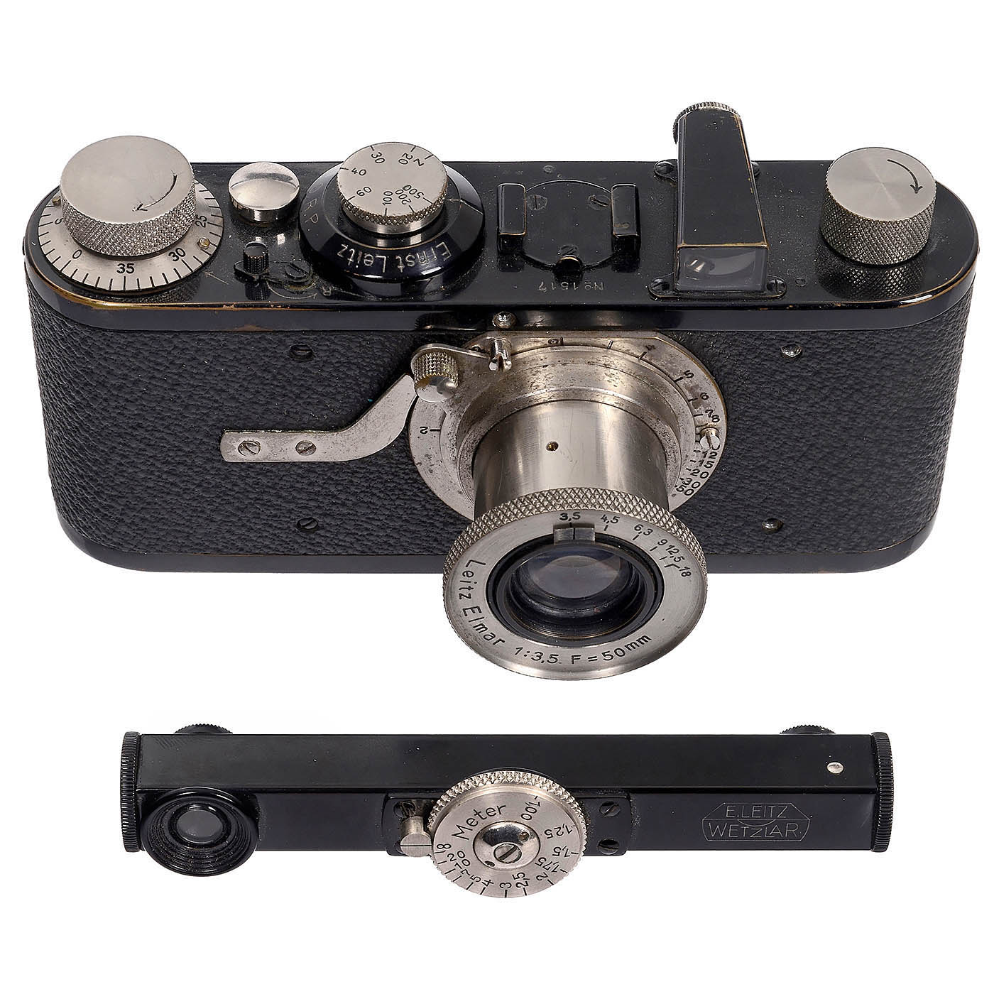 Leitz, Wetzlar. With low serial no. 1517, mushroom-shaped shutter-release, feet scale, FODIS rangefinder (meter setting wheel stiff) and case, two screws missing from front left, shutter sticking, crack in vulcanite at back.