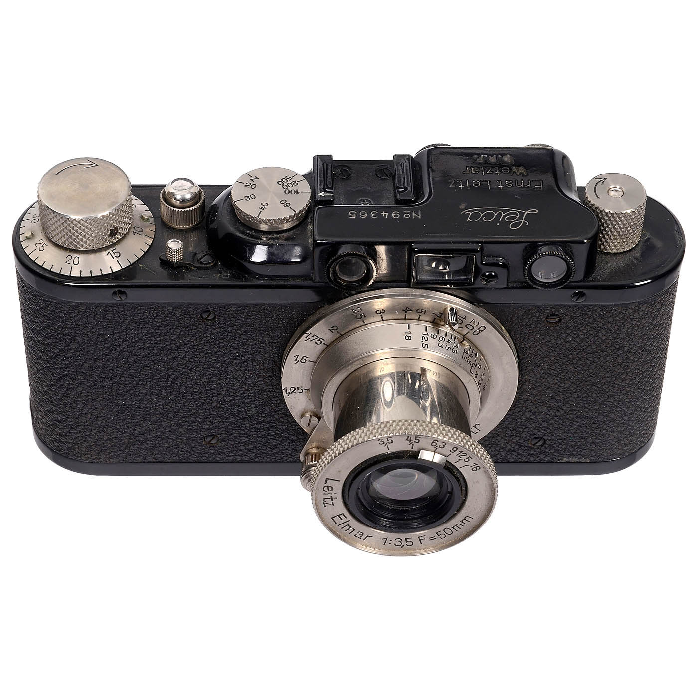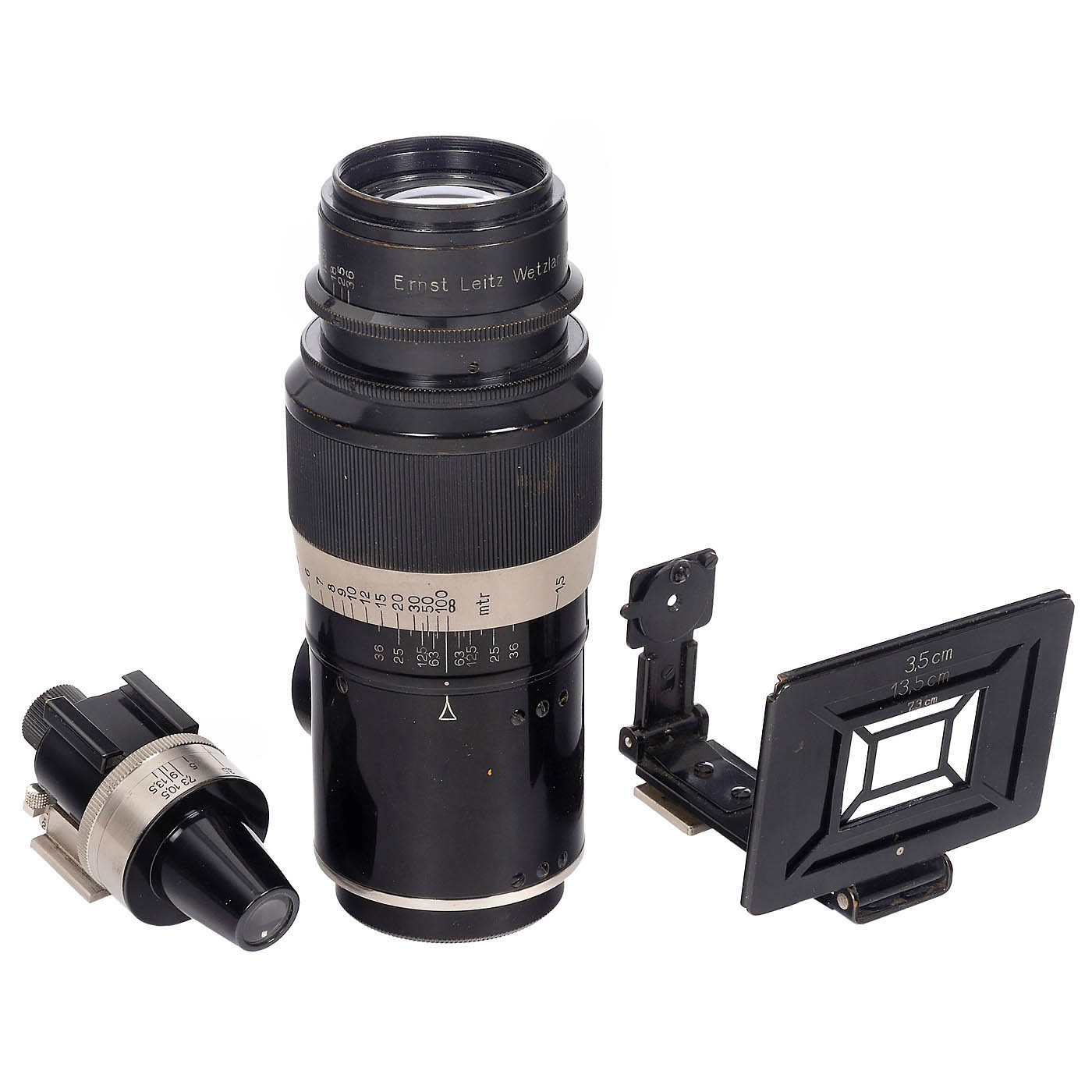 Leitz, Wetzlar. 1) Leica II no. 94365, c. 1932, with nickel-plated Elmar 3.5/50 mm lens no. 222604. (3/3) - 2) Elmar 4.5/135 mm lens, without complete number, black and nickel-plated, with original back cap, engraved "924" below aperture ring, not matched to "0", but to a Leica I model C with a serial number ending in 924. An unusual lens in unusually good condition. (3+/3+) - 3) Universal viewfinder VIDOM, nickel/black with conical nose, very good condition. (2-/3) - And: 4) First frame viewfinder (sports viewfinder) RASAL, c. 1933, with feet engraving. (3/3)