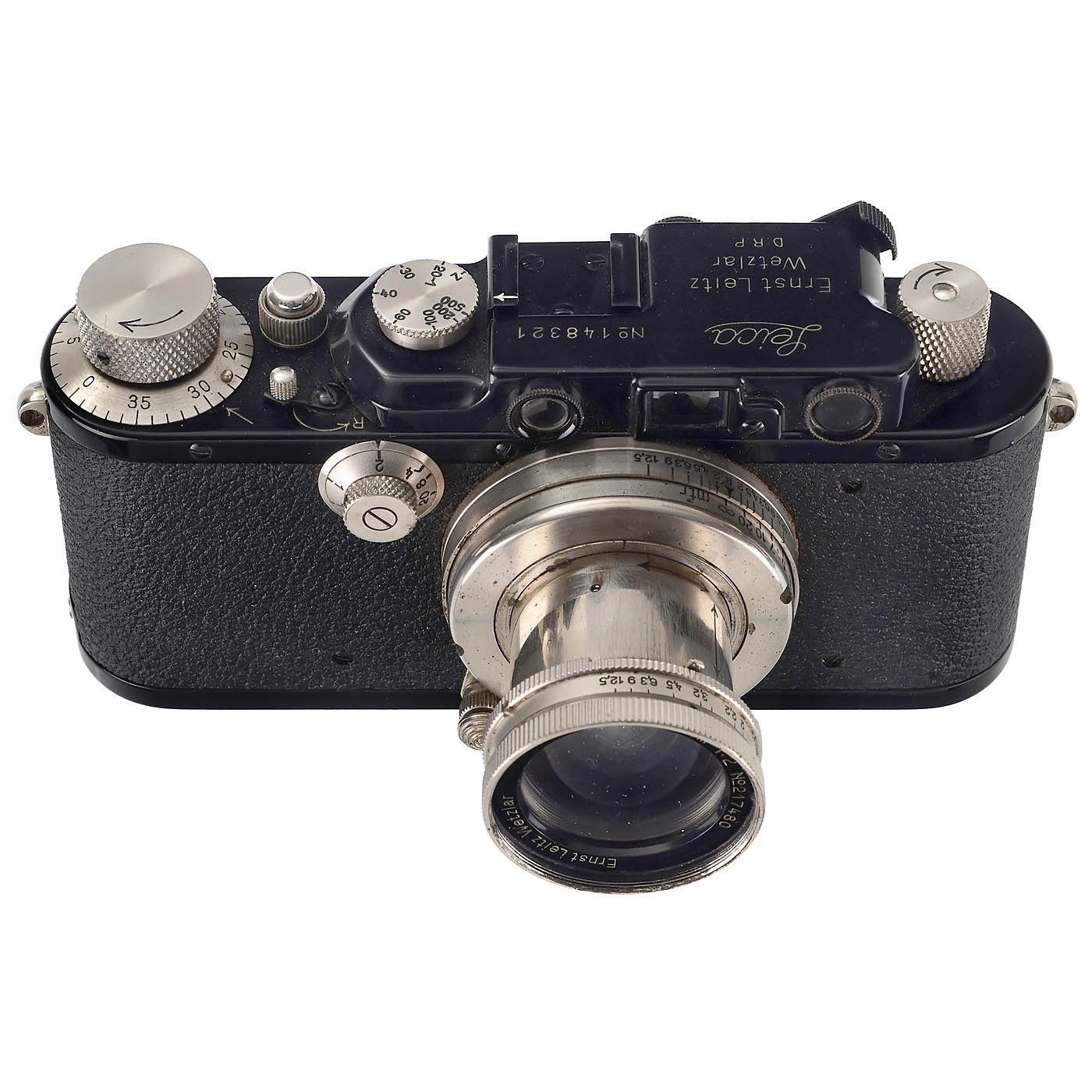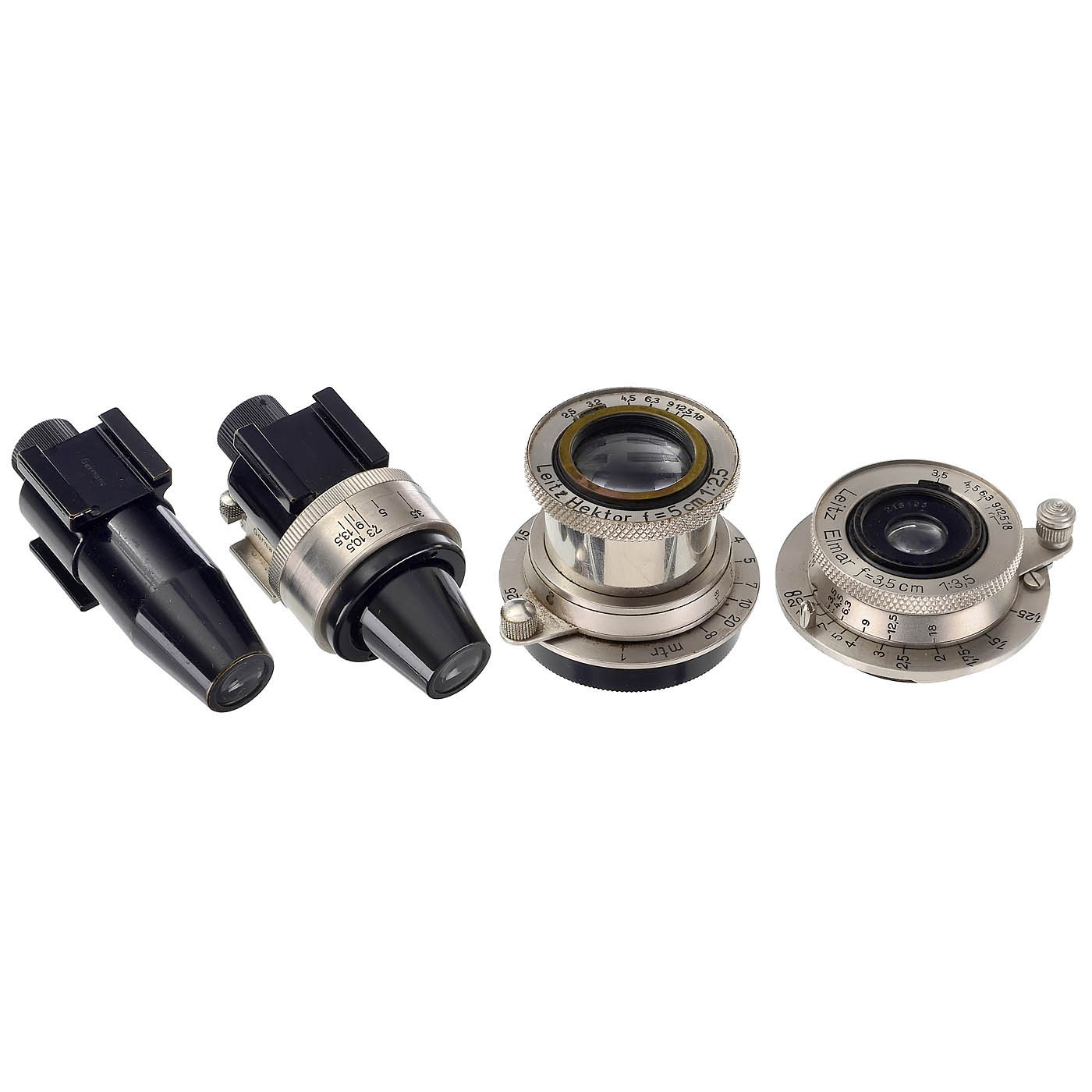 Leitz, Wetzlar. 1) Leica III no. 148321, with nickel-plated controls, rangefinder accurate, attractive camera, parts may have been professionally repainted. (2-3/3) - 2) Hektor 2.5/5 cm, without serial number, matched to "0", with metal back cap, cleaning marks on front element. (3-/3-) - 3) Summar 2/5 cm, no. 217480, suitable for Agfa lenticular film. (3/3) - 4) VIDOM universal viewfinder, black, nickel-plated, feet scale, good condition. (3+/3+) - 5) VISET torpedo finder for 3.5, 5, 9 and 13.5 cm. (3/3) - And: 6) Elmar 3.5/3.5 cm, no. 215193, rear element missing, otherwise fine condition. (2/-)