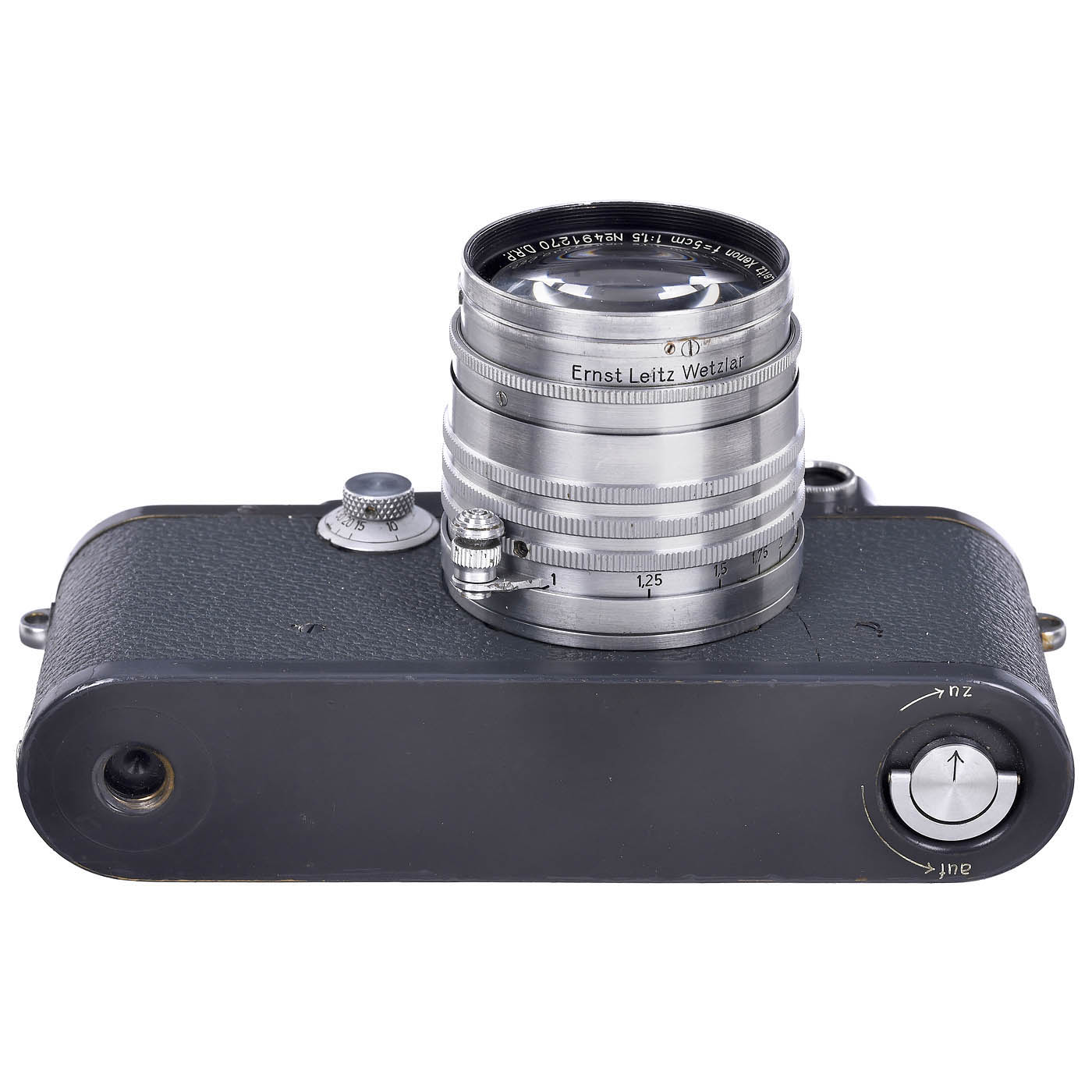 Leitz, Wetzlar. No. 390130K, grey paint, with ball-bearing shutter, the usual printed "K" on the shutter curtain absent, with Leitz Xenon 1.5/5 cm lens no. 491270 D.R.P., very faint film visible on glass under point light, approximately 2 cm barely visible hairline crack in the grey vulcanite on the right. A very well-preserved camera.