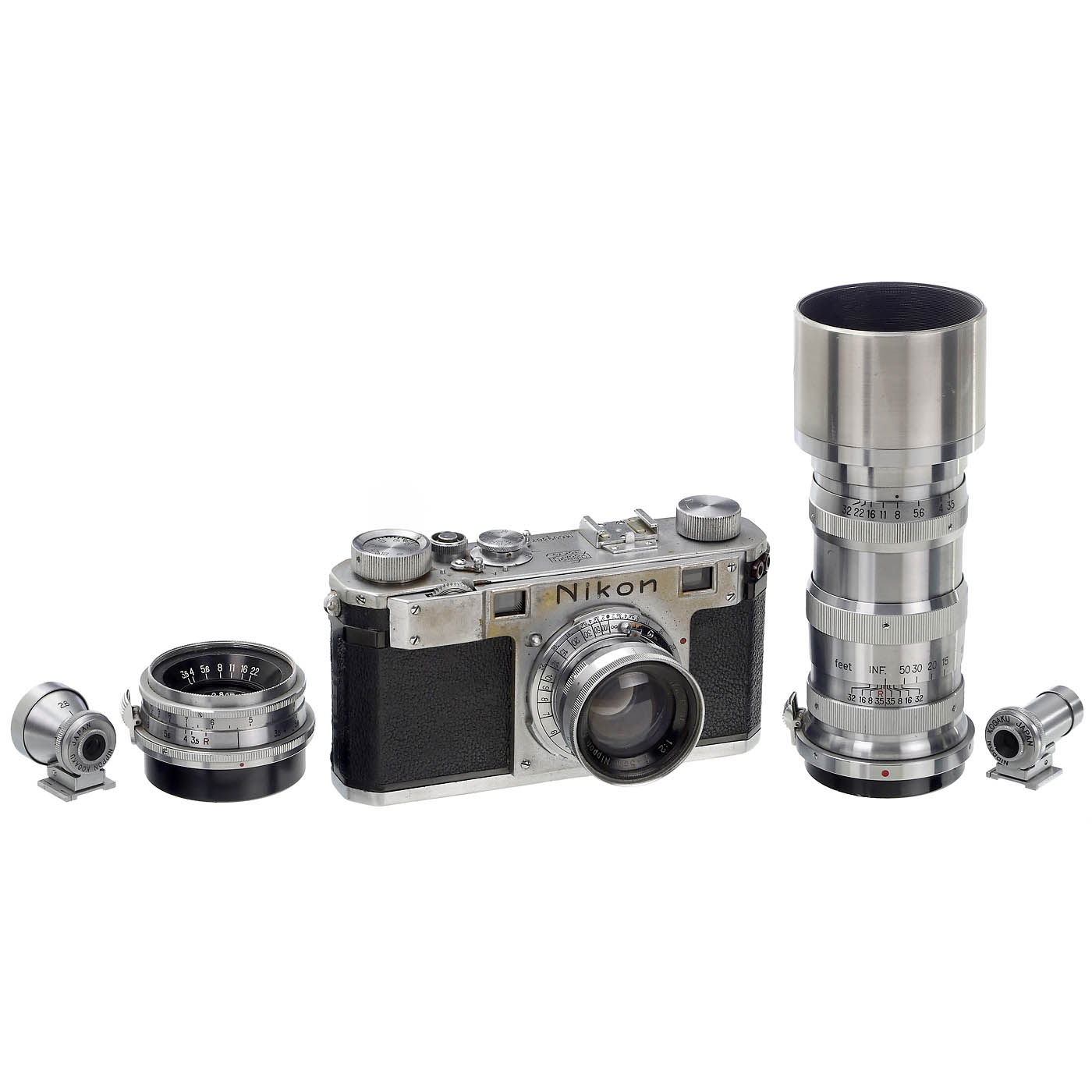 Nippon Kogaku, Japan. 1) Nikon M "Synchro", 24 x 34 mm, no. M6093872, 1949 onwards, in case (good condition), leather on back dented, heavy wear on the front panel, shutter and rangefinder work well. A sought-after Nikon metering viewfinder camera. (4-/3) - 2) W-Nikkor C 3.5/2.8 cm lens, no. 712762, 1952 onwards, optics clean under point light, with black metal back and front caps. (3/3) - 3) Nikkor-H C 2/5 cm lens no. 811535, 1946 onwards, heavy cleaning marks on front element. (3/4) - 4) Nikkor-Q C 3.5/13.5 cm no. 263182, 1951 onwards, infrared index, internal optics with deposits when viewed under point light, otherwise attractive example with original sun visor and metal back cover. (2-/3) - 5) Nikon viewfinder 2.8 cm, good condition. (3+/3+) - And: 6) Nikon viewfinder 13.5 cm, good condition. (3+/3+)