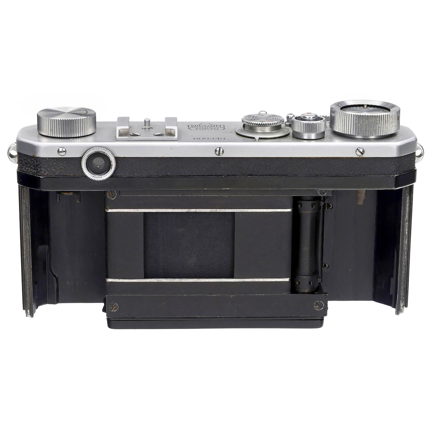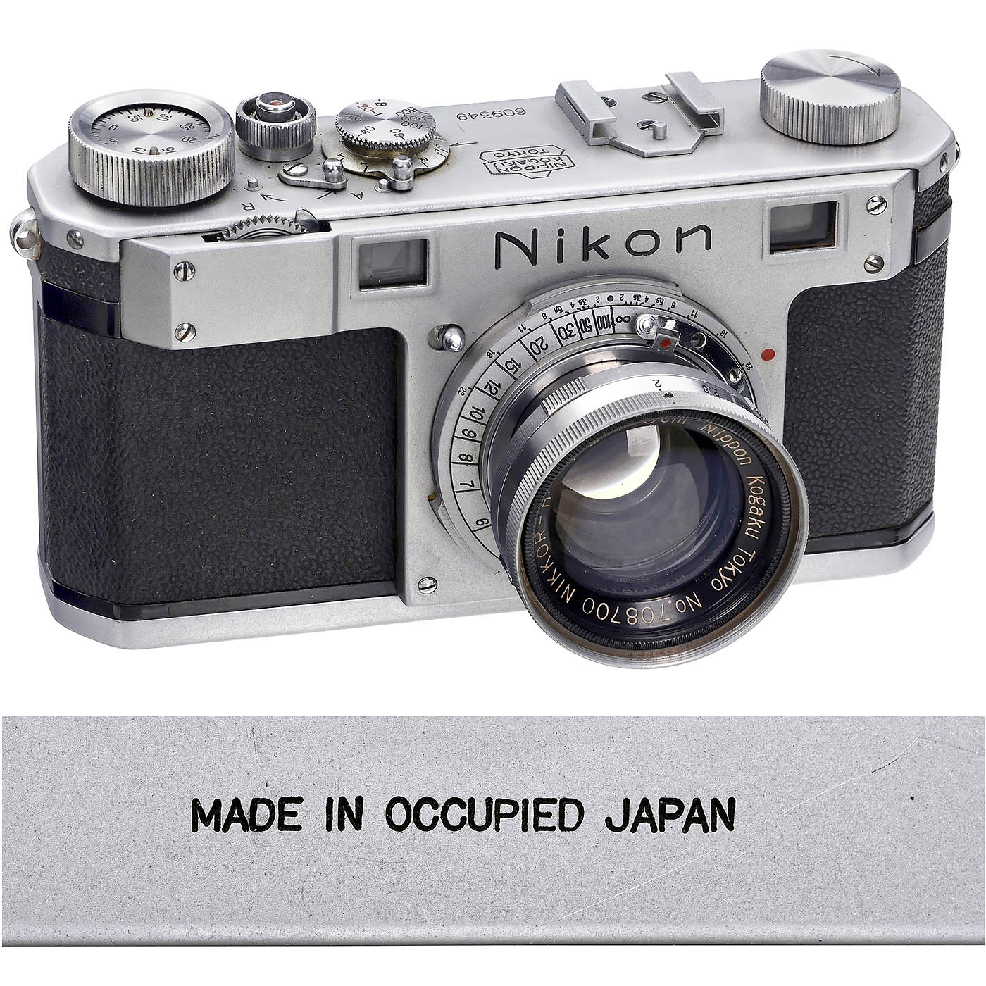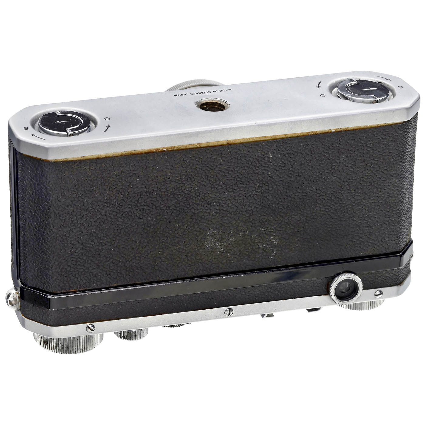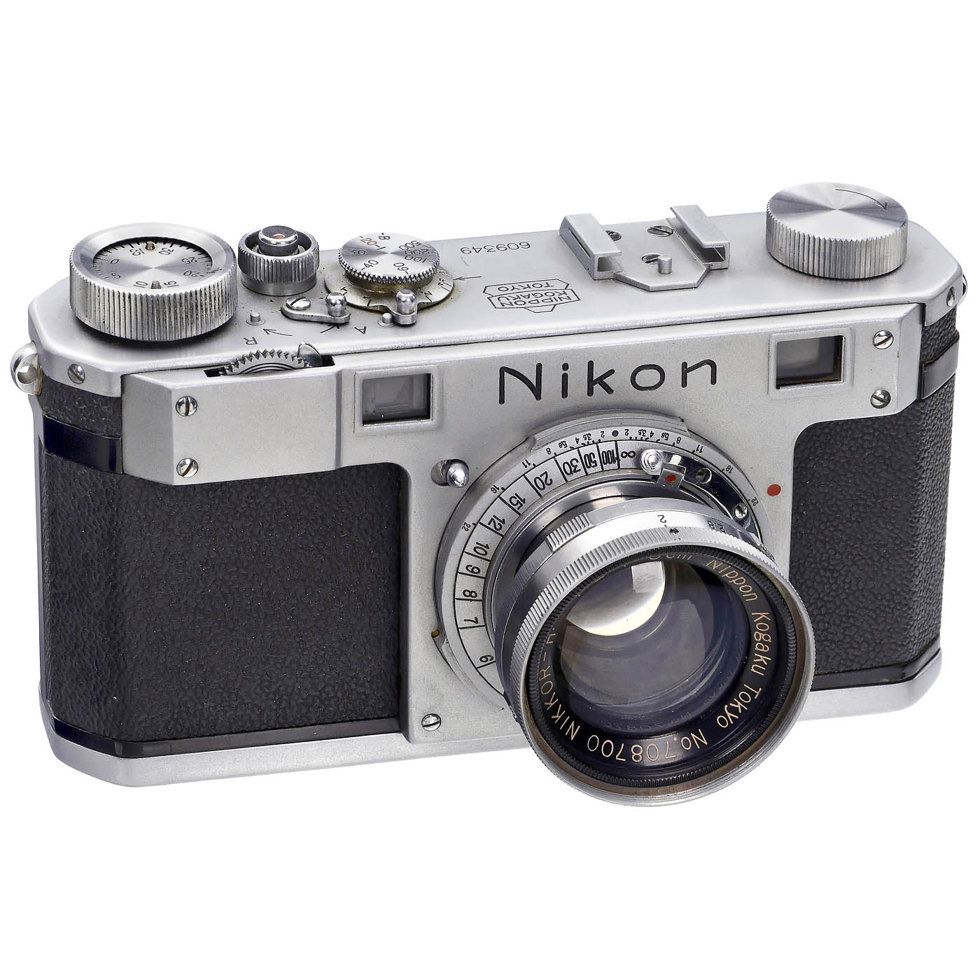 Nippon Kogaku, Japan. No. 609349, 24 x 32 mm film format, baseplate engraved "MADE IN OCCUPIED JAPAN", rangefinder working, with a retractable Nikkor-H.C 2/5 cm lens no. 708700. - Note: The Nikon I was the first mass-produced Nikon rangefinder camera. Save some light dents to the leather on the back, this example is in good cosmetic condition. The cloth shutter is inaccurate or sticks. The retractable lens, produced at around the same time as the camera, is also in good condition. The optics are clean when inspected under a point light; there is a minor defect in the putty (or possibly fungus) on the edge of the rear element.