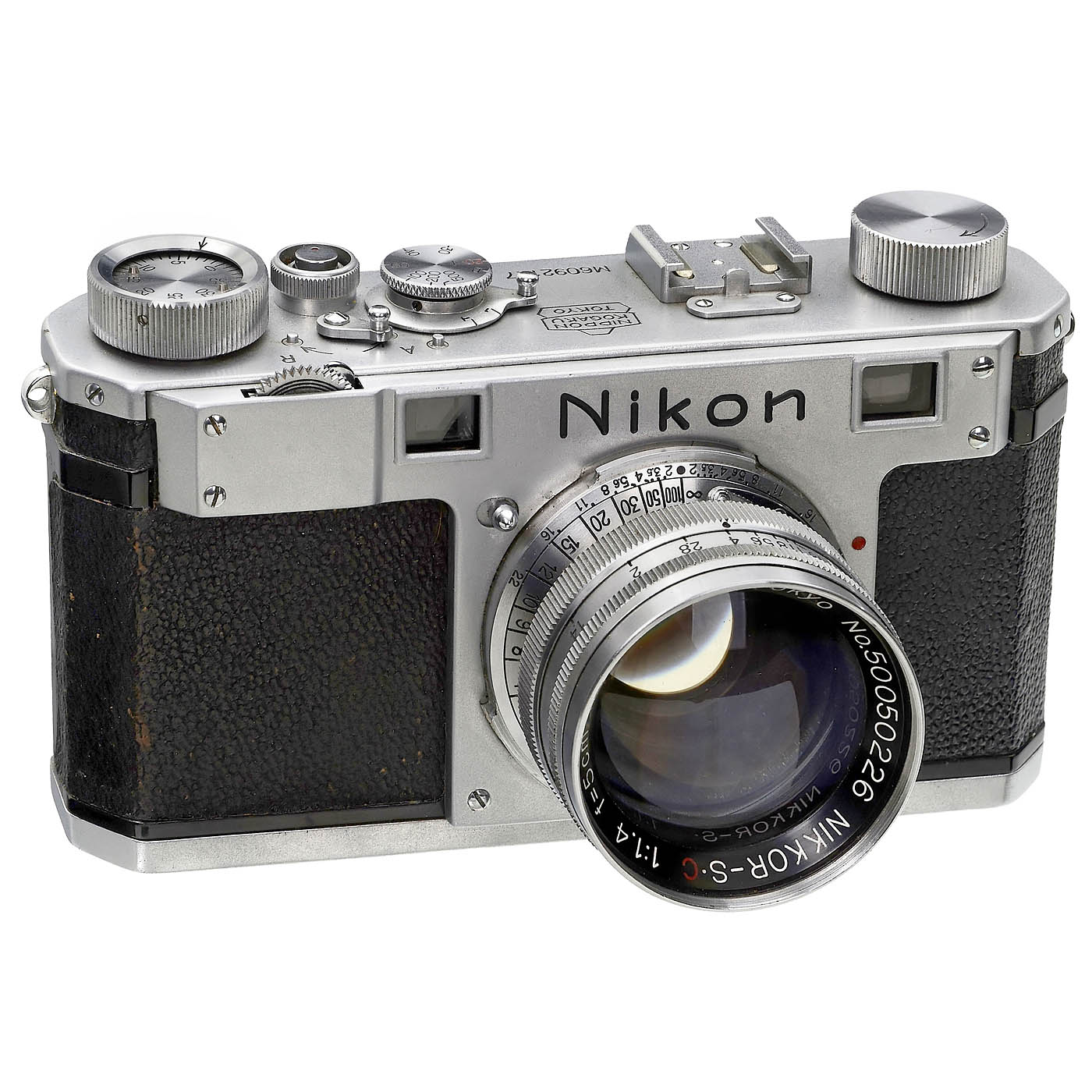 Nippon Kogaku, Japan. No. M6092127, 24 x 32 mm, without flash contact, with Nikkor-S.C 1.4/5 cm lens no. 50050226, "Tokyo" engraving, rangefinder not working, leather on back with some wear, slow shutter speeds stuck, lens well-preserved, glass clean under point light.