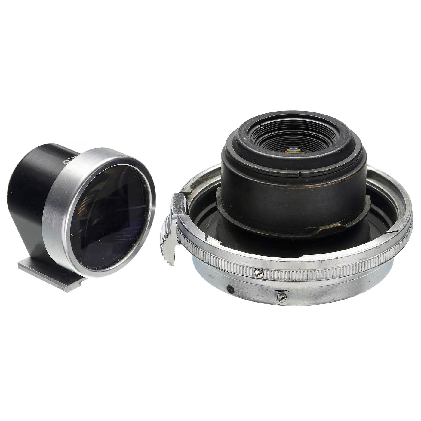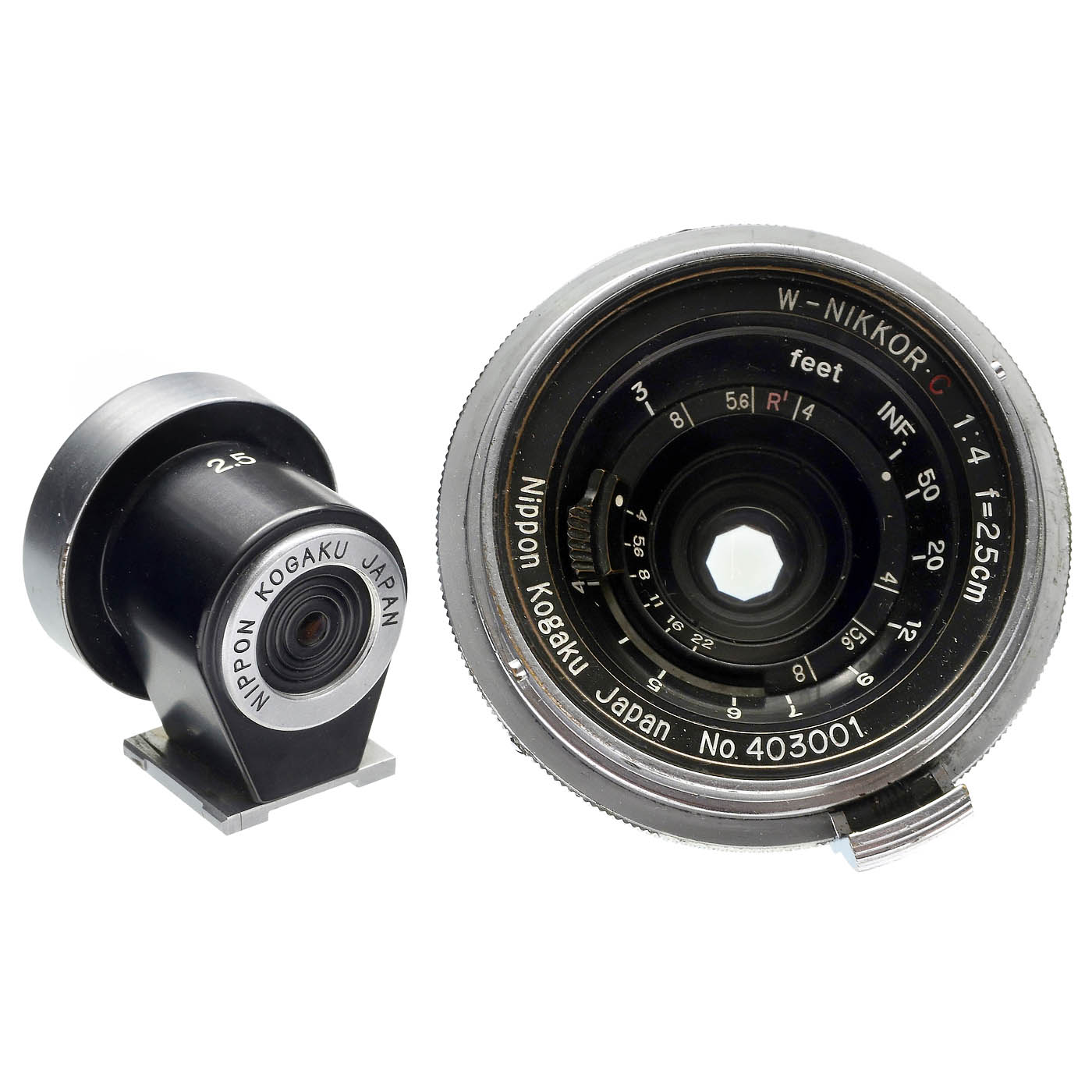 Nippon Kogaku, Japan. 1) W-Nikkor C 4/2.5 cm no. 403001, chrome-plated, usual cleaning marks on the front element, optics good inside under point light, otherwise relatively good condition. (3/3-) - And: 2) Nikon 2.5 cm viewfinder in mint condition. (2/2) - One of the most sought-after wide-angle lenses for the Nikon rangefinder camera.