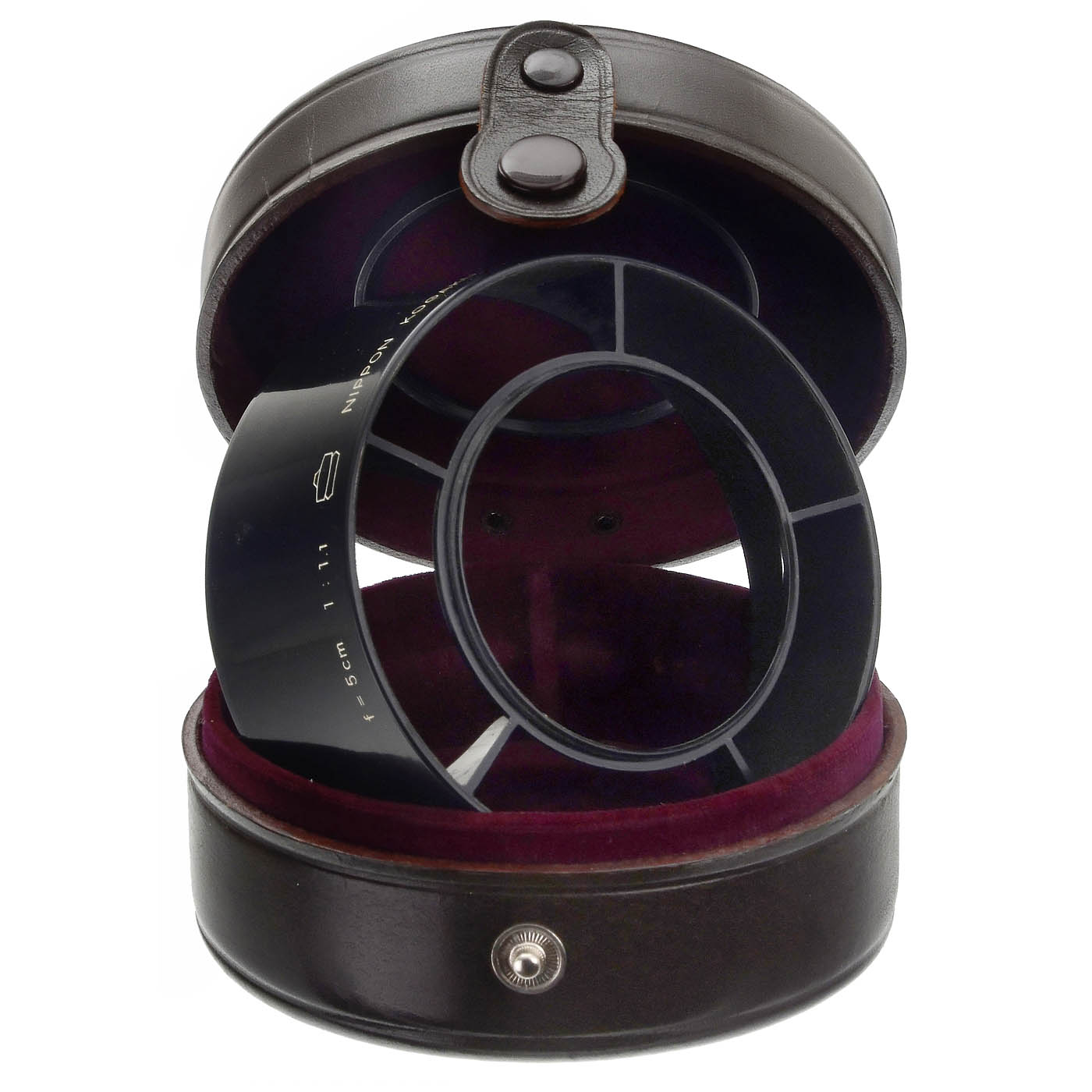 Nippon Kogaku, Japan. No. 119985, first version with internal bayonet, extremely rare plastic lens hood and a special leather case for this lens hood, optics clean under point light, near-mint condition. - Note: The aperture has been removed, presumably at the customer's request, so that for safety reasons the aperture can only be used at its maximum setting under all circumstances.