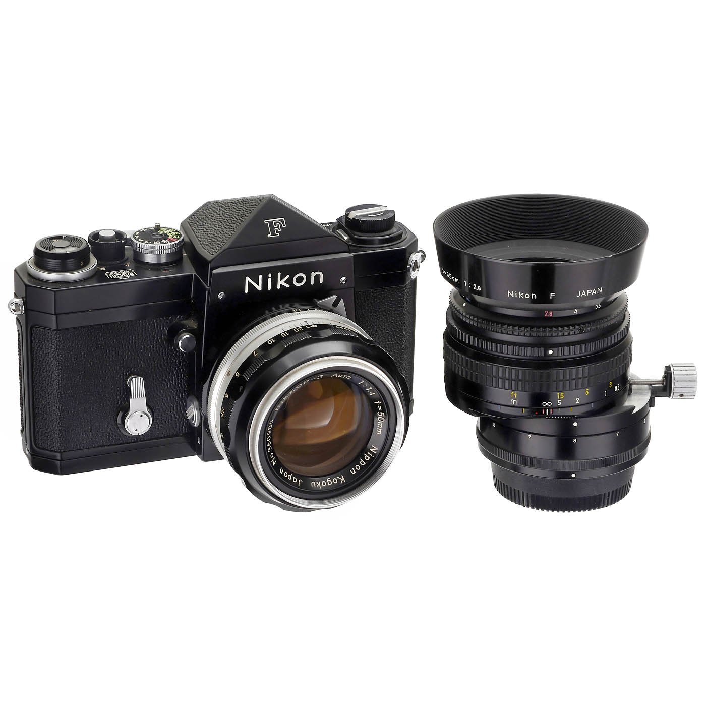 Nippon Kogaku, Japan. 1) Nikon F, no. 6755717, black housing is in excellent condition, baseplate with signs of wear. The prism viewfinder with rectangular viewfinder eyepiece is a sought-after component. (3+/3+) - 2) PC-Nikkor 2.8/35 mm, no. 900808, shift lens with metal 2.8/3.5 cm lens hood and back and front caps, unusually good condition, optics clean under point light. (2-/2) - And: 3) Nikkor-S 1.4/50 mm no. 360985, early example still with "Nippon Kogaku" designation, triangular aperture holder and feet scale, optics clean under point light with only faint traces of cleaning marks on the rear element. (3/3)