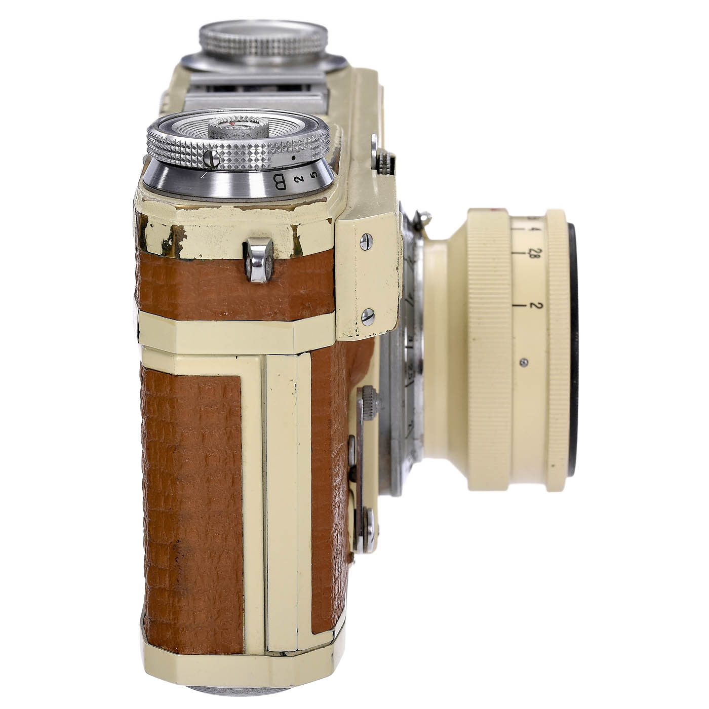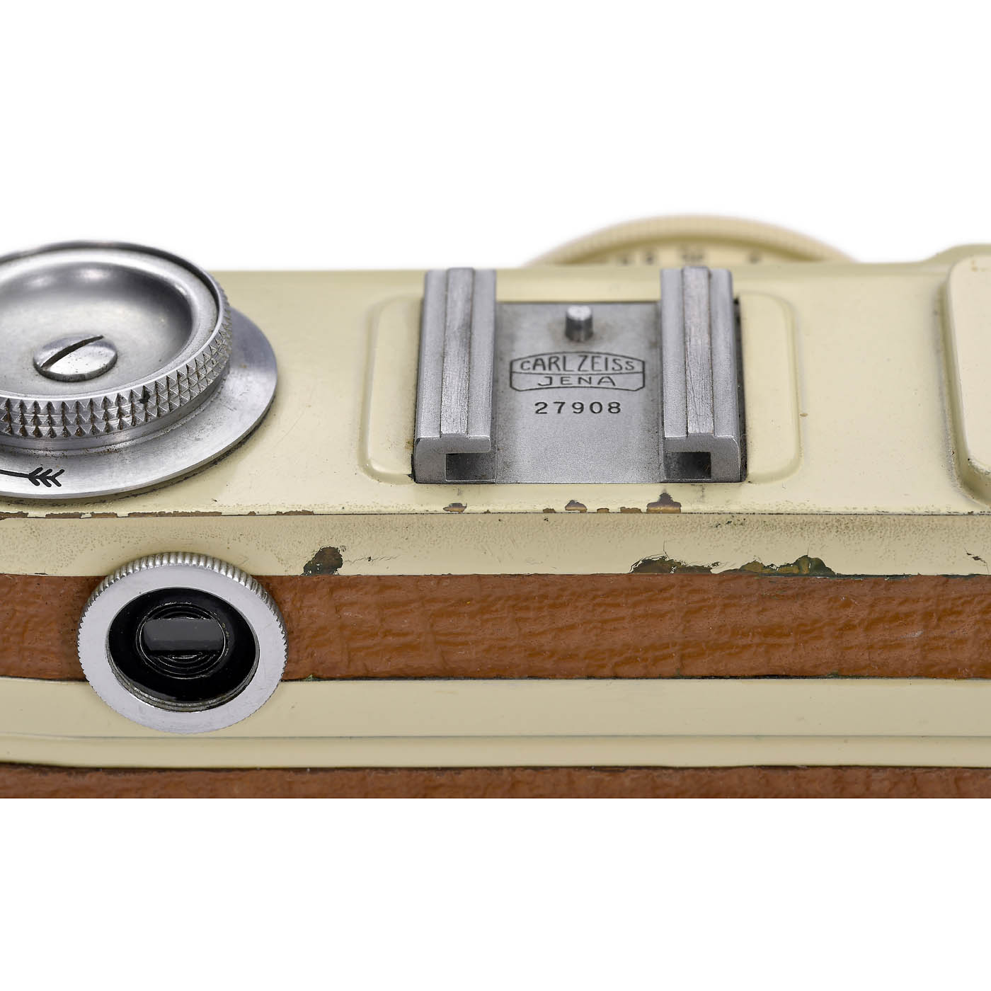 Carl Zeiss, Jena. Contax II no. 27908, with Carl Zeiss Jena Sonnar 2/5 cm T no. 3104703, full working condition, including the self-timer, filter thread with dent, synchronized on the front post 1947. - Note: From recorded Contax ivory-colored cameras (nos. 27917/3107140, 27927/3104794, 27949/3104753, 27960/3104785, 27965/3104755 and 279??/3104774 from the Kuc book), this example bears the earliest number in terms of both the camera and the lenses. The paint (probably intended for medical tools) displays scattered imperfections and a slight wrinkling, a typical feature of the freshly opened paint not being thoroughly stirred and/or the non-chrome-plated (!) brass housing caps not being degreased. With the material shortages of the post-war period, a camera was not so quickly reclassified as sub-quality, thus this first paint sample prototype may have been amongst the first of the Contax ivory-colored camera to have been put into test operation.