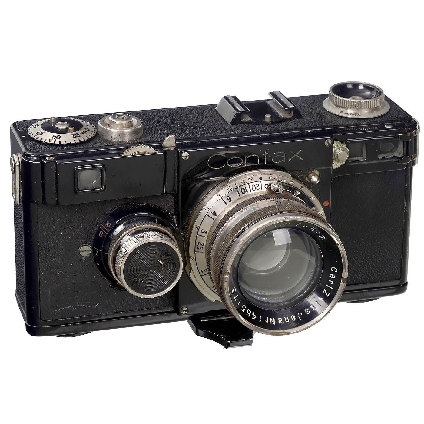 Zeiss Ikon, Dresden. 1) Contax I, sixth version, no. Y.28923, shutter working, rangefinder with minor defects, very good condition, with case. (2-/3+) - And: 2) Sonnar 2/5 cm, no. 1455173, nickel-plated version, optics good under point light. (3-/3)