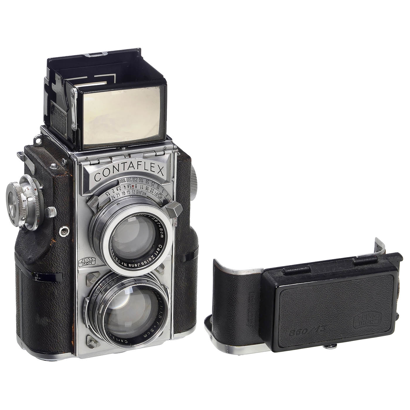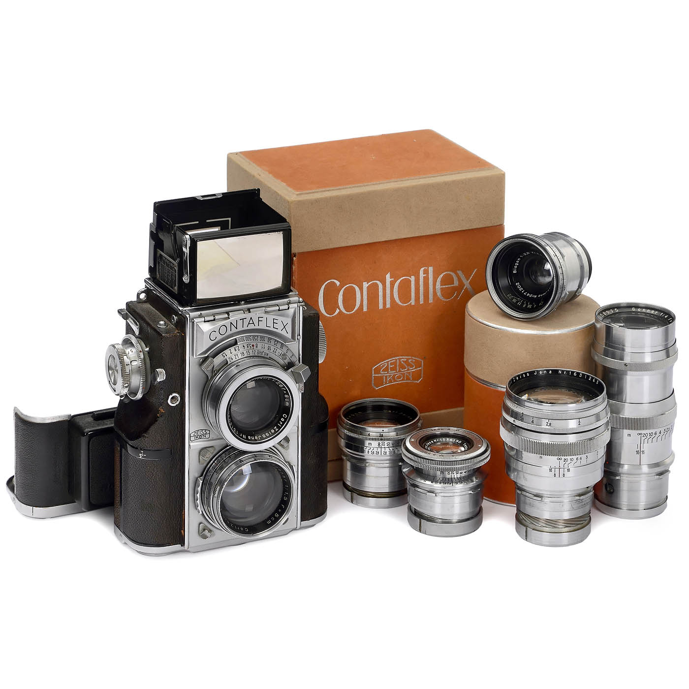 Zeiss Ikon, Dresden. Contaflex no. Y.84734, with "Zeiss Ikon" engraving on the front, well-preserved Albada viewfinder, plate back, inserted single cassette and original presentation box, shutter working, release lever has to be moved back into position by hand. Included are the following lenses: Tessar 2.8/5 cm no. 1534190, Sonnar 2/5 cm no. 2211415, Sonnar 1.5/5 cm no. 1628457, Biogon 2.8/3.5 cm no. 2471202 (rear element scratch-free, minor dent on the collar), Sonnar 2/8.5 cm no. 1631263 with original box and Sonnar 4/13.5 cm no. 1758975, all elements clean. - Note: The Sonnar 2/85 must be attached with great care due to the constructive utilization of all tolerances; the same applies much more to the Biogon 2.8/3.5 cm - perhaps one reason why these two lenses are rarely found. It would take a lifetime of collecting to assemble the equipment offered here. - A milestone in camera history.