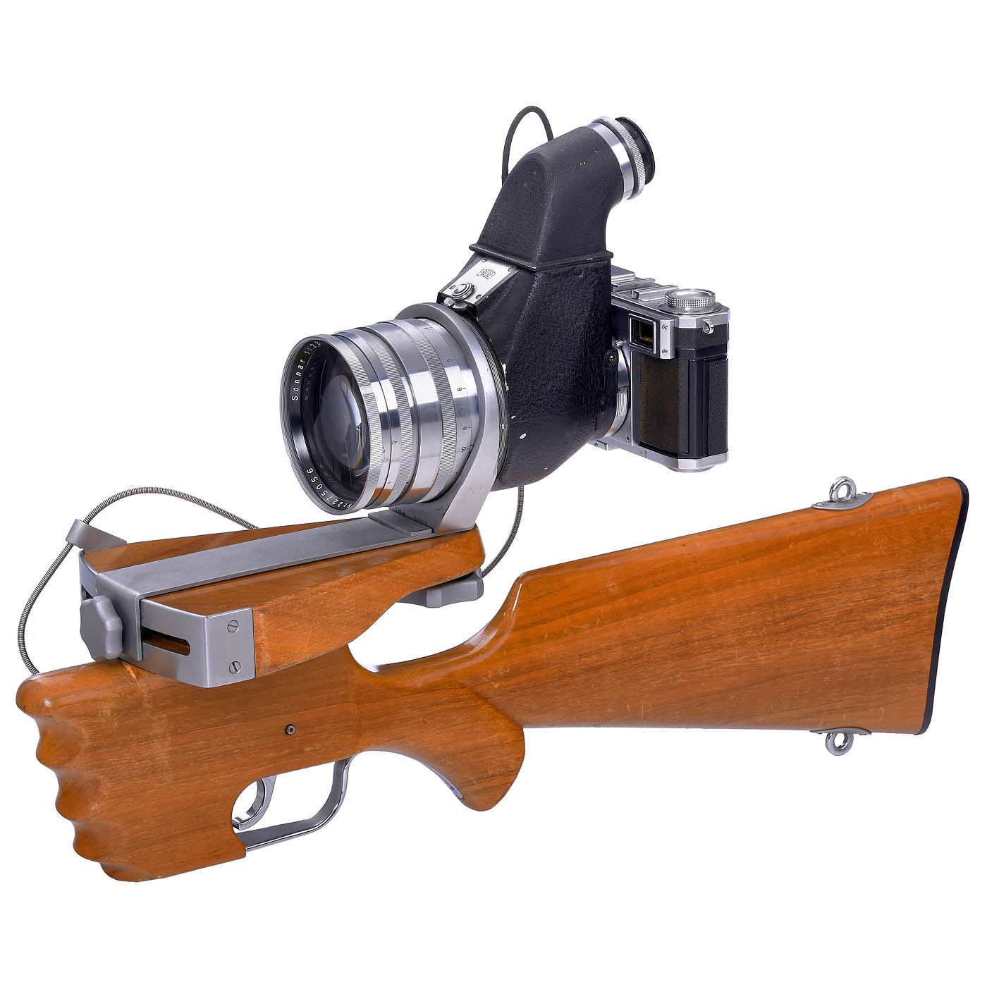 Zeiss Ikon, Dresden. Comprising rifle stock 543/75, reflex housing 543/78 W.2002 with Carl Zeiss Jena Sonnar 2.8/18 cm lens no. 2275056 (engraved on the front of the reflex attachment "18 cm 21119816") and reflex housing 543/78 W.2339 with Carl Zeiss Jena Fernobjektiv 8/50 cm lens no. 2348827 (no additional engraving on the front of the reflex attachment), Contax II no. G12492 and connecting cables, both lenses show some interior deposits (removable) under point light. - Literature: Kuc, "Auf den Spuren der Contax", Vol. I, pp. 201-205. - One of the rarest accessories for the Contax II, according to Kuc a maximum of five examples are known. The use of the Contax rifle was prohibited during World War II.