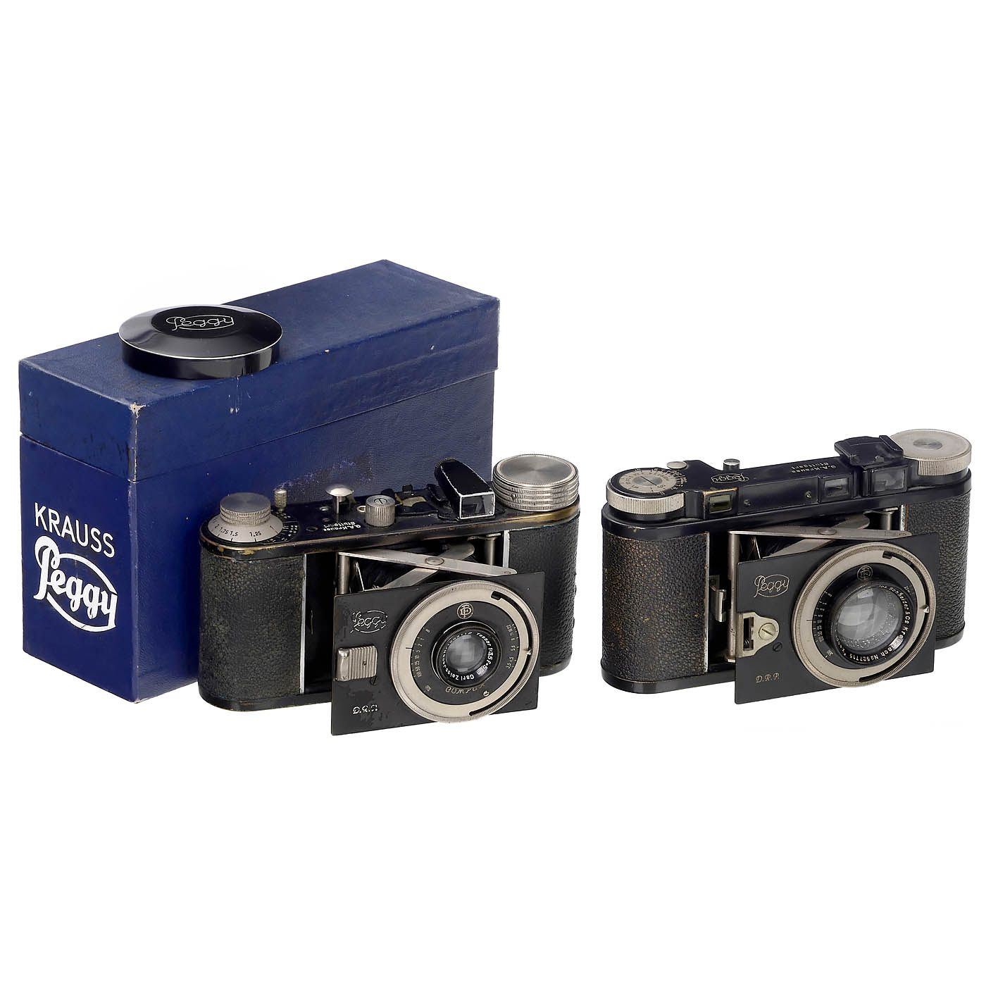 Krauss, Stuttgart. 1) Peggy II No. C 141/3, 35mm strut-camera, with Schneider Xenon 2/4.5 cm lens No. 527715, two cassettes, large cap, case and original box, rangefinder working, shutter opens but does close, otherwise good condition. (3+/3) - And: 2) Peggy I, No. E211/2, with single cassette, Zeiss Tessar 3.5/5 cm lens No. 1293112, large cap and an unusual design whereby the shutter is set by closing the camera and the shutter release is located at the back of the camera. (3-4/3)