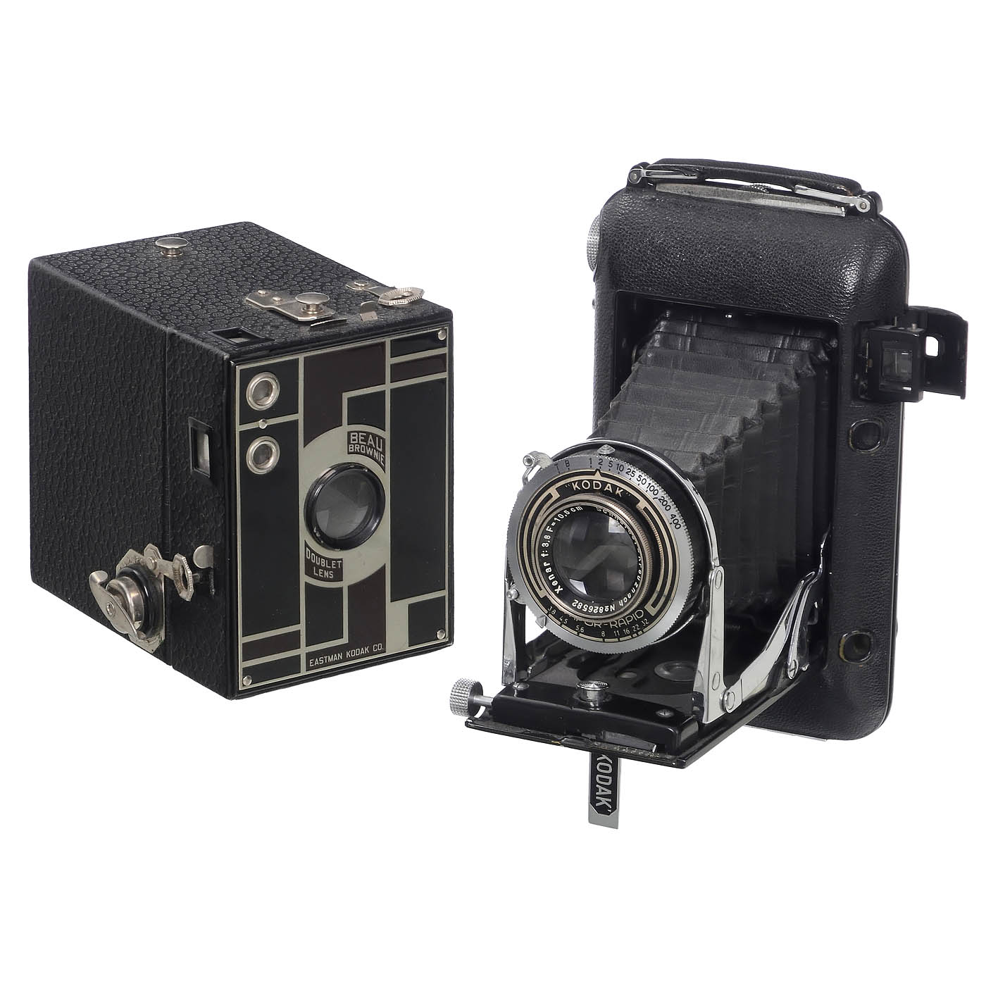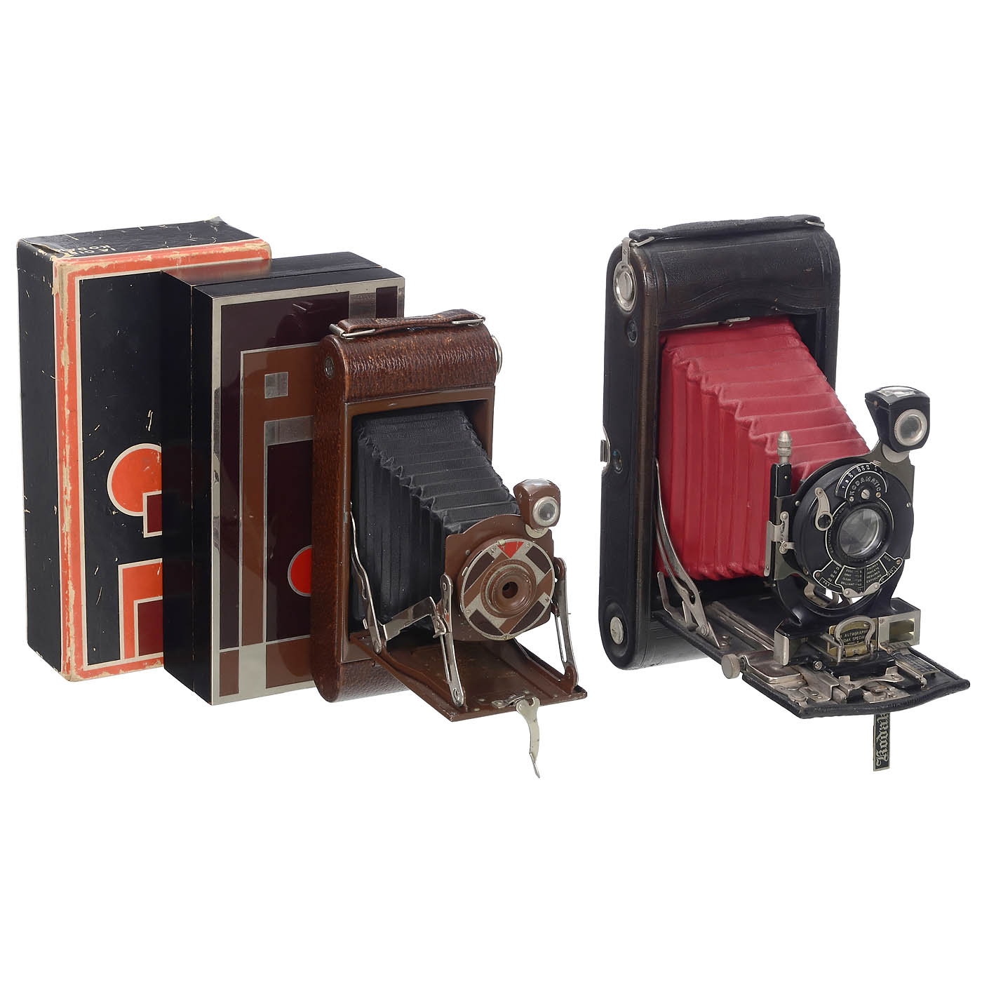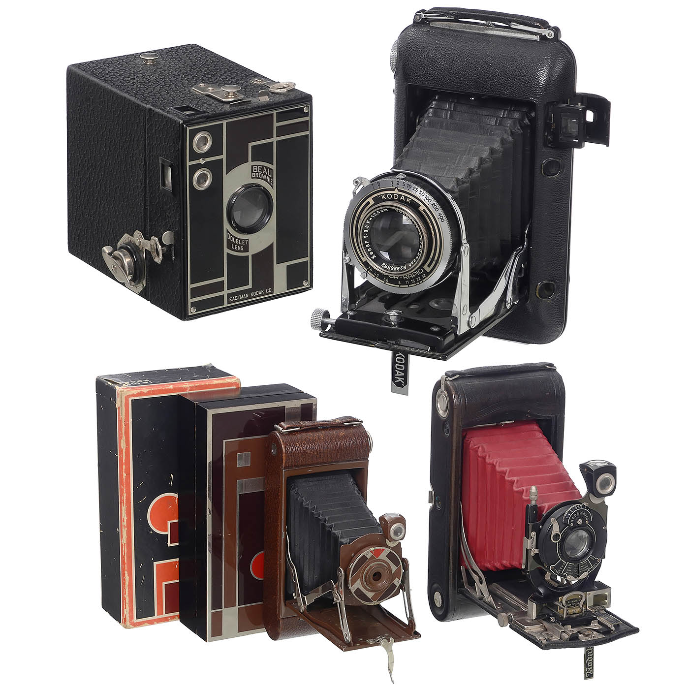 Eastman Kodak, USA. 1) No. 1A Gift Kodak, 6.5 x 11 cm on 116-rollfilm, brown leather with nickel-plated fittings, black bellows and well-preserved original cedar box with Art-Deco front panel and original box. Rare and very popular collector's item. - 2) 3A Autographic Kodak Special Model B, first camera with a standard built-in and coupled rangefinder, film type A 122, 3 1/4 x 5 1/2 in., Anastigmat 6.3/170 mm lens, Kodamatic shutter working. Rare Kodak, a milestone of camera technology. (3/3) - 3) No. 2 Beau Brownie, brown/black. (3/3) - And: 4) Kodak AG, Stuttgart. Regent, streamlined camera of unusual design, no. 740622, for 620-rollfilm, 6 x 9 and 4.5 x 6 cm, with original insert masks, with bright Xenar 3.8/10.5 cm in Compur-Rapid shutter, working, rangefinder defective, otherwise in good condition. (2-/3-)