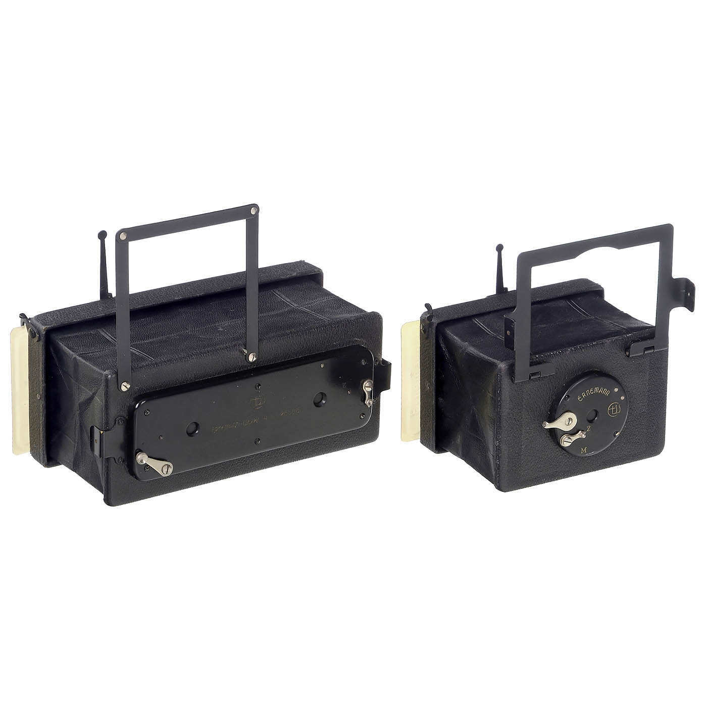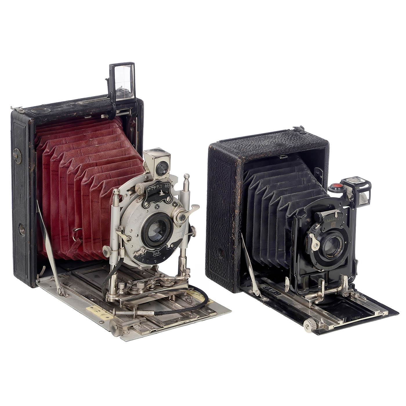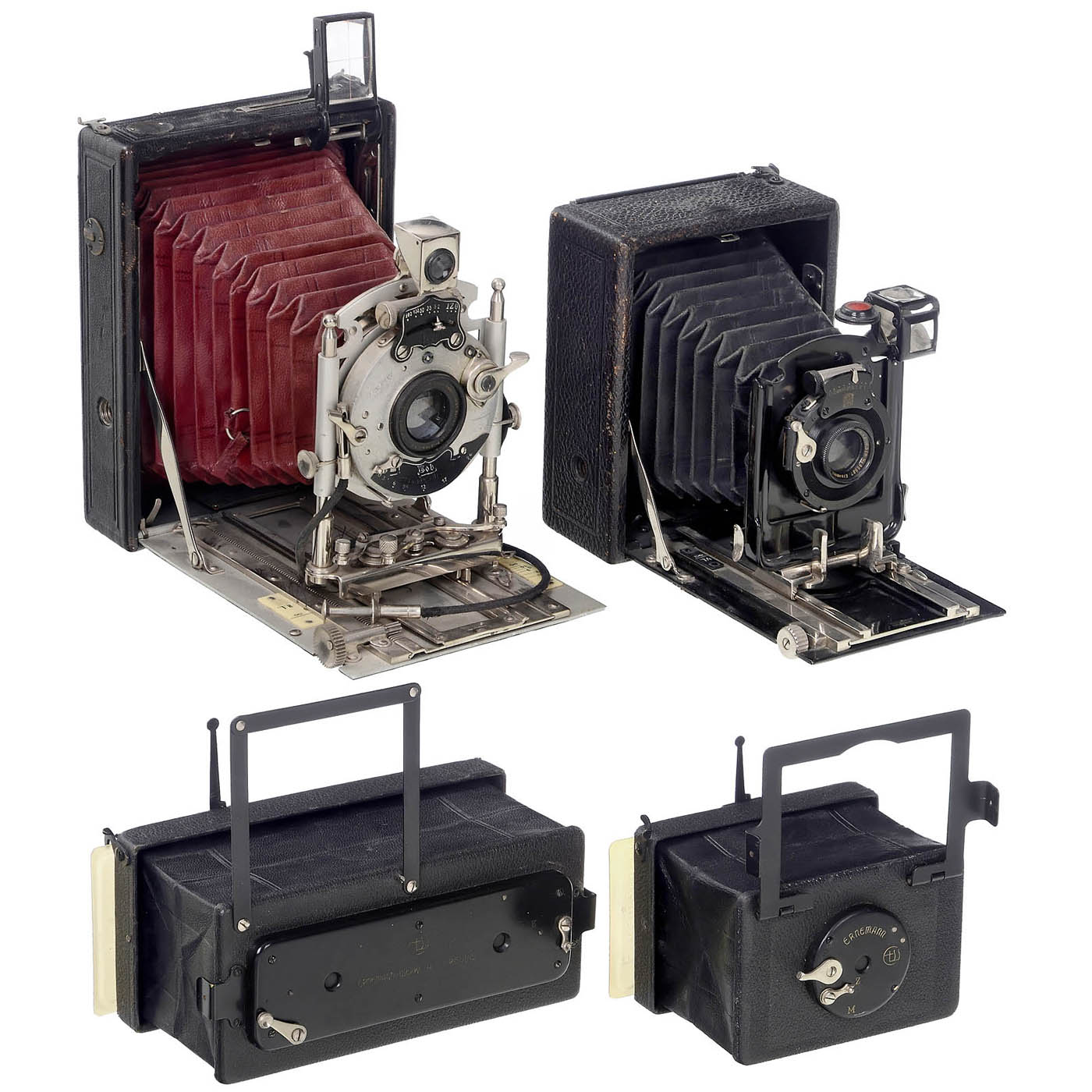 Ernemann, Dresden. 1) Rare Liliput Stereo, 45 x 107 mm, with celluloid focusing screen back, near-mint. (2/3) - 2) Liliput, 4.5 x 6 cm, with celluloid focusing screen back, original box and instructions in Spanish, near-mint. (2/3) - 3) Folding camera, 9 x 12 cm, red bellows, with Goerz Berlin Dagor 6.8/120 mm lens, Bob shutter and focusing screen back, shutter working accurately. (3/3) - And: 4) Heag II Serie II, 6.5 x 9 cm, Ernon 6.8/10.5 cm, shutter slow. (2-3/3)