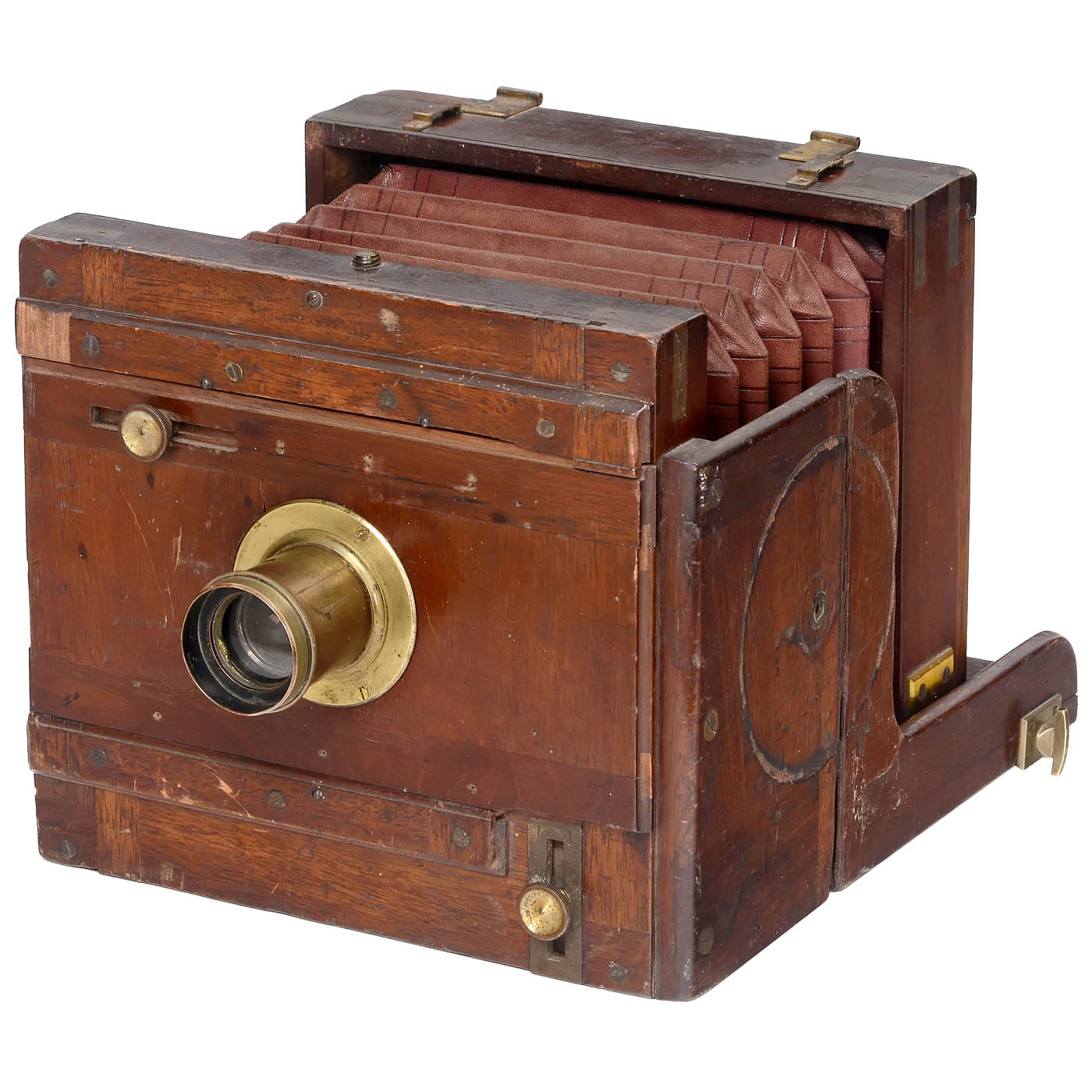 Unmarked, probably England, for 13 x 18 cm, with light-brown bellows, brass fittings, Suter Basel Aplanat (set lens) of approx. 9/21 cm, iris diaphragm, rear element in bayonet mount, focusing screen and double cassette intended for 13.4 x 18.2 cm instead of 13 x 18 cm format plates, camera length 28 cm, missing wood sections on front, a very worn camera with the patina of an active life. - Note: The interior 14 x 7.5 cm opening of the camera (intended for stereo) was reduced to 7 x 7.5 cm by the addition of removable slats/dividers.