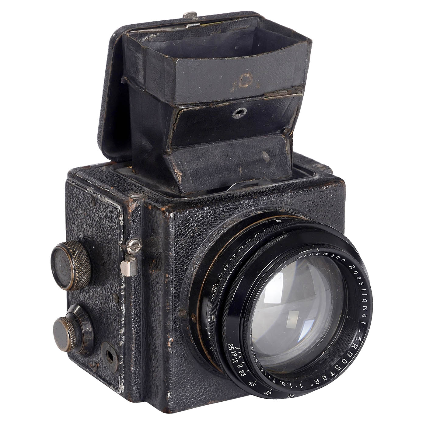 Ernemann, Dresden. No. 1297429, 4.5 x 6 cm, with focusing screen back, smooth focusing up to 8 m, and an Ernemann Anastigmat Ernostar 1.8/10.5 cm lens no. 179691, glass good (displaying minimal deposit but no cleaning or scratch marks under point light), focal plane shutter sticks, mirror image good, O-Z-M lever is missing, heavy wear to case. Very rare and sought-after Ernemann camera.