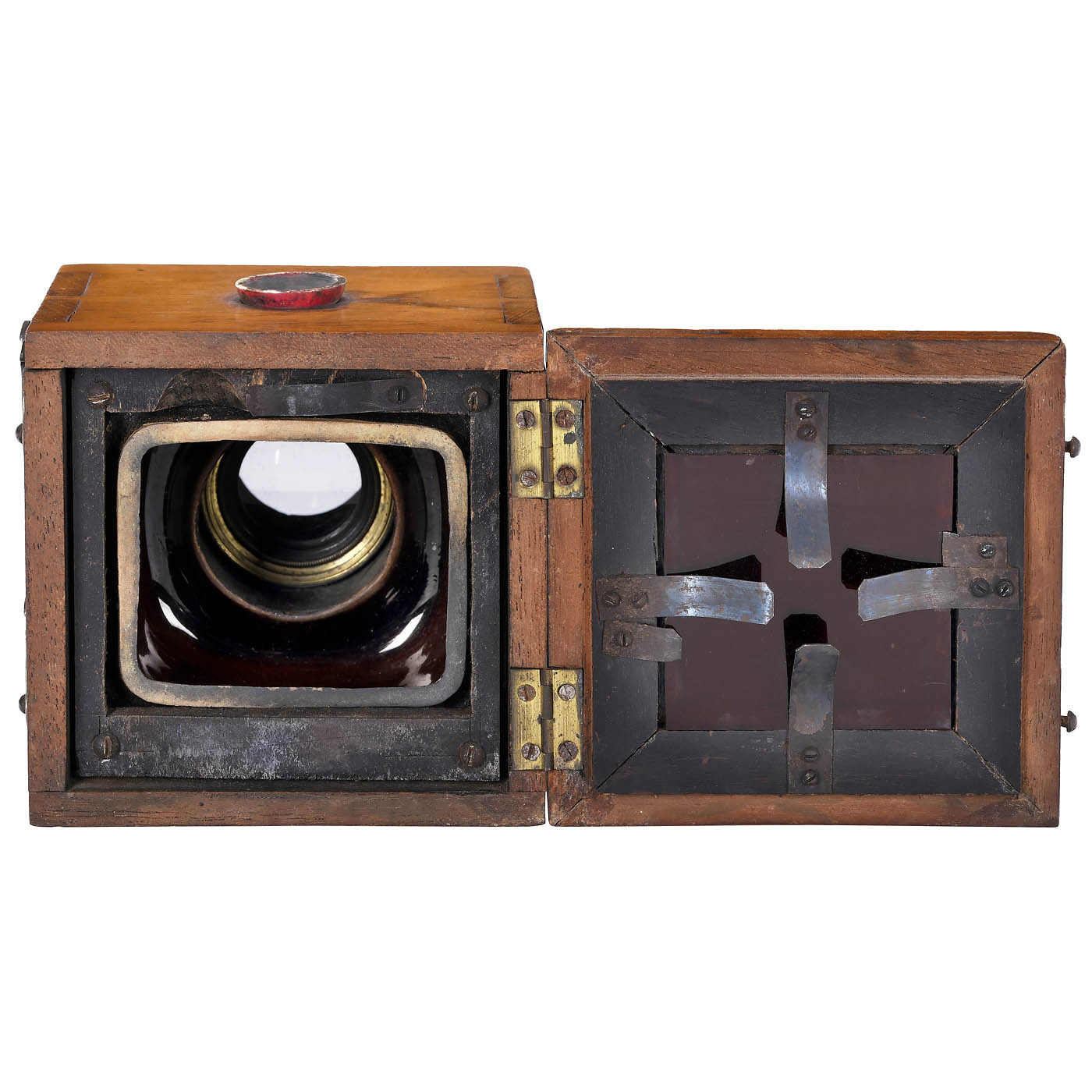 Marked "Appareil Dubroni, Breveté S.G.D.G., à Paris, 9, rue Auber", for 4 x 6 cm rectangular exposures, with partly enclosed dark-brown glass bottle, lens marked "Dubroni à Paris" and original brass lens cap for the exposure. - The first commercial instant camera.