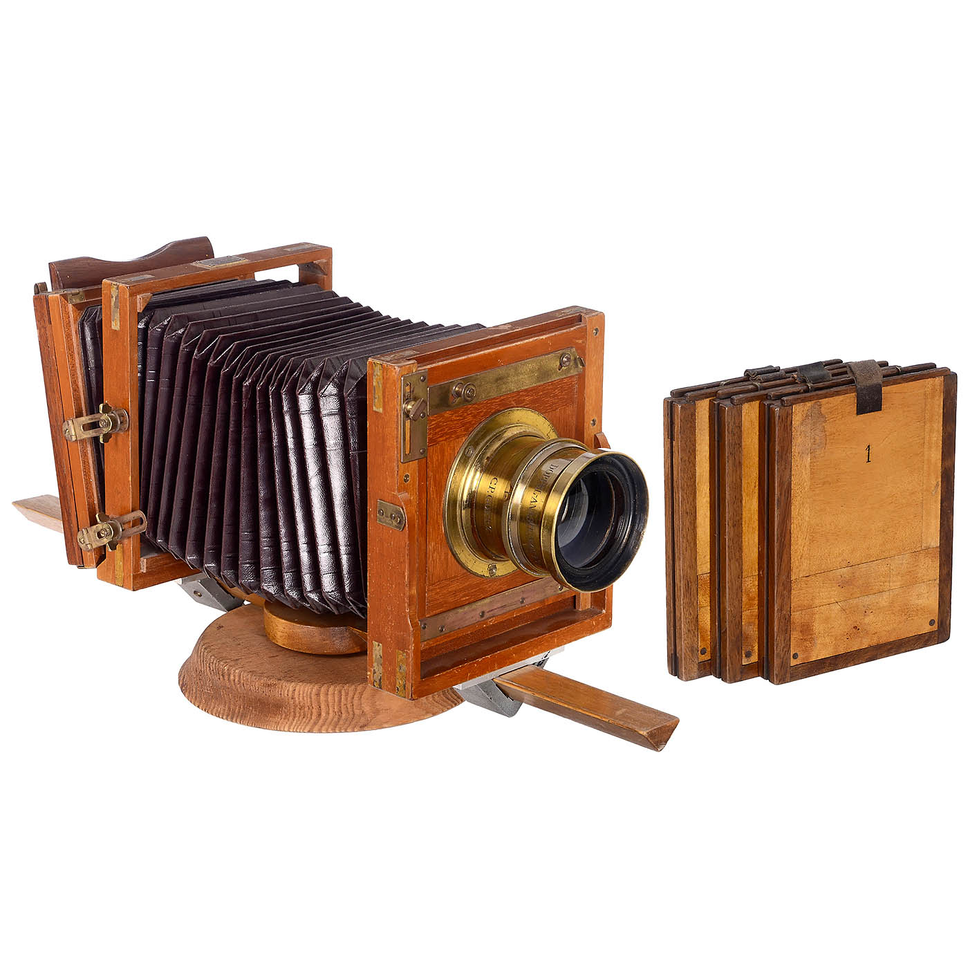 Stegemann, Berlin. 9 x 12 cm, delicate studio camera on an optical bench, hardwood body with brass fittings, dark-brown bellows, swing-back focusing screen back (possibly for the American market), original long focal length brass-bound Goerz Berlin Doppel-Anastigmat 7.7/360 mm lens on board, three wood double cassettes and a later support-foot, glass under light beam clean. - Note: One of the first professional optical bench cameras with the professional optics of its era.