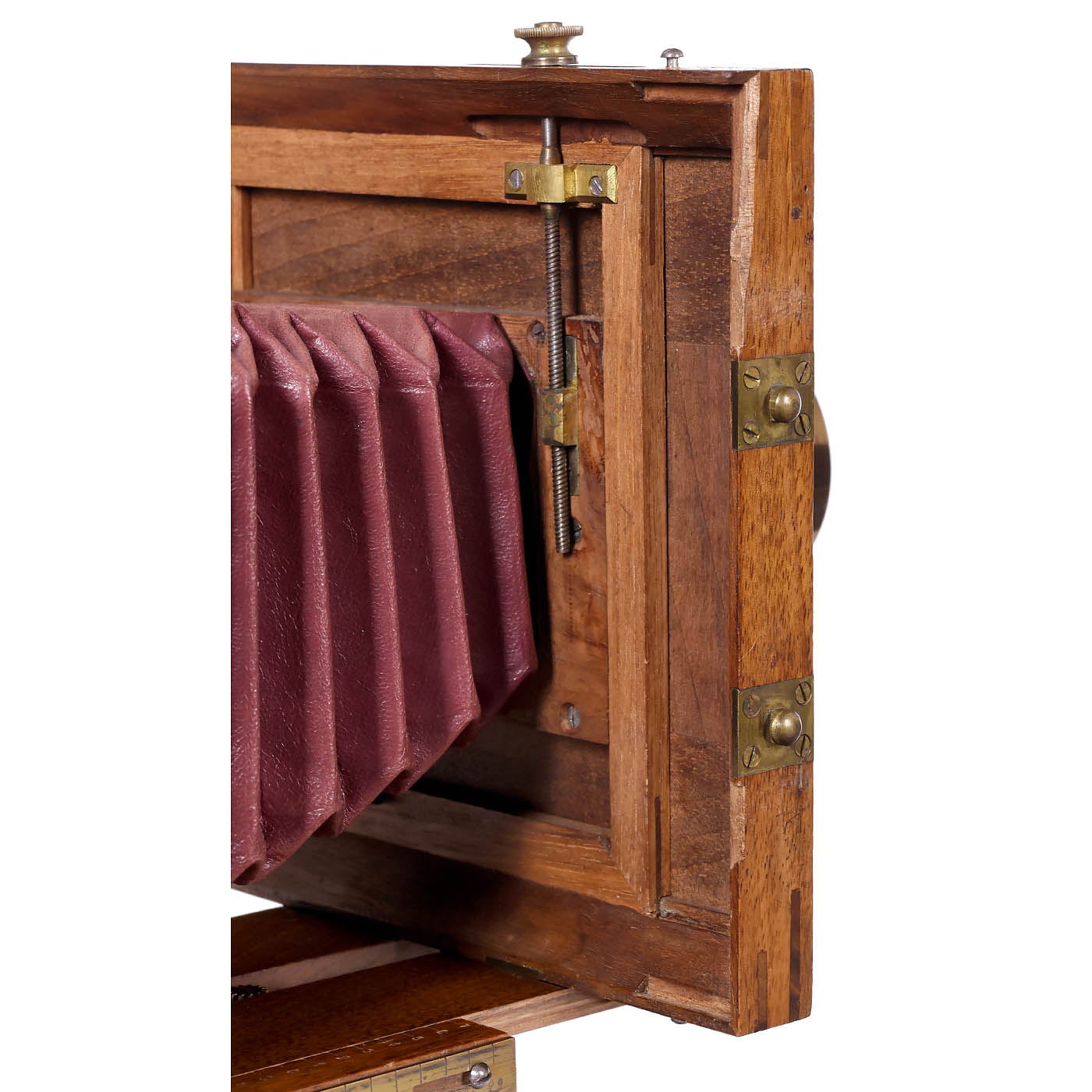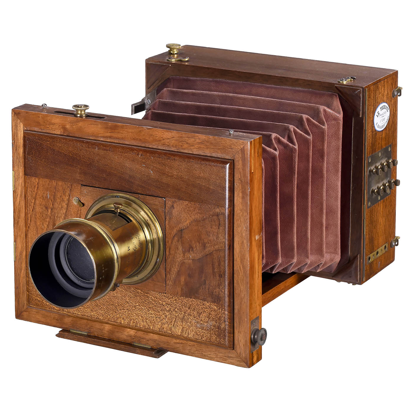E. Enjalbert, Paris. No. 399, plate size 13 x 18 cm, walnut body with brass fittings and brass lens with iris diaphragm, convertible from portrait to landscape format, conical wine-red bellows, pull-out changing magazine for 8 plates (some with reducing inserts), inside with separate pull-out pin and ground-glass back (matte glass as well as a small section of wood on standard missing). - Rare dry plate camera with unusual magazine plate-changing system. - Literature: McKeown's 2005/06, p. 265.