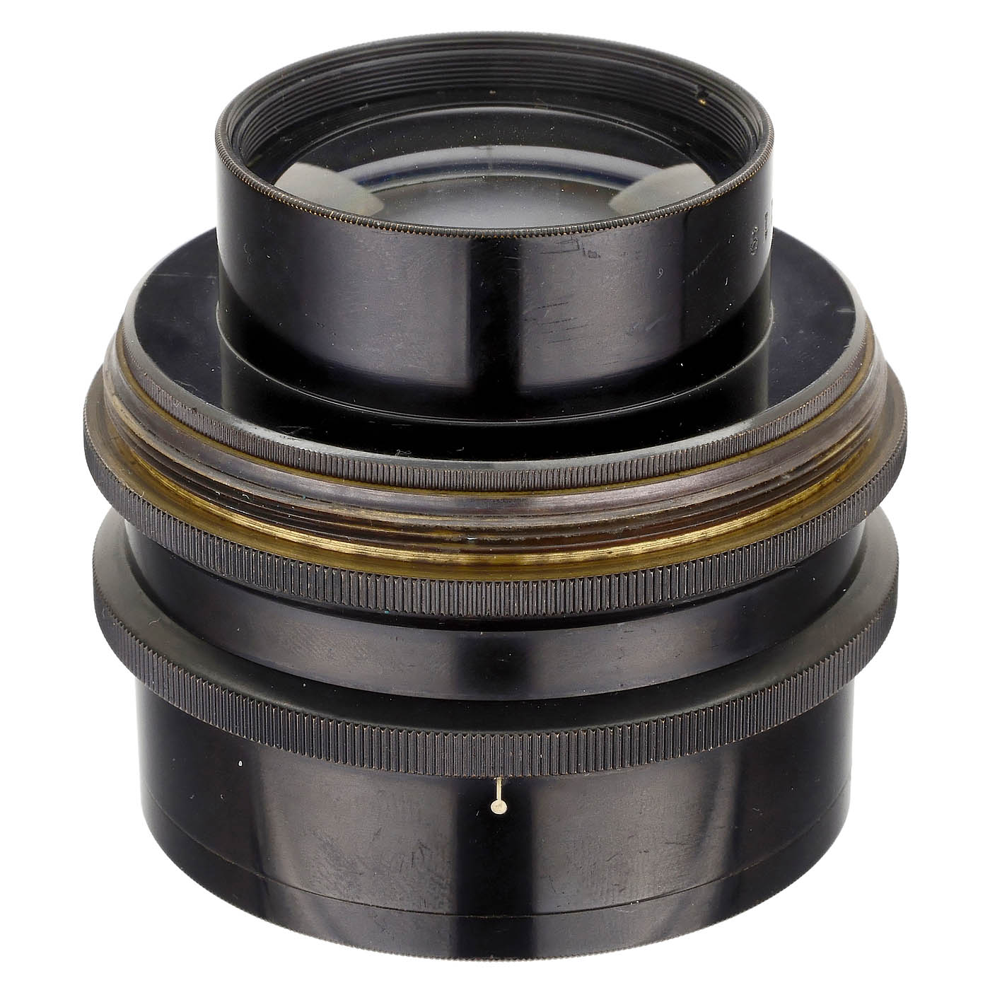 Carl Zeiss Jena. No. 625119, in Zeiss VII mount (with the standard tube height of 35 mm), with original unengraved iris diaphragm, unused, optics clean when viewed under point light, all lens elements can be unscrewed. - Note: The lens has eight spaced transitions. At the front is a single lens of 44 mm diameter close to the iris diaphragm; behind it in the rear section in an unthreaded tube of 42 mm diameter are two thin individual lenses with spacer; behind these is a thick triple-lens cemented lens block with an end surface of 38 mm diameter, held in placed by a single thread. Image illumination is well over 85 mm diameter at open stop and infinity. In a test with the lens mounted plane-parallel on a 6 x 6 SLR, the image appeared well illuminated, without field curvature and noticeable reflections when viewed on the screen without a magnifying glass in the focus range. When tested with a strong magnifying glass inspection and test samples, this resulted in a professionally usable image circle of approximately 50 mm diameter, increasing when dimmed. - An early forerunner and possible competitor with the lens designs by Ludwig Bertele, the 4.5 x 6 cm format may also have been considered here, however the Ermanox lens won the race. The global success of the Sonnar under the later aegis of Zeiss may also have played its role. The inconspicuous, standard-looking engraving is typical for several of the test lenses and prototypes by Zeiss. Literature: Erhard Bertele, "Ludwig J. Bertele, a Pioneer of Geometric Optics", 2019, p. 56: "Even apart from its inherent reflections, the Merté lens produced a very attractive image."