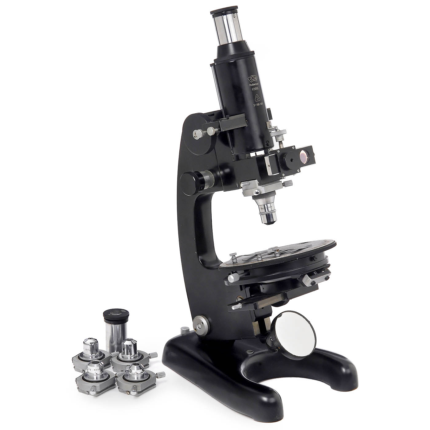 ROW Rathenau. No. 82058, black paint, coarse and fine adjustment with knurled screws on the right and left, tilting stand, circular cross table with 360˚ graduation, height-adjustable iris diaphragm, double mirror, height 13 ¾ in., with illumination unit and 5 objectives in matching wood case.