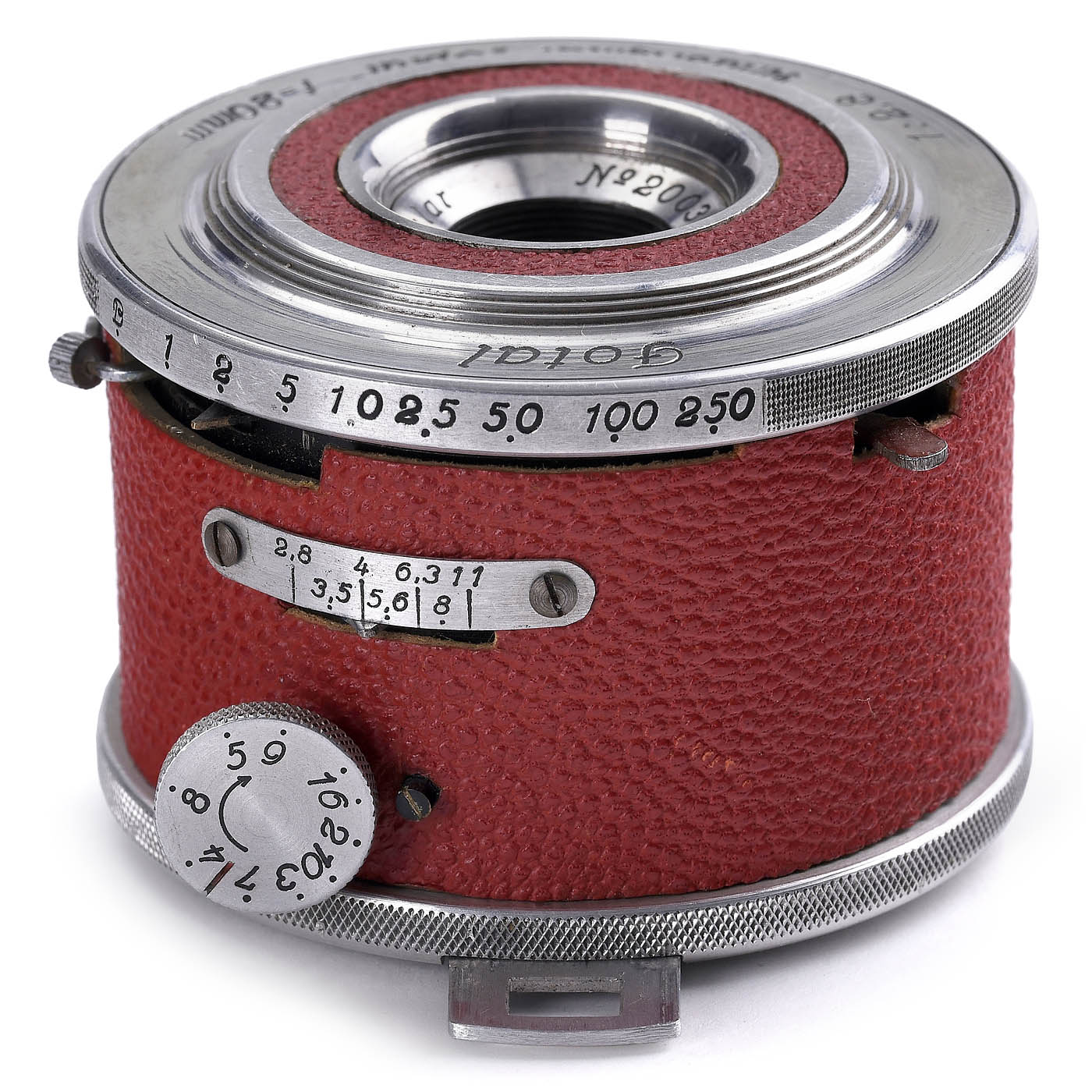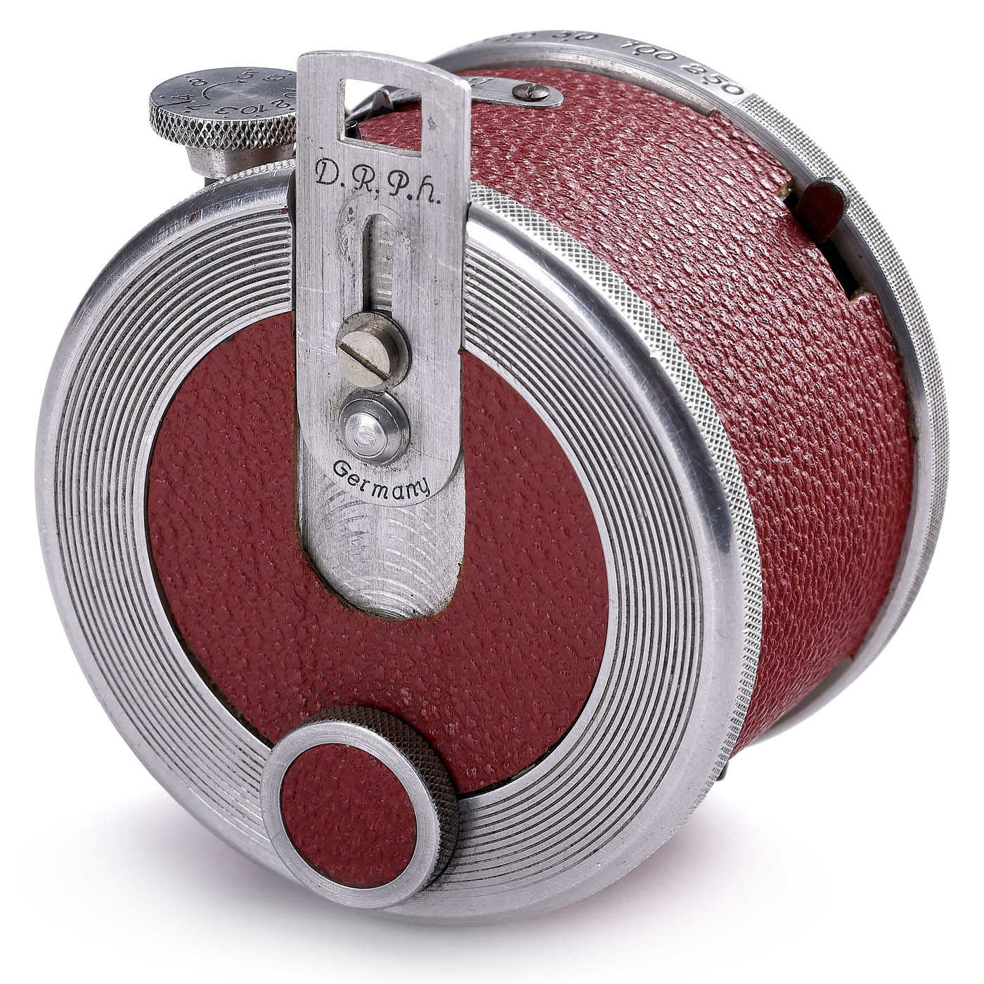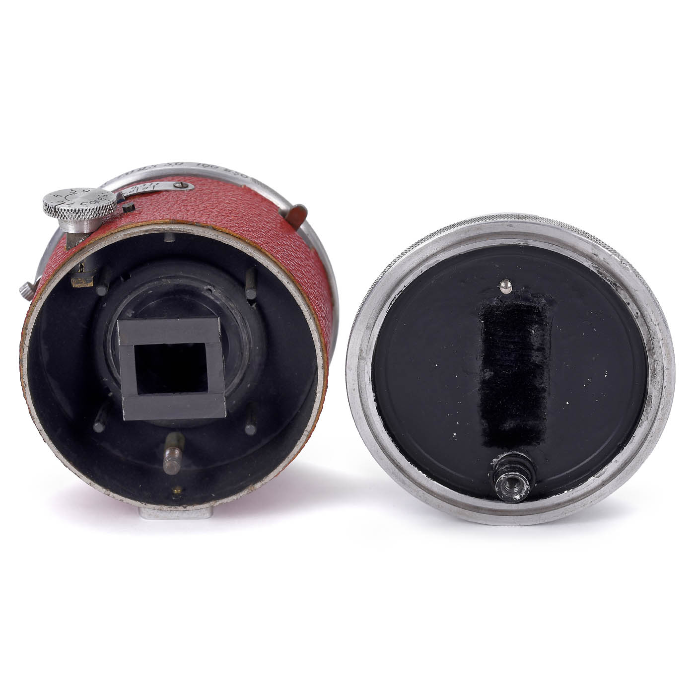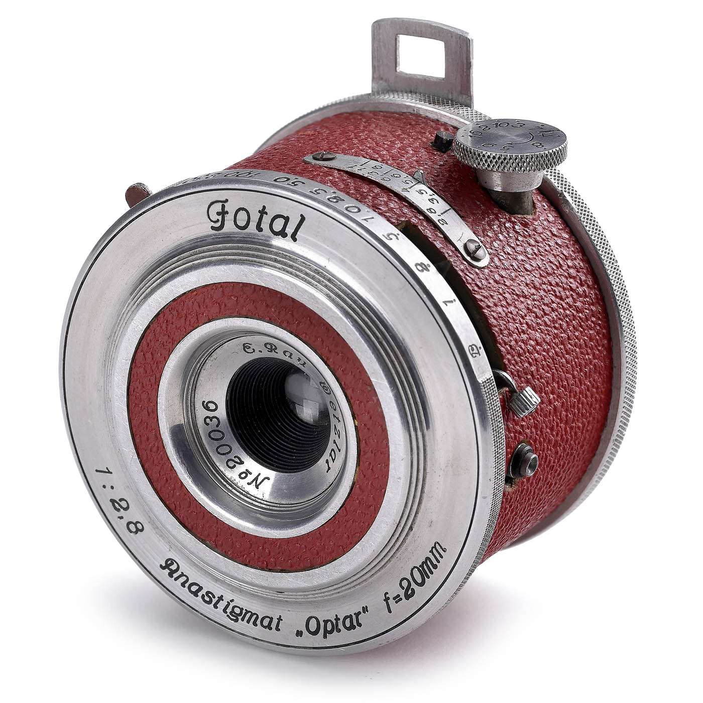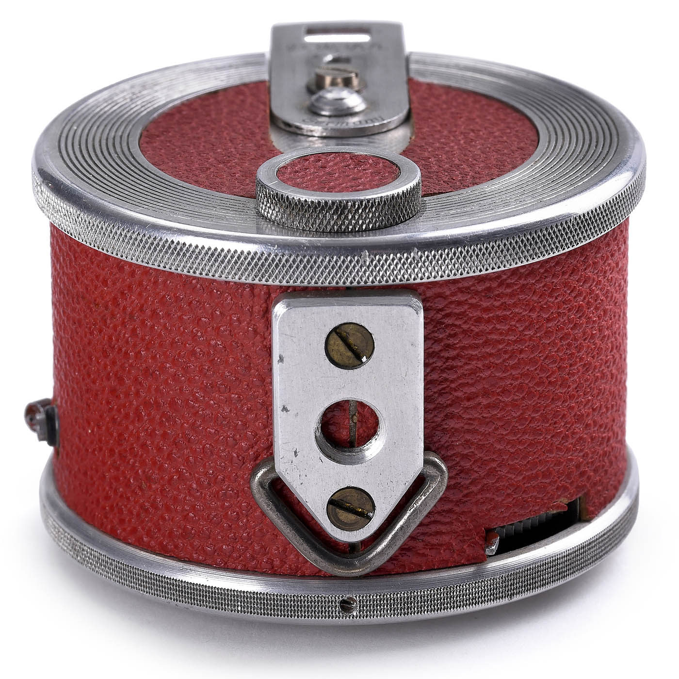 FFA Fabrik Fotografische Apparate, Lübeck, Germany. No. 20036, miniature circular camera faced in red leather, for pictures of 8.9 x 12 mm on special 16mm rollfilm, with E. Rau Wetzlar Anastigmat Optar 2.8/20 mm lens, shutter B, 1-1/250 with self-timer, counter for 10 exposures, and tripod socket with suspension for wearing around the neck, shutter working. - Note: Fewer than 100 examples of this camera were produced. Extremely rare and in very good condition.