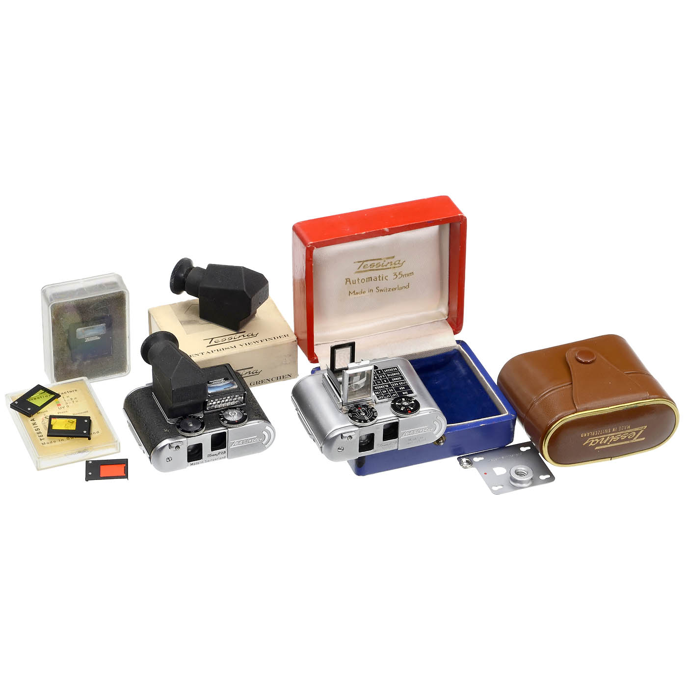 Concava S.A. Lugano, Switzerland. 1) Tessina no. 65153, two-lens precision camera for 14 x 21 mm on 35mm film, crackle-finish, spring mechanism, prism viewfinder and light meter, longer shutter times inaccurate or stuck. (3+/3-) - 2) Tessina L no. 778014, with presentation box, slow shutter speeds often sluggish, light shaft viewfinder jammed open. (3/3) - 3) Prism finder in original box. (3+/3) - 4) Tessina light meter, still working, with box and instructions. (3/3-) - 5) Clip-on filters in red, yellow and green (with crack) in box. - 6) Tripod adapter. - And: 7) Leather case.