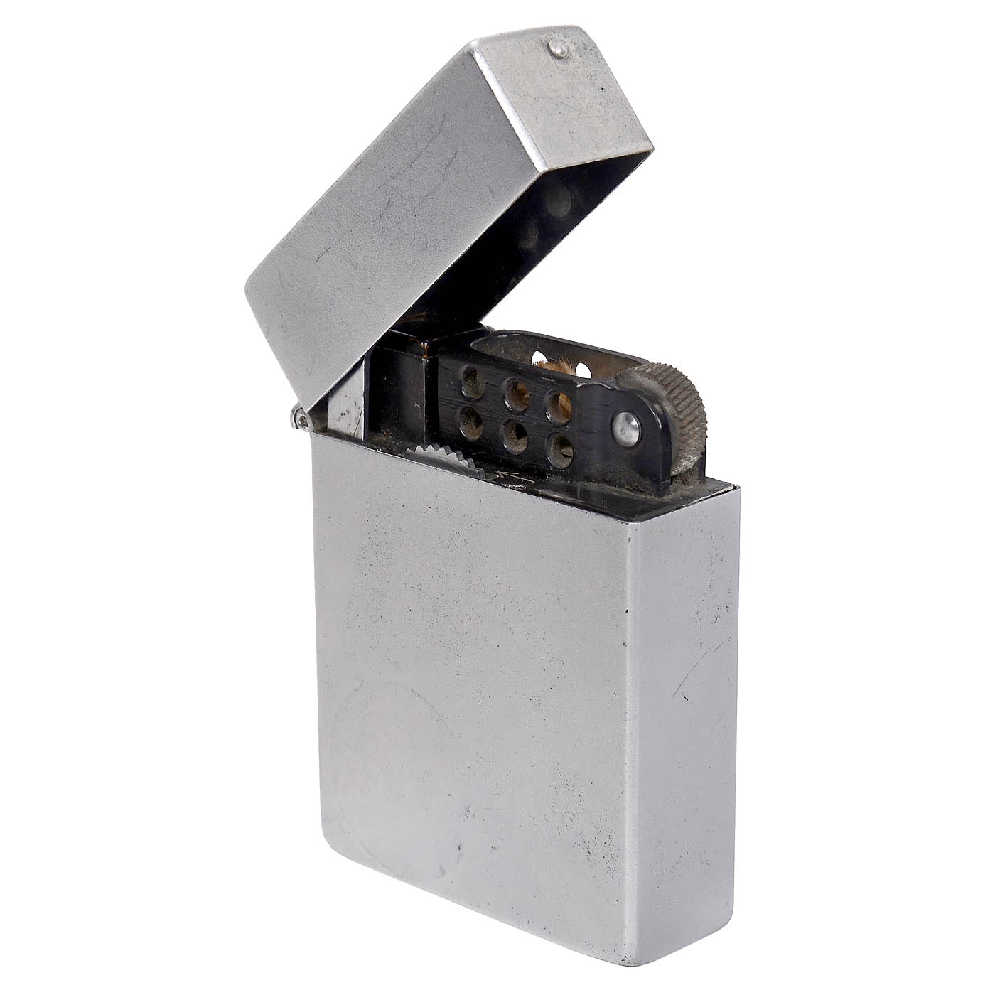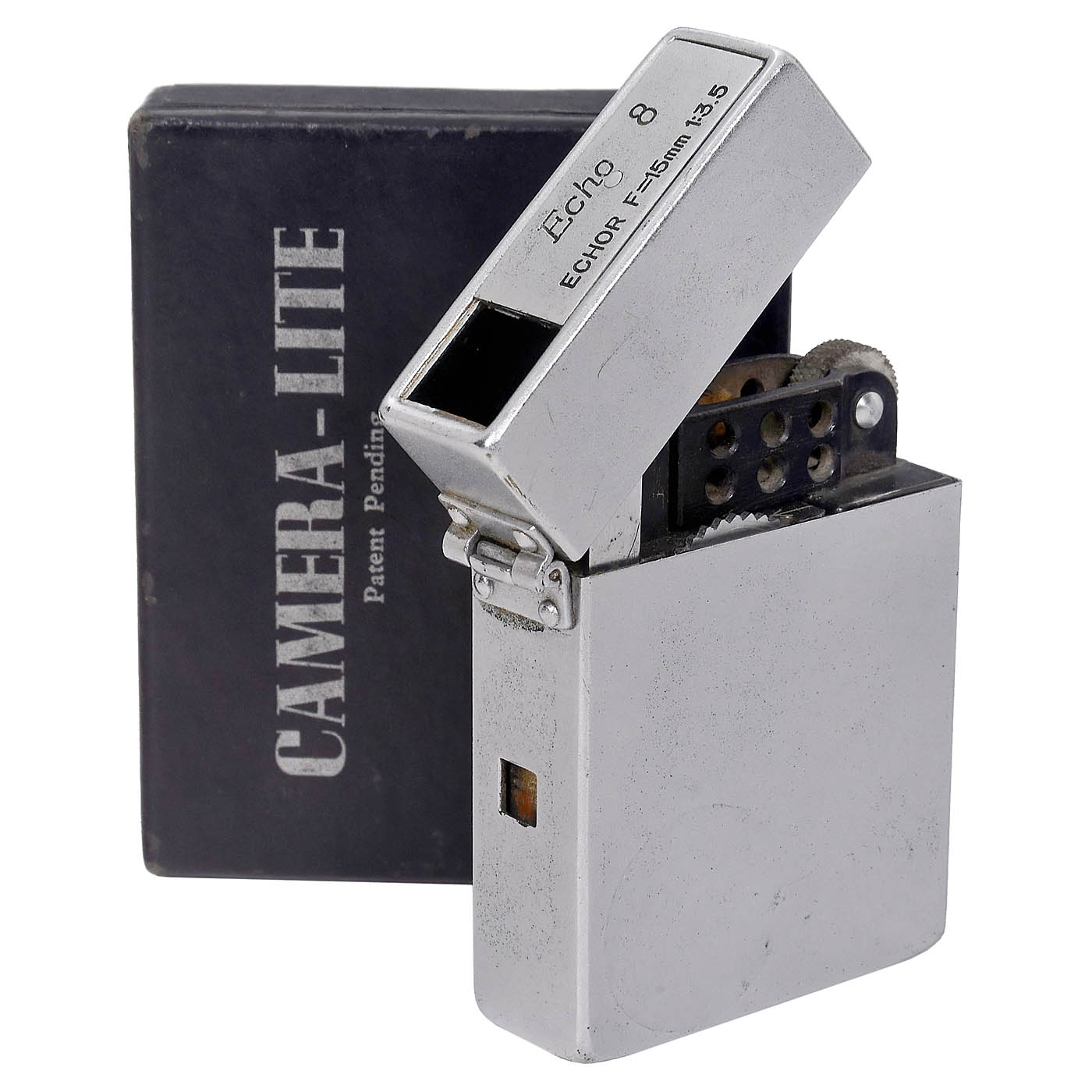Suzuki, Japan. Zippo lighter-form camera, 5 x 5 mm on 8mm film, with Echor 3,5/15 mm, diaphragm 3.5-16 lens, I and B shutter, original box and two inserted cassettes, camera 58 x 47 x 17 mm. - Rare.