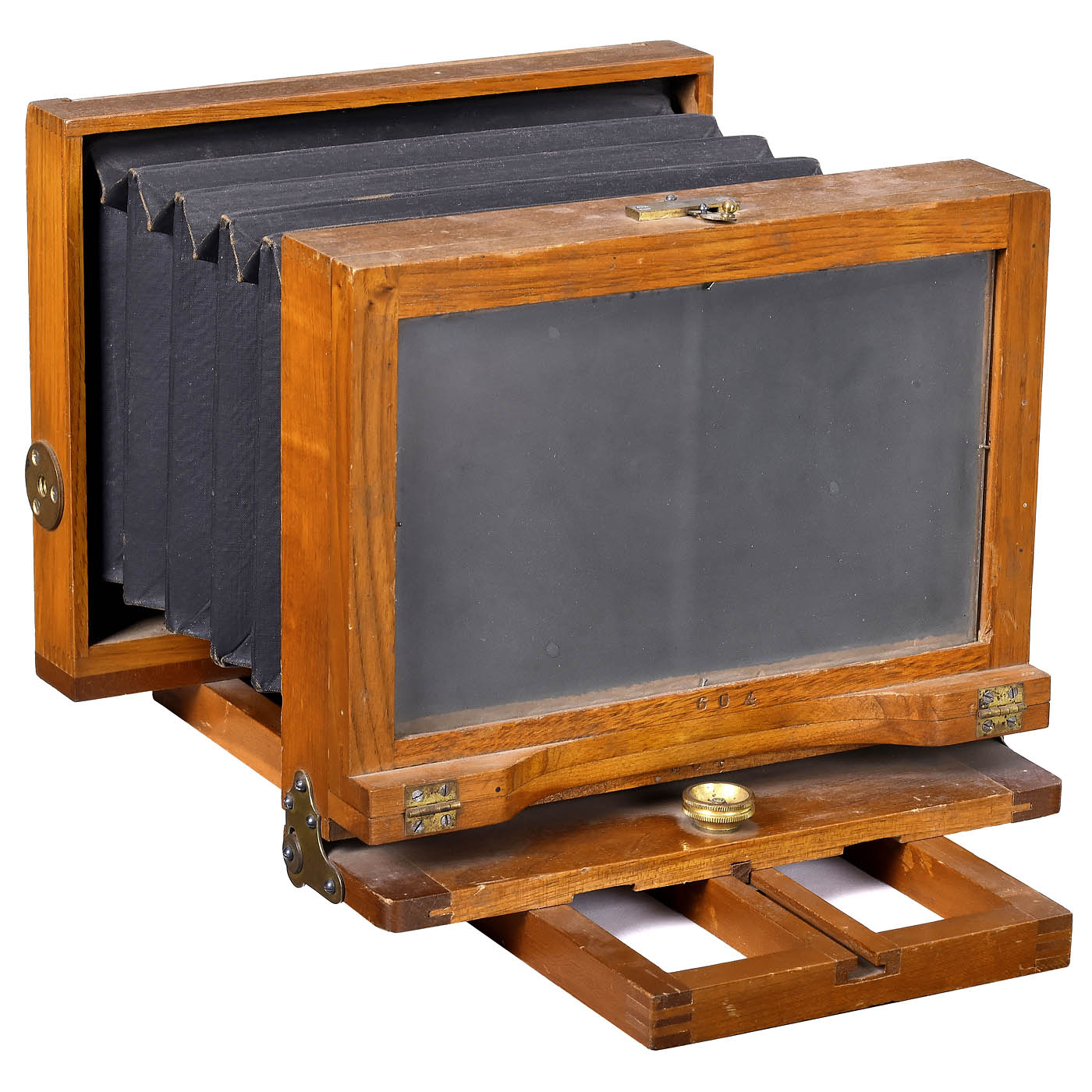 No. 604, for 11.9 x 20.3 cm plates, dark-brown fabric bellows, extension up to 32.5 cm, Petzval-type lenses of approx. 3.4/12 cm, engraved "Benj. French & Co, Boston", with provision for Waterhouse stops, pivoting back standard and fold-out focusing screen back. Very well-preserved.