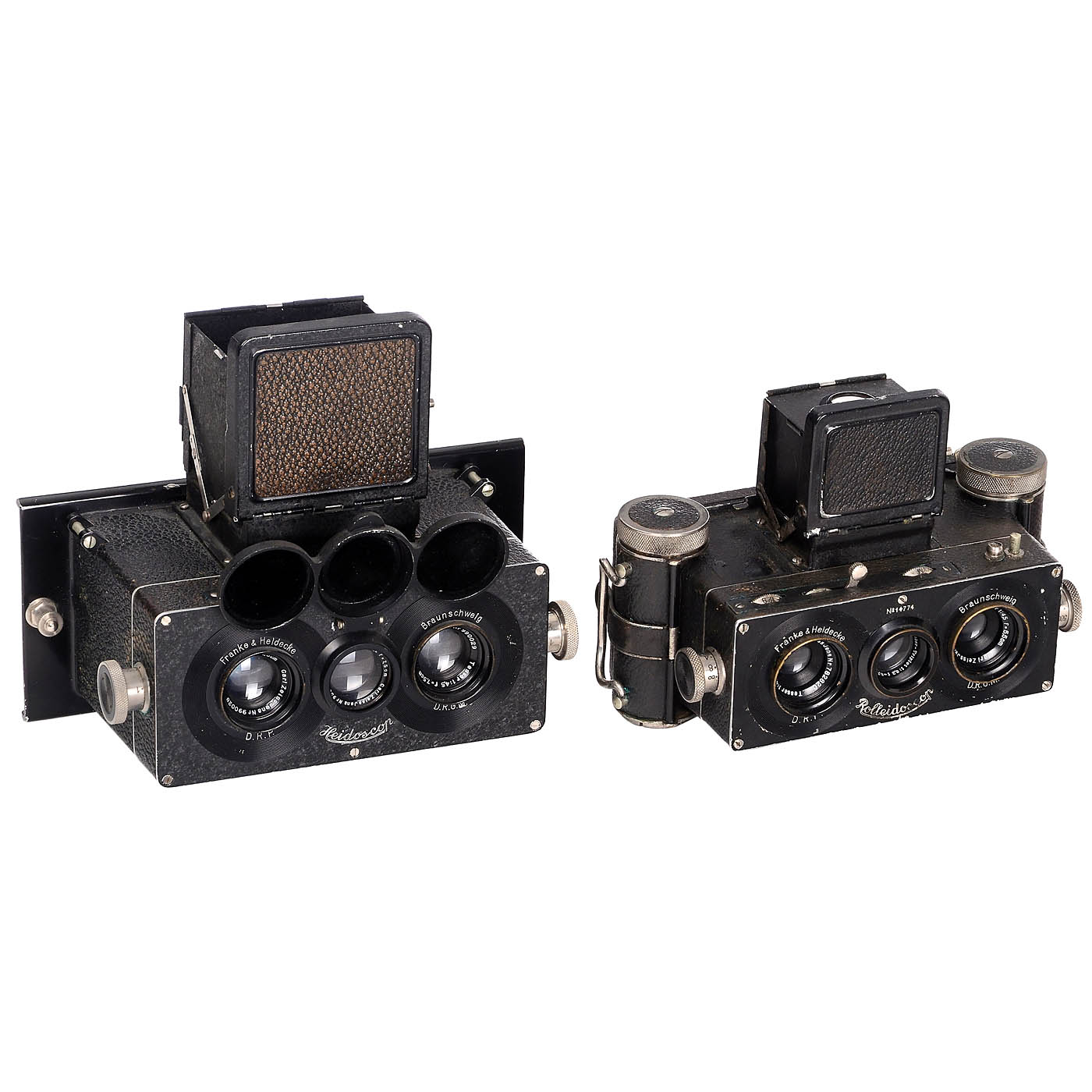 Franke & Heidecke, Braunschweig. 1) Rolleidoscop no. 14774 for 40 x 40 mm on 127-rollfilm, Carl Zeiss Jena Tessar 4.5/5.5 cm lenses, pneumatic central shutter Z (= T), B, 1-1/300 sec., working, folding finder hood with ground glass and spirit level (working), with case. One of approx. 400 units produced. - And: 2) Heidoscop no. 25713, for plates of 6 x 13 cm, fourth model with swinging sunshades, Carl Zeiss Jena Tessar 4.5/7.5 cm, Zeiss Sucher-Triplett 4.2/7.5 cm, iris diaphragms 4.5 to 25, central stereo shutter B, Z, 1-1/300 sec., working, focusing screen with spirit level (working), without focusing screen back.