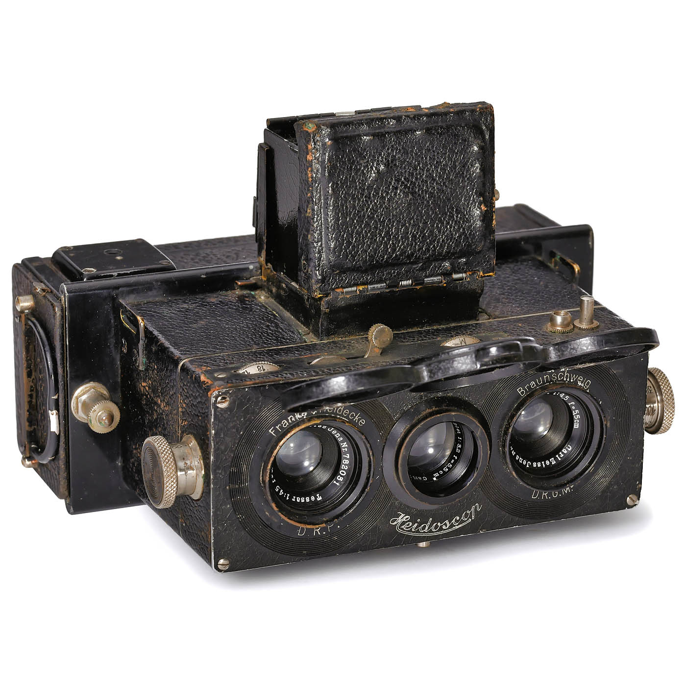 Franke & Heidecke, Braunschweig. Stereo camera for plates of 45 x 107 mm, Zeiss Tessar 4.5/5.5 cm, iris diaphragms 4.5 to 18, central shutter: Z, B, 1 to 1/300 sec., distance setting 1 m to infinity, waist-level finder with Zeiss Triplet 3.2/5.5 cm, with magazine for 12 plates (plate transport sticking). Only about 300 copies of this Heidoscop model were produced. - Literature: Prochnow register: PR007.