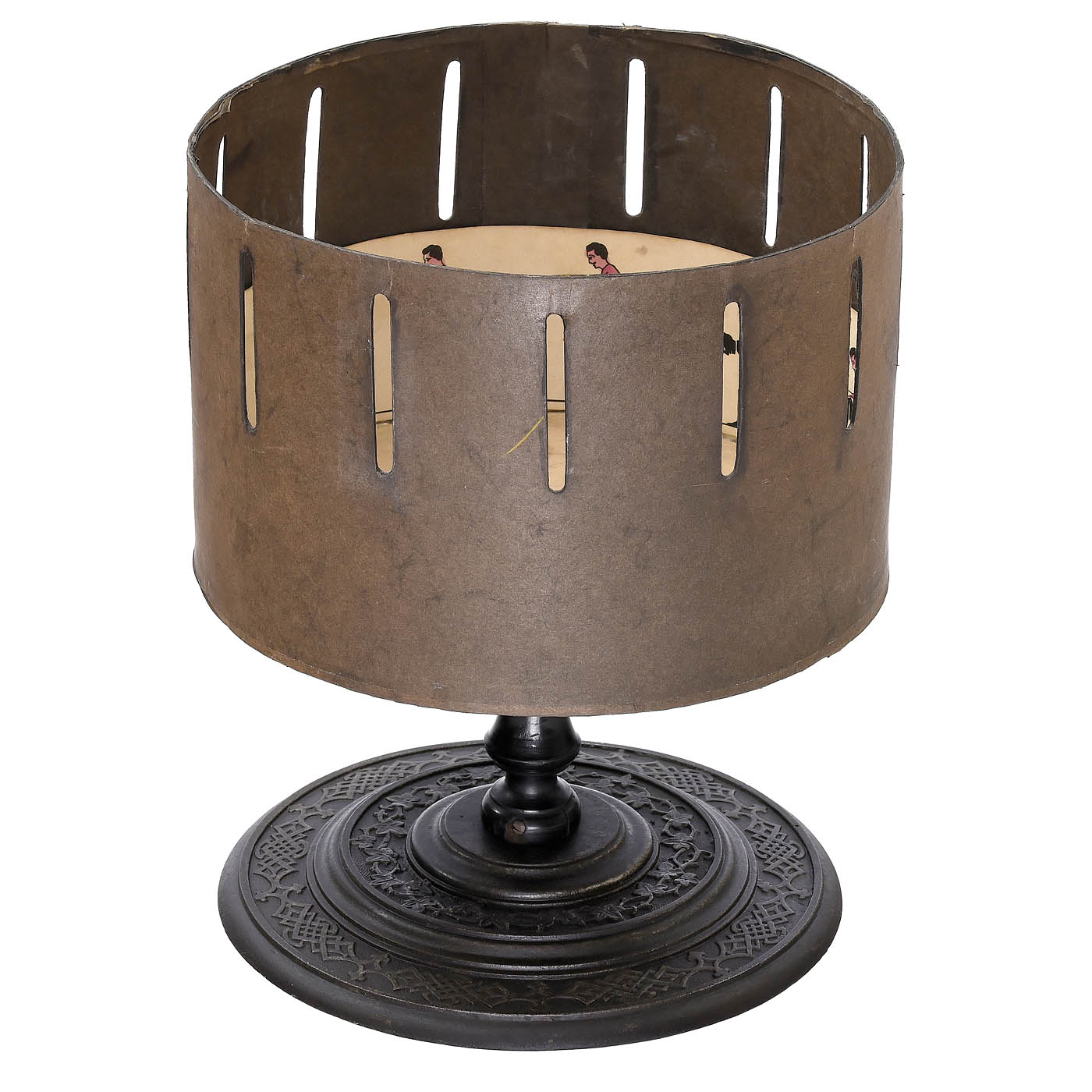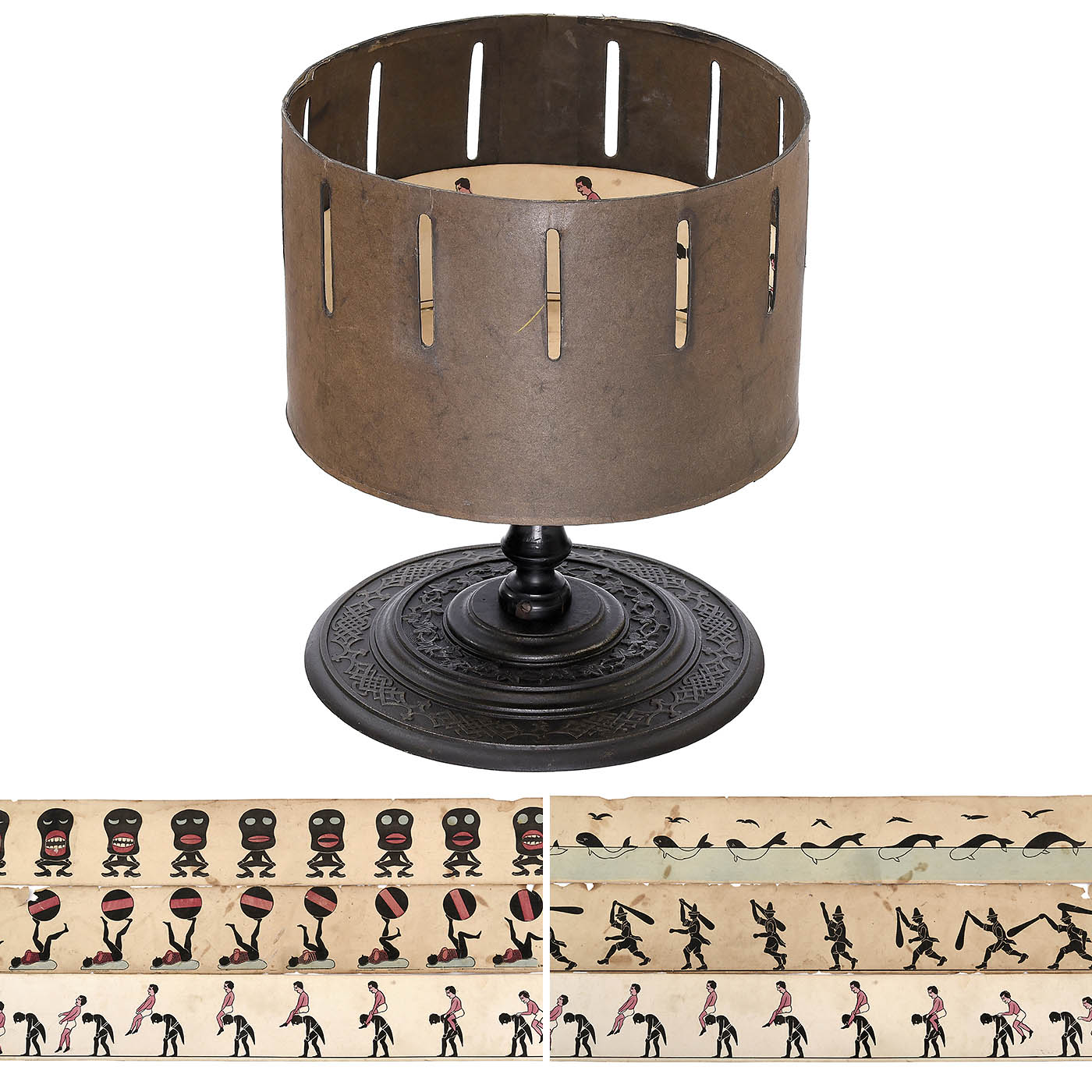 D. Baldwin, Dublin, Ireland. Miracle drum made of hard cardboard with a diameter of 30 cm. Decorative cast-iron base with beautiful ornaments. Device stable and rotates well for a long time. Three strips of paper, two of them printed twice. One of the strips with damage to the edges, but playable. Slight soiling. Moving joke images. Animated "film illusion" before the invention of cinematography.