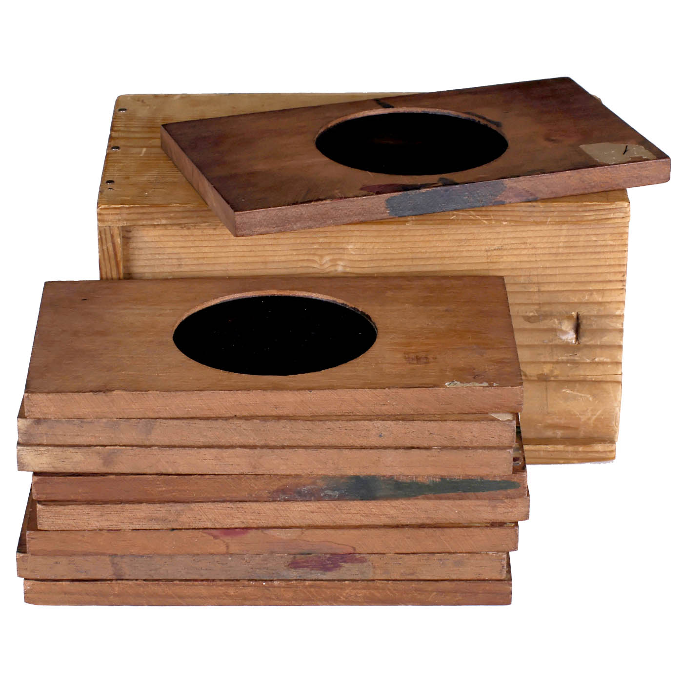 Mahogany frames, 4 x 7 in. (10 x 18 cm), with circular images Ø 3 1/3 in. (8,5 cm), three frames with labels: "No Cross, No Drown - The Dreamer", hand-colored transfers, with wood box, marked "1890-1891", rare and in good condition.