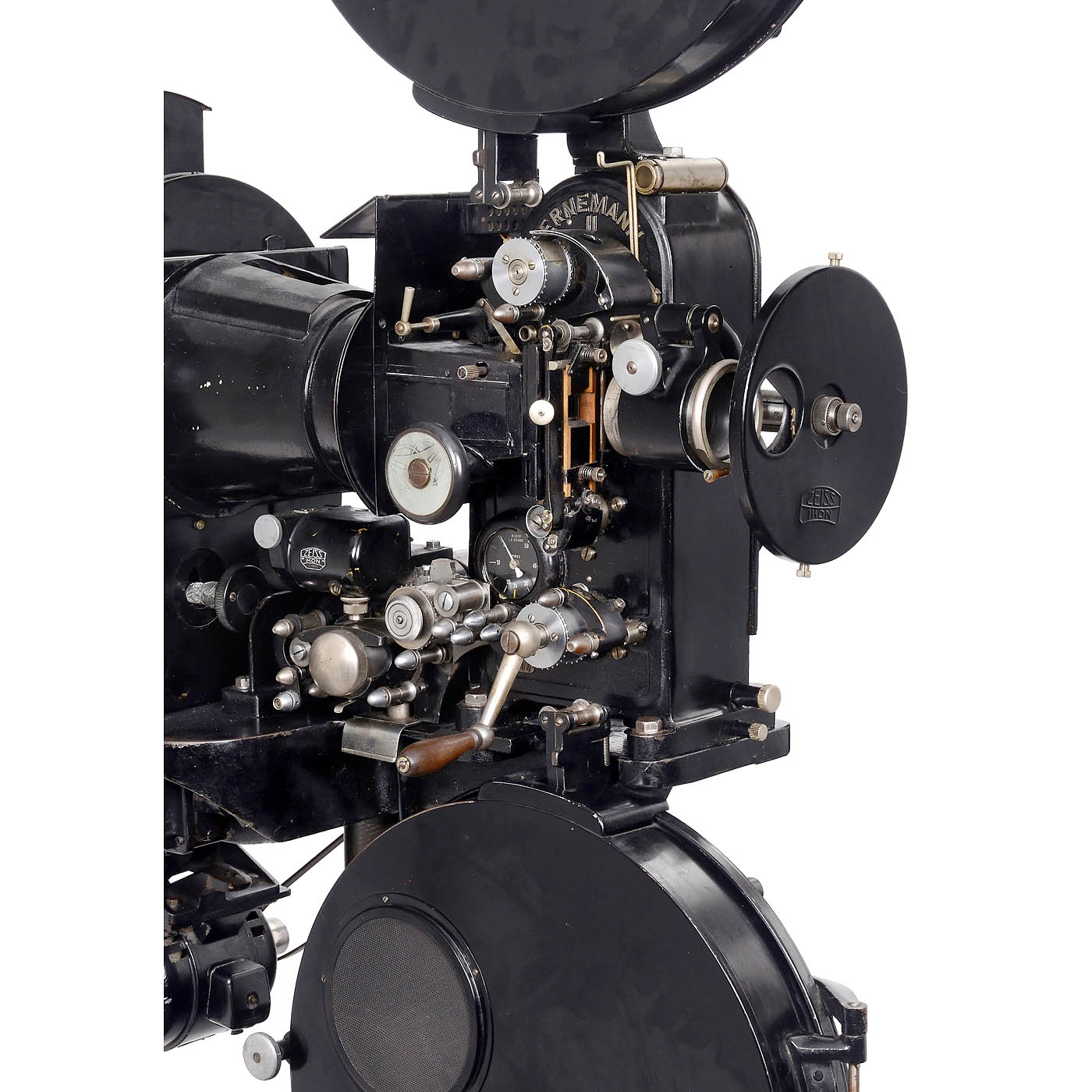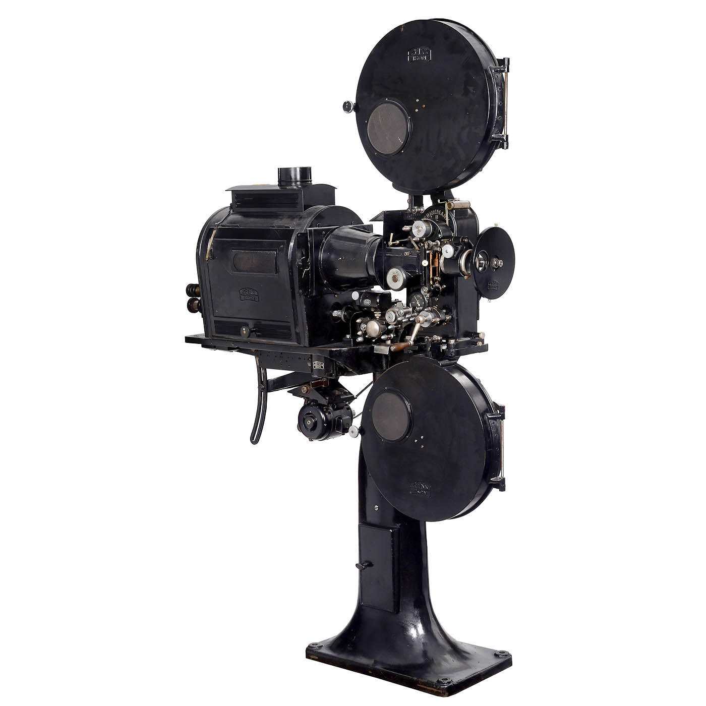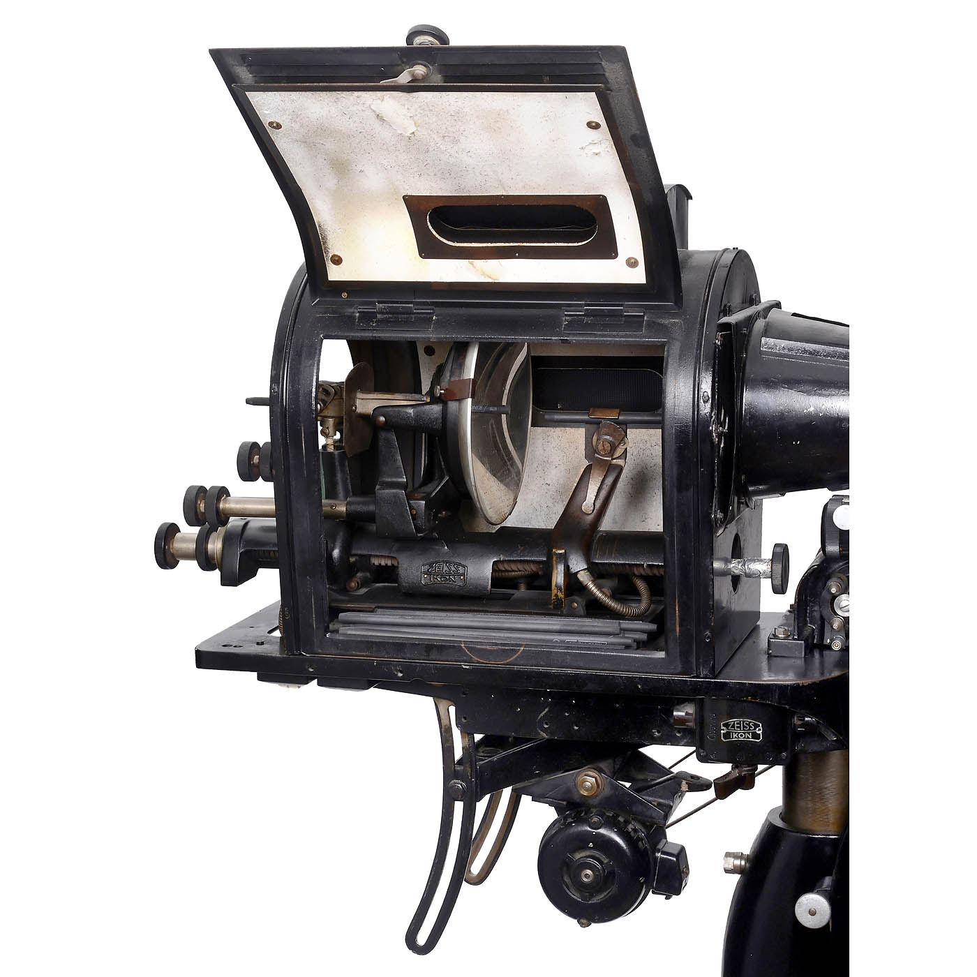 Zeiss Ikon, Dresden. For 600m reels in fire-resistant drums, with hand-turned or motorised operation, Maltese cross film-advance, separate Zeiss Ikon sound equipment for light tone scanning and large Zeiss Ikon lamp house with the original carbon arc lamp, unit in good working condition, electrical functions untested. - Note: With its new machine, the "Ernemann II", Zeiss Ikon planned to replace the "Ernemann Imperator" projector (also known as Ernemann I) that had been in production until that time.