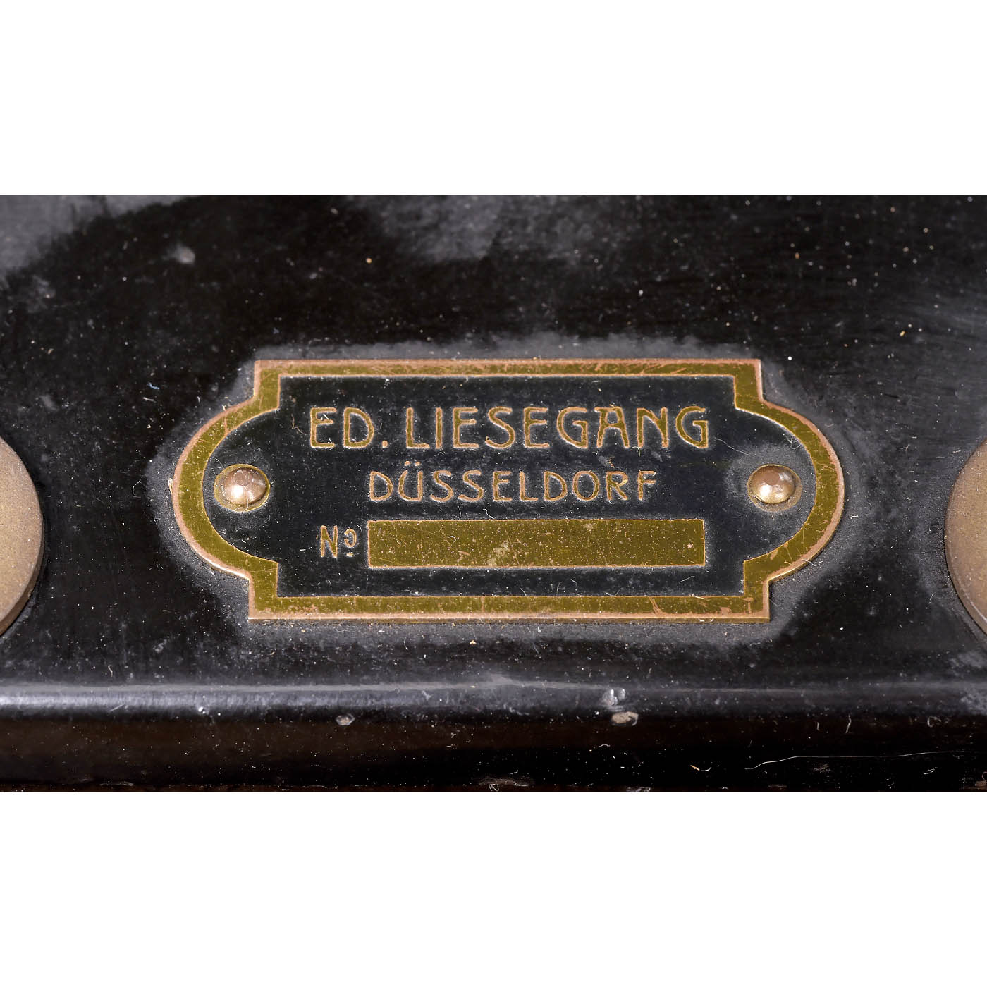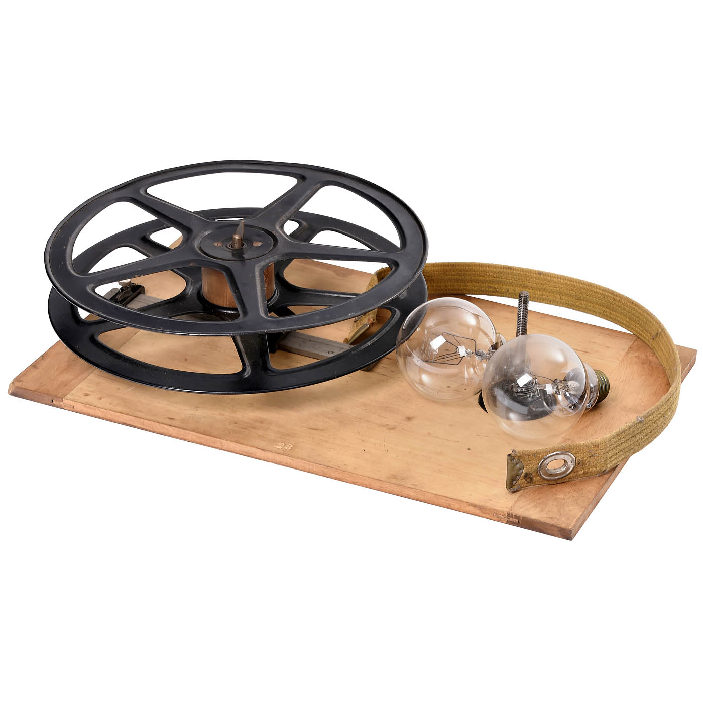 Ed. Liesegang, Düsseldorf, Germany. Traveling cinema for 35mm films on 300-meter reels, with hand-turned "beater" movement coupled with a front panel, large lamp house with electric illuminant in E27 socket and unmarked Liesegang lens, in scarce original transport box serving as a projection table and film reel at the same time, box 32 x 28 x 47 cm, electric functions untested. - In addition: Three metal spools, including film fragments, and two replacement light bulbs 220 V/150 W, one with "Liesegang" legend.