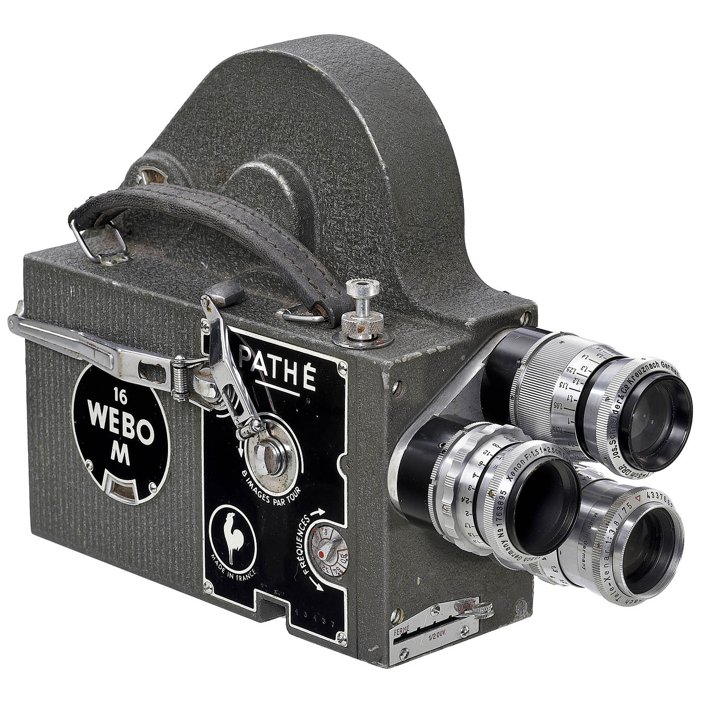Pathé, Paris. For 16mm films on 30m daylight spools (in camera), 8-64 fps spring-drive, Newton and SLR semi-transparent-mirrored viewfinders, automatic fade-in/out and three lenses in the turret: Schneider-Kreuznach Xenon 1.5/25 mm, Xenon 2.8/50 mm and Tele-Xenar 3.8/75 mm.