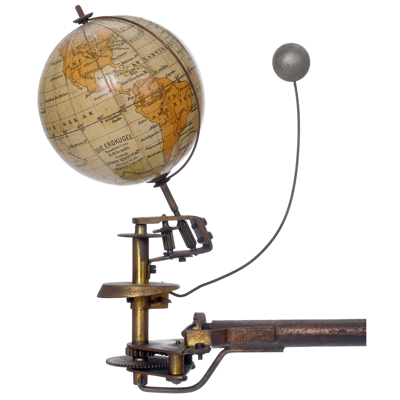 Physical demonstration model, 1:163 million scale, bronzed cast metal and brass, with hand-turned mechanism, the sun as a candle without reflector, 3 1/6 in. plaster globe with lithographed gores, marked: "Die Erdkugel, bearbeitet von H. Albrecht, Verlag: Ernst Schotte & Co, Berlin W35", compass showing the houses of the zodiac, globe and compass with German lettering, overall length 15 ¾ in., working.