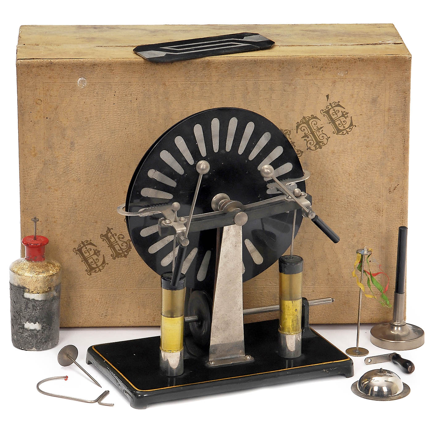 With Wimshurst's electrostatic machine (discs bent), one chromic acid cell battery, lightning plate and other experimental parts.