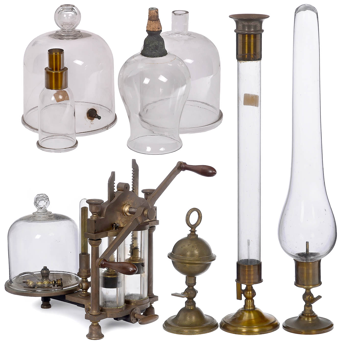 Engraved "Benevolo & Coquais à Lyon", original lacquered brass, with 2 recipients, a pressure gauge mounted on a steel scale within a domed glass tube, a Ø 10 5/8 in. glass-covered vacuum table and a glass bell-jar, overall height 19 5/8 in. The accessories consist of Magdeburg hemispherees engraved "Benevolo & Coquais, Passage del Hotel Dien, Lyon", 3 additional glass domes, siphon fountain and suction lifter.