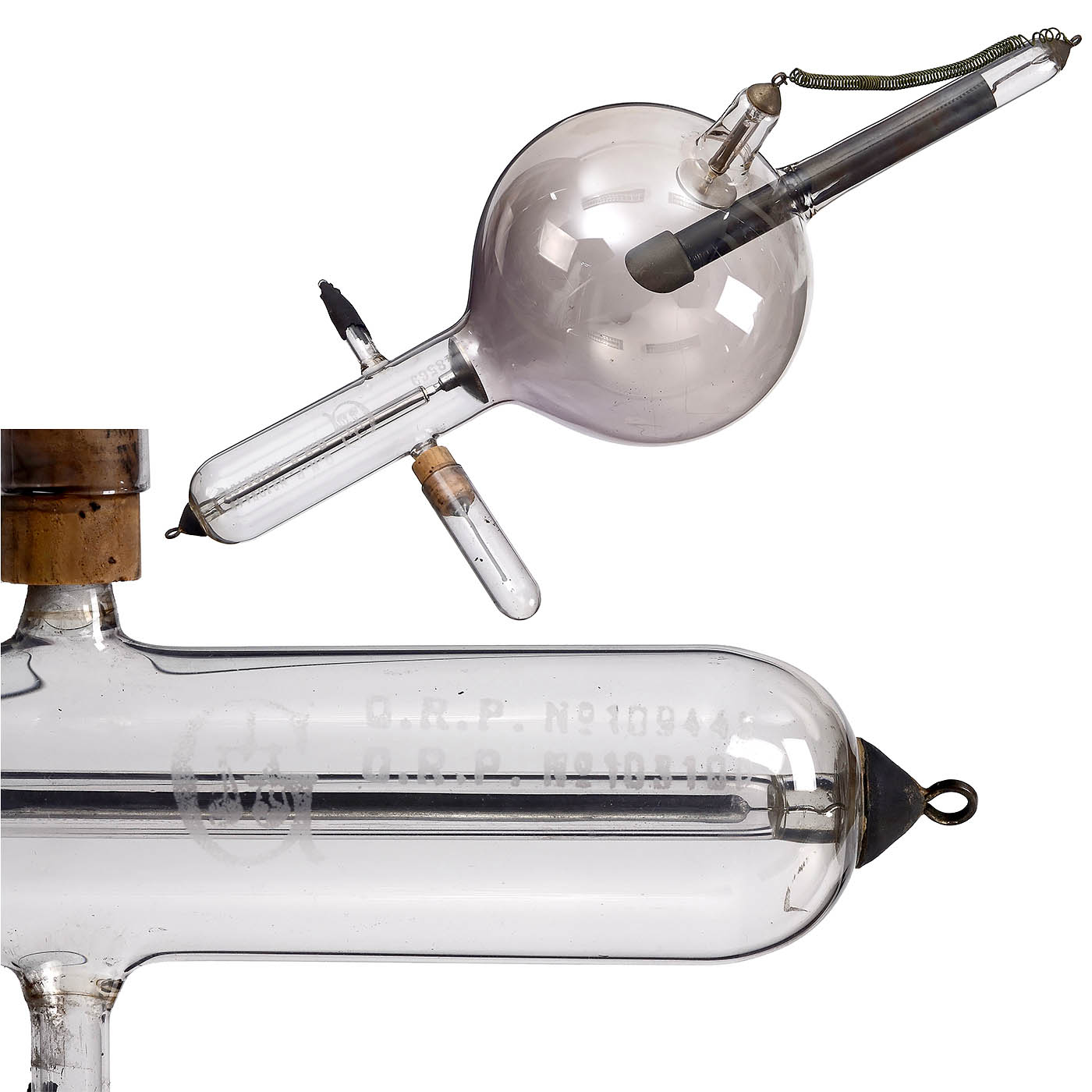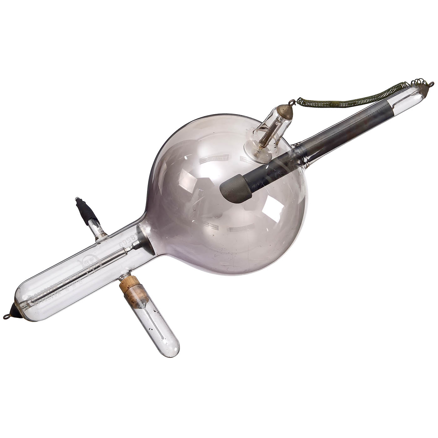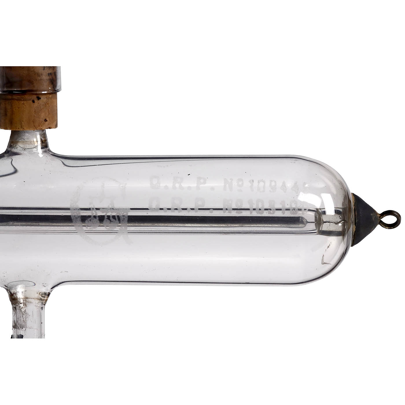 Gehlberg in Thuringia, Germany, DRP no. 109449, serial no. 48569, with heavy tubular anticathode, for inductors with electrolytic interrupter according to Wehnelt, length 15 in., diameter of the sphere 5 in., with etched logo of the Gundelacher Glasfabrik: a large "G" and scales, good original condition.