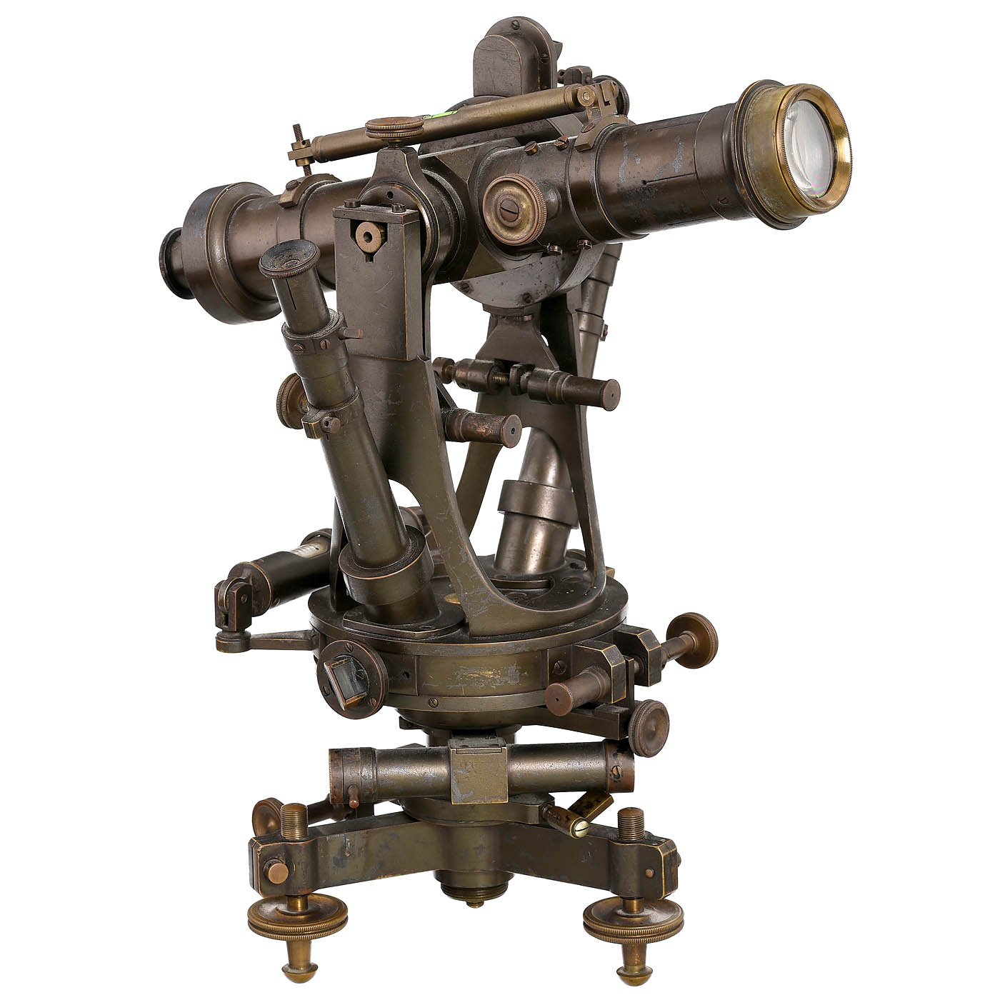 Ing. A. Salmoiraghi & C., Milano, Italy. No. 28113, burnished brass, 2 levels, 3 reading magnifiers, height 12 ¼ in., length of the telescope 10 1/5 in., base with 3 leveling screws. - With accessories, in original wood case.