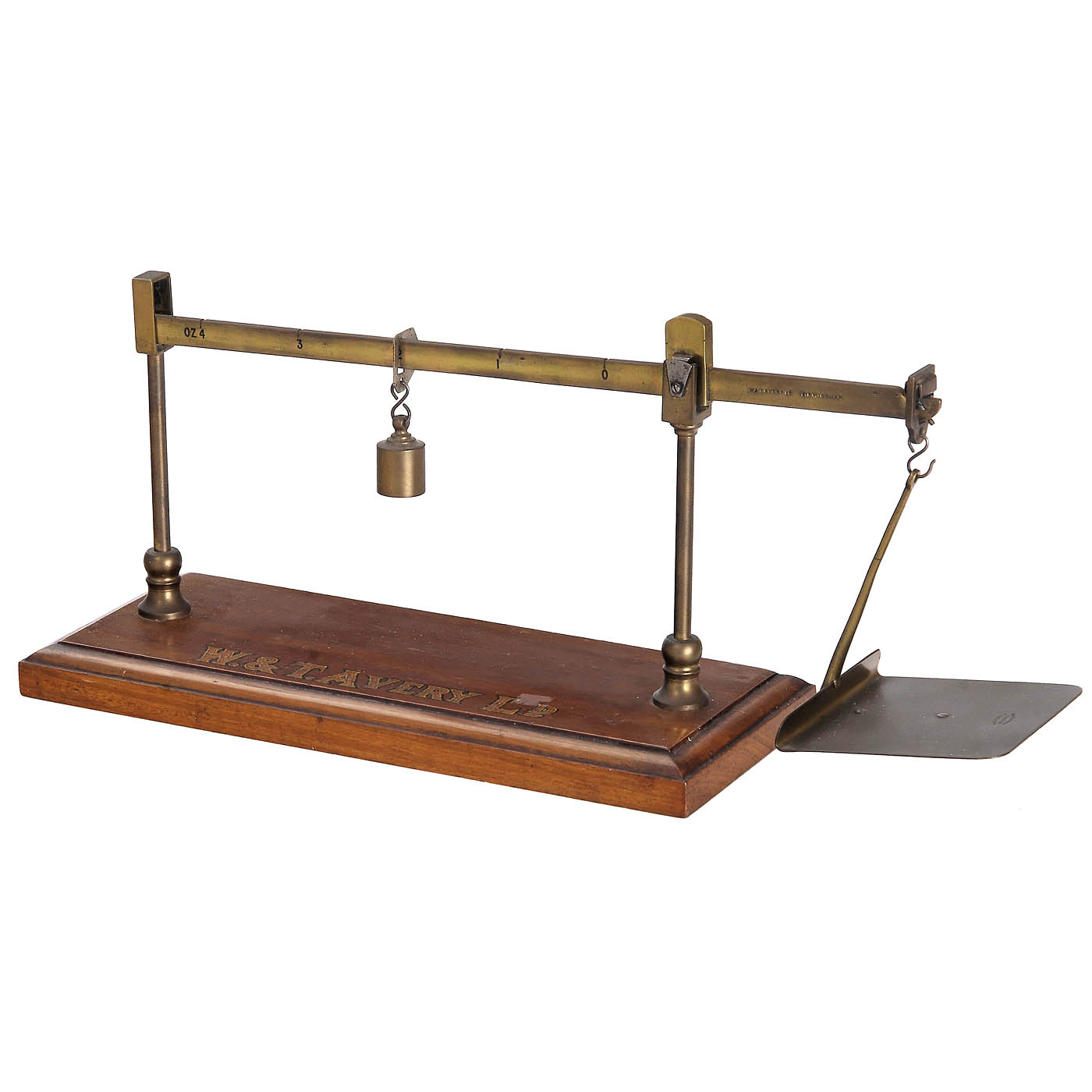 1) Brass postal beam scale by W & T Avery Ltd., c. 1895, Birmingham, England, rectangular letter tray, 13 3/4 in. long beam, capacity up to 4 ounces, sliding brass weight, on mahogany base, 11 ¾ x 5 in. - And: 2) Foyer Manufacturing Company, Chicago, c. 1920, estimation scale, brass and cast iron, length 14 ½ in.