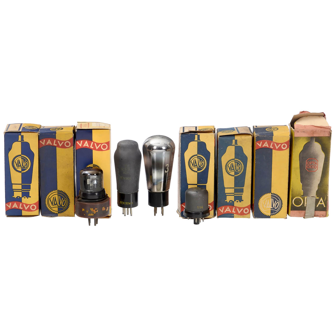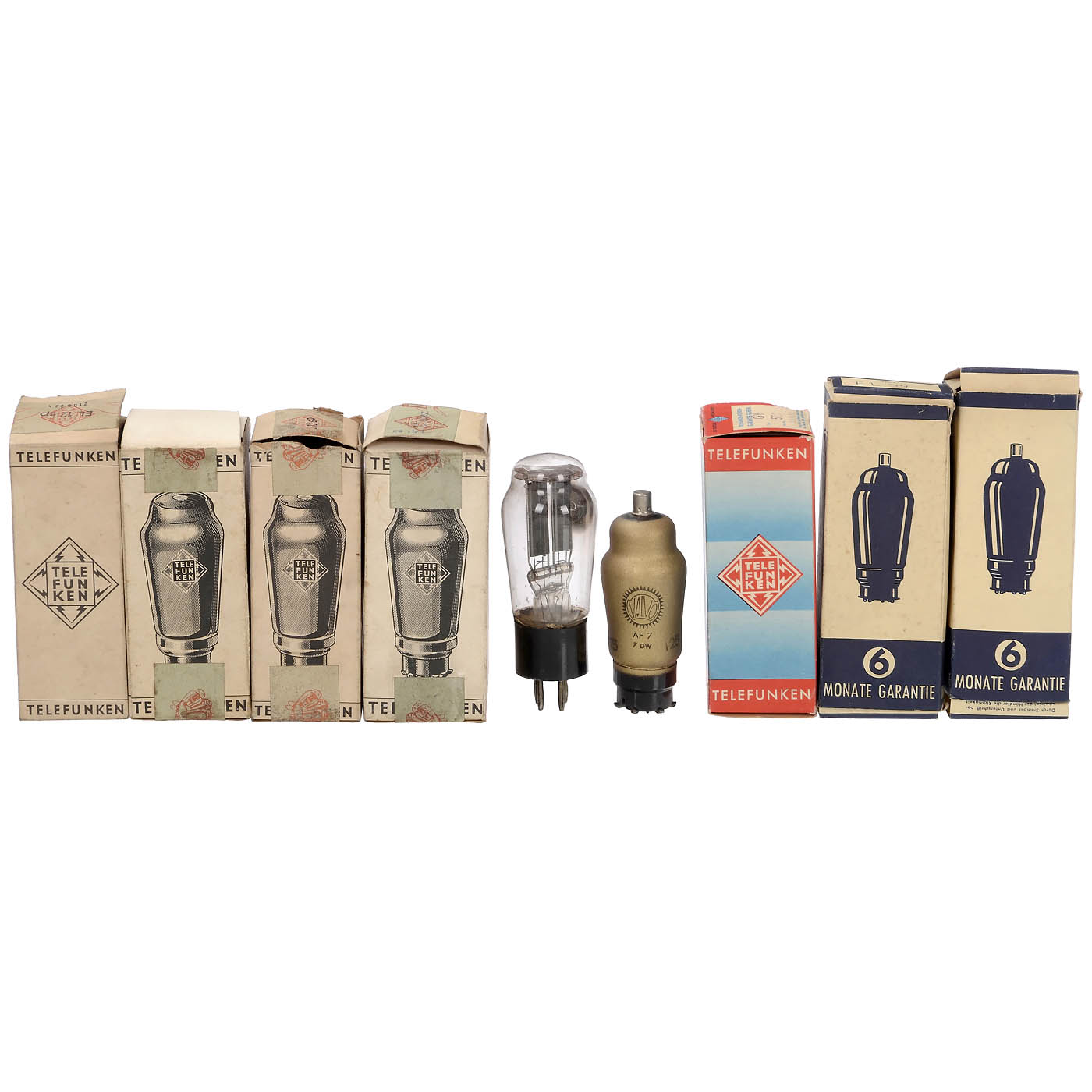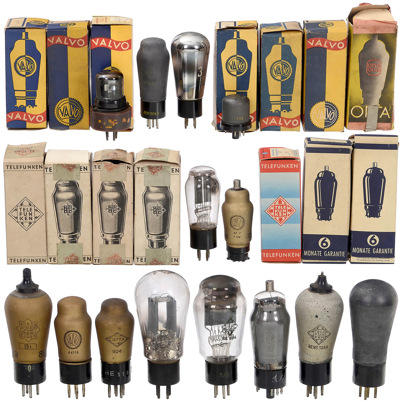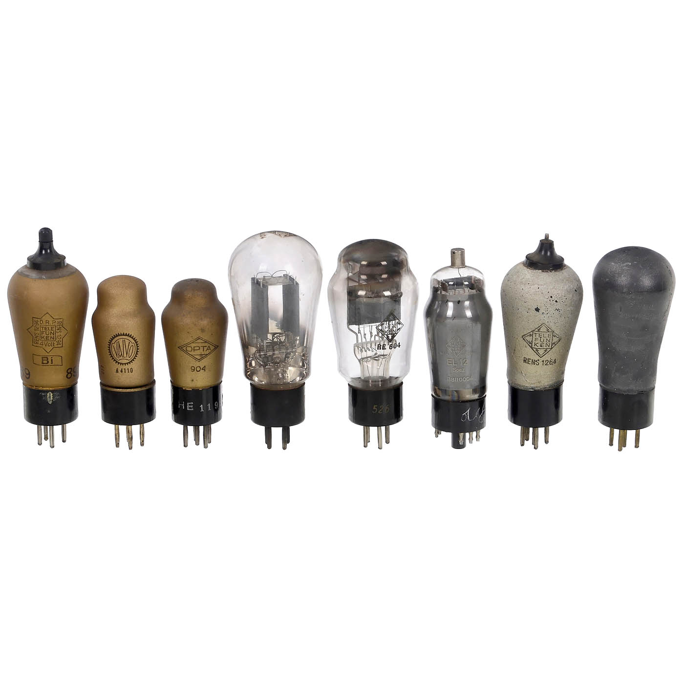 1) Telefunken RE 604, triode, filament intact. - 2) Telefunken RENS 1264, tetrode, filament intact. - 3) Valvo EL 12/375, pentode, filament intact, with box. - 4) 4 x Telefunken EL 12 spez, pentode, filaments intact. - 5) Telefunken RENS 1294, pentode, filament intact. - 6) Valvo A 4110, triode, filament intact. - 7) 2 x EL 34, power end pentode, filament intact. - 8) Telefunken RGN 2004, rectifier, untested. - 9) Valvo G2504, rectifier, untested. - 10) 2 x Valvo AL4, pentode, filaments intact. - 11) 3 x Valvo AF7, pentode, filaments intact. - 12) Valvo AZ1, rectifier, untested. - And: 13) 11 further tubes.