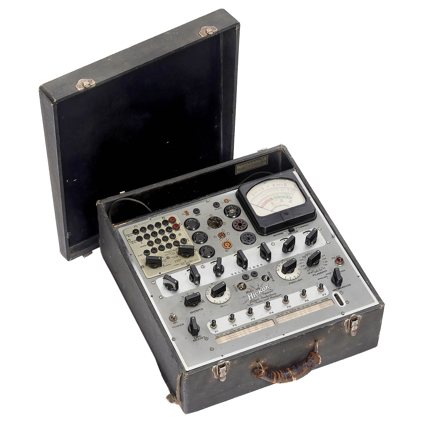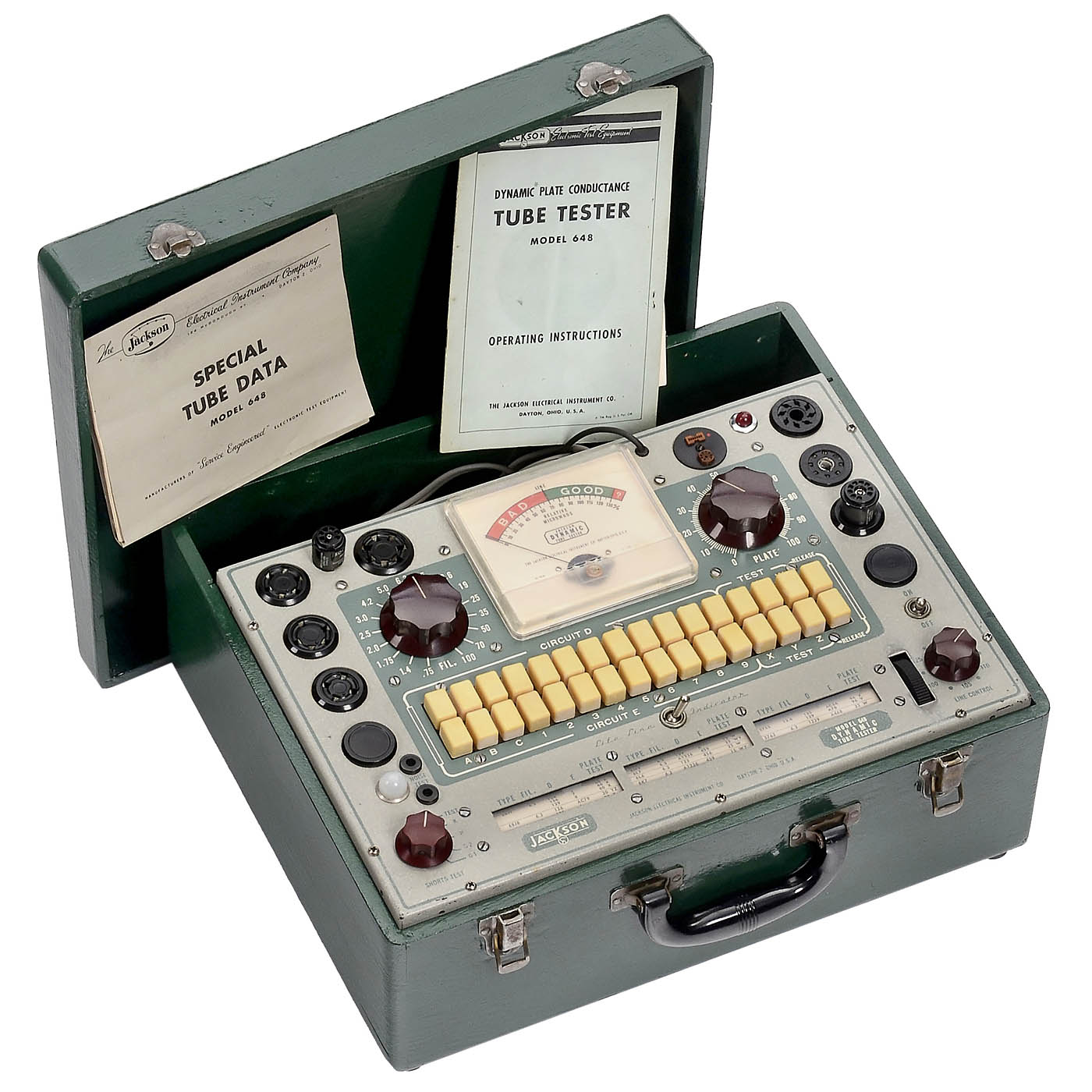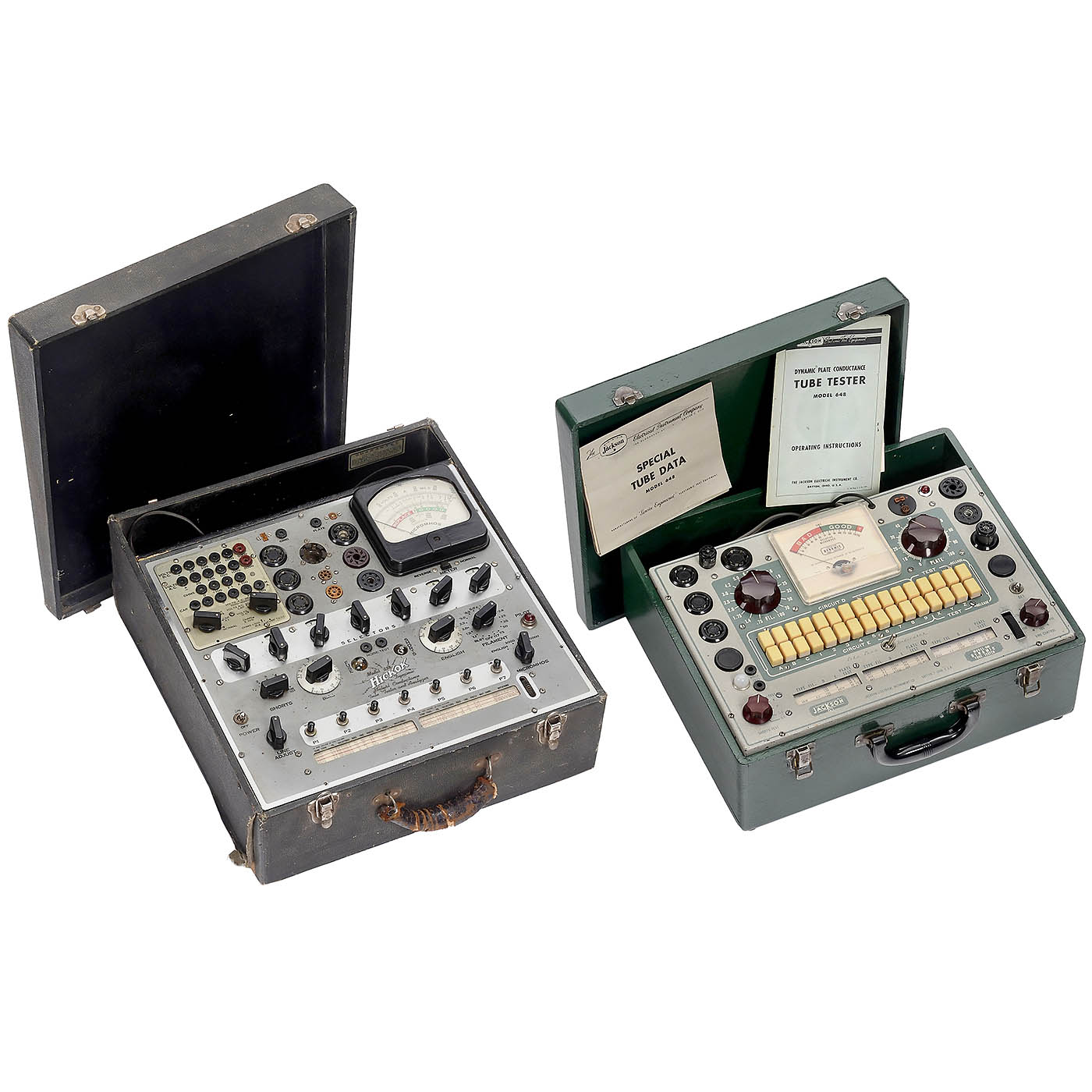 1) Dynamic Tube Tester 648, The Jackson Electrical Instrument Co., Dayton, c. 1948, single tube, 115 volts AC, wood re-varnished, with operating instructions and tube data list. - And: 2) Tube and Set Tester 534, Hickok Electrical Instrument Co., Cleveland, OH, c. 1947, 4 tubes, 115 volts AC, in wood box.