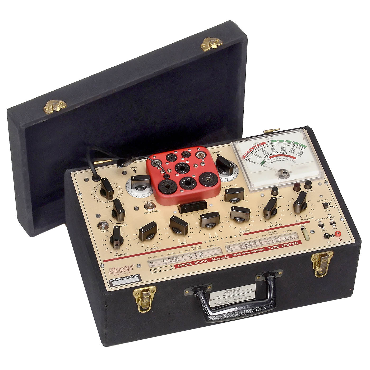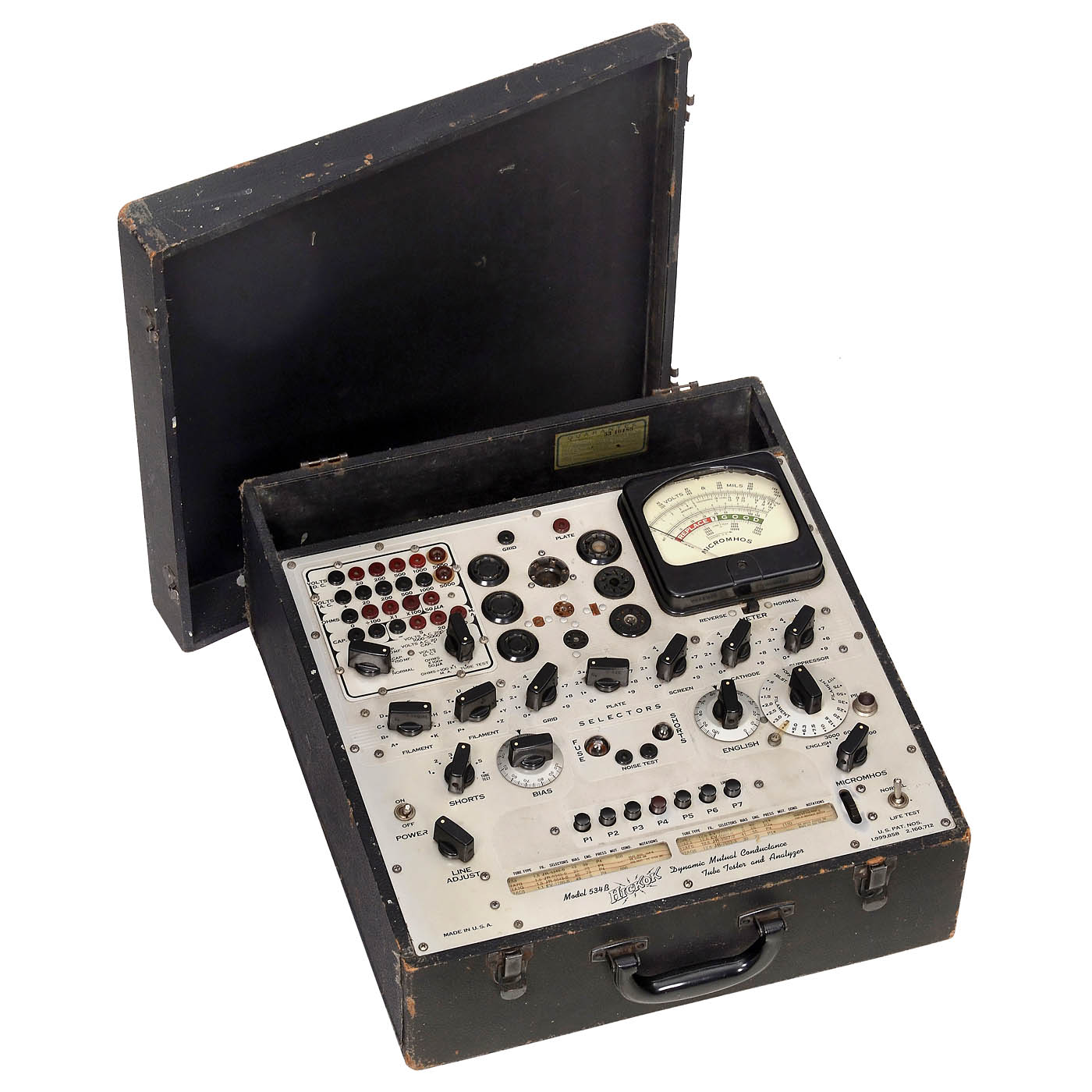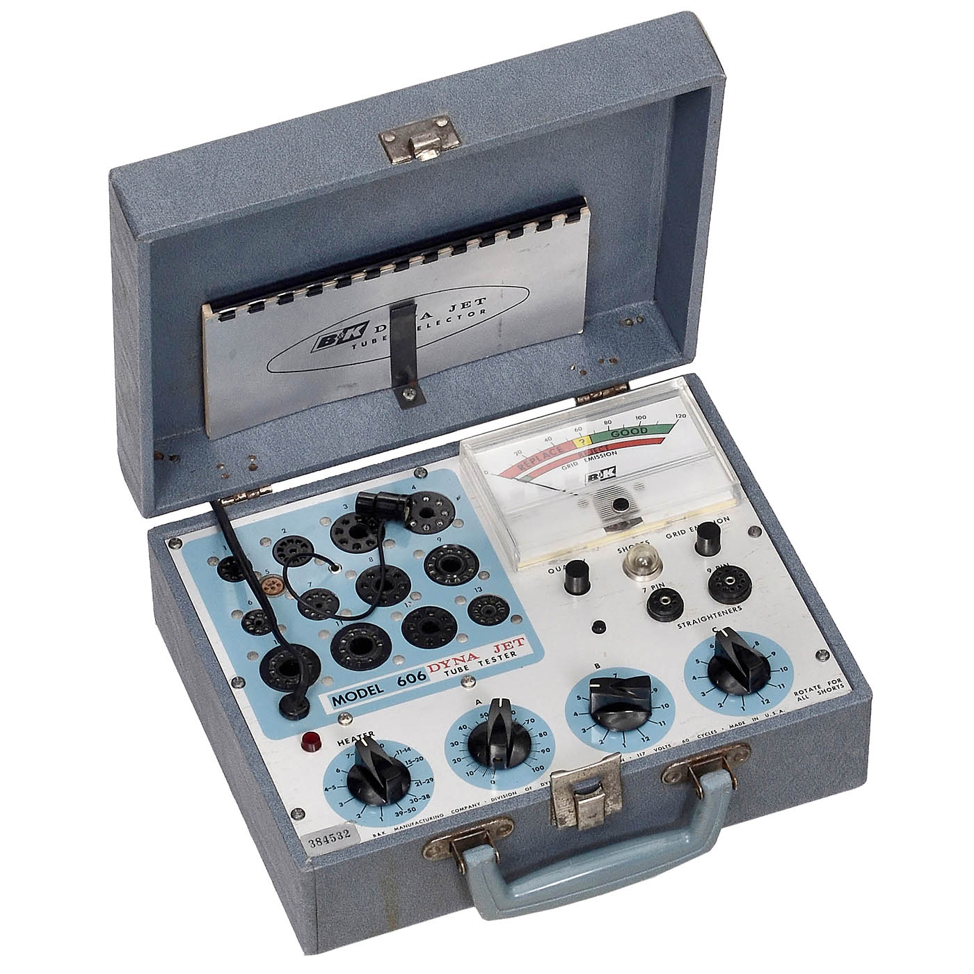 1) Hickok 534B, USA, c. 1960, 4 tubes, wood case. - 2) Hickok 6000A, USA, c. 1964, 2 tubes, wood case with fabric cover. - And: 3) Dyna Jet 606, USA, c. 1965, B&K Manufacturing Company, single tube, wood case with canvas cover. - All untested.