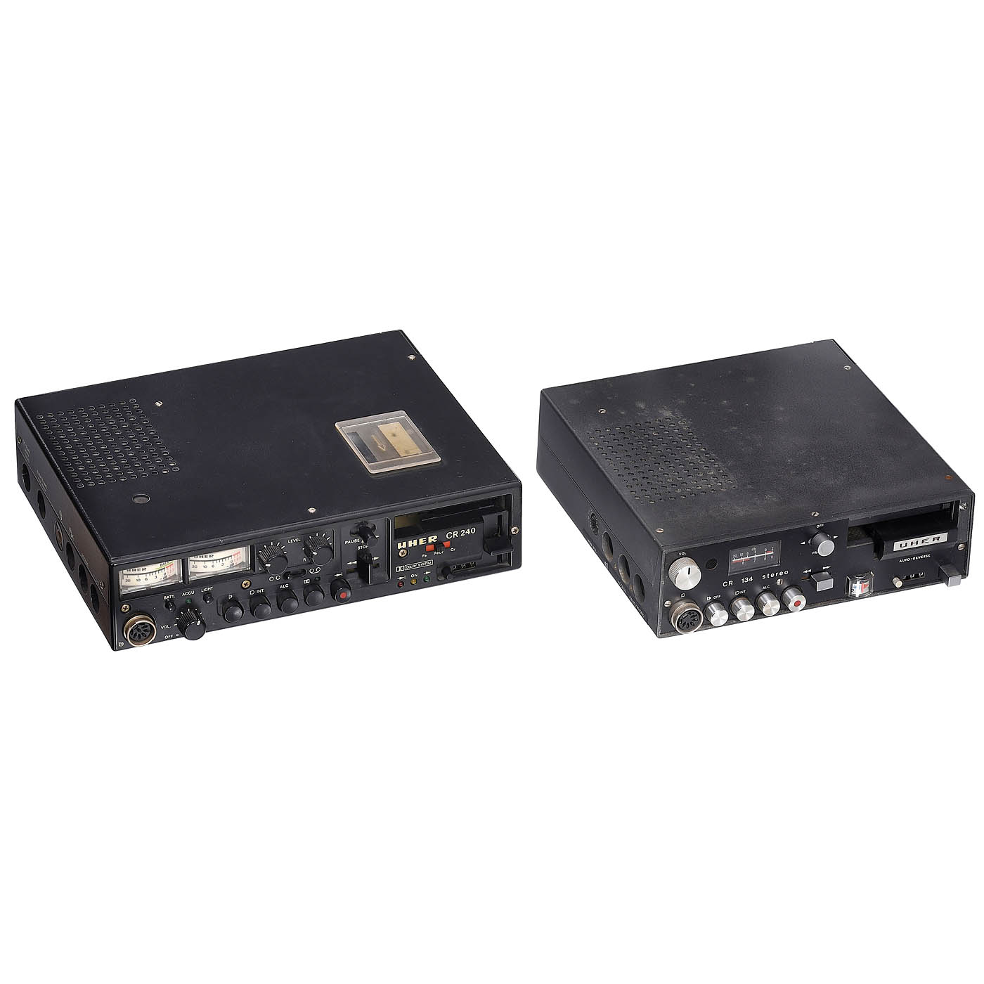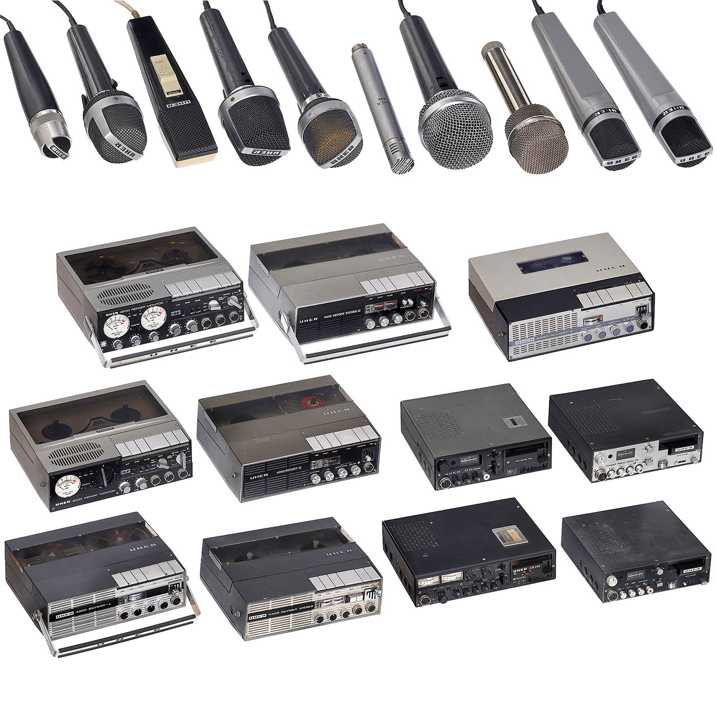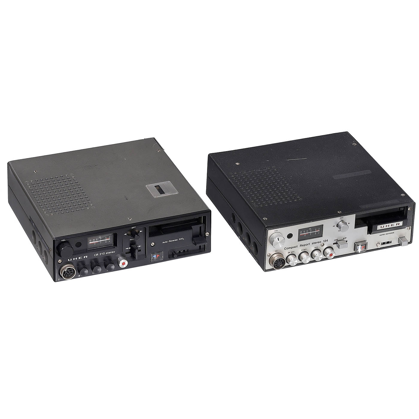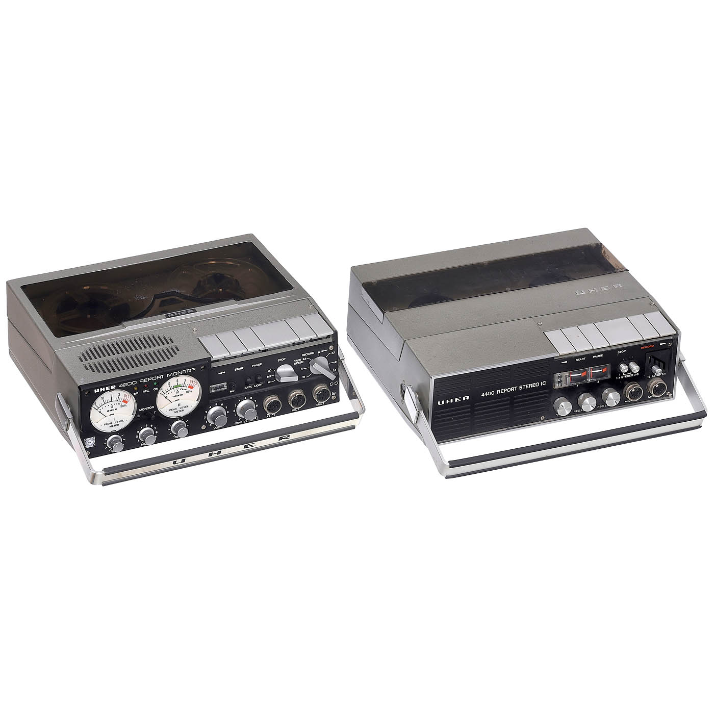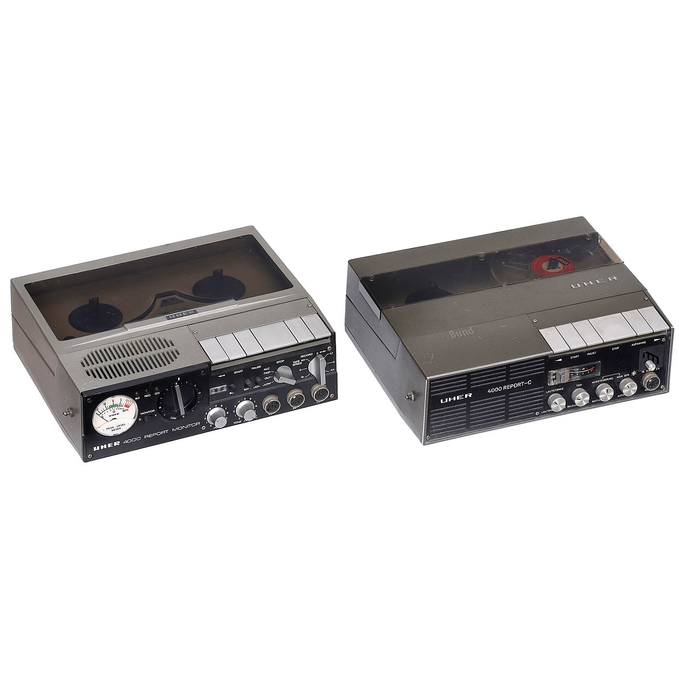 Uher Werke, Munich. 1) 4000 Report Stereo, with case and power supply. - 2) 4000 Report-L, with power supply. - 3) 4000 Report-C, with case and power supply. - 4) 4000 Report Monitor, with case, power supply and Uher M 816 microphone. - 5) 4000 Report-S, with case. - 6) 4200 Report Monitor, with power supply. - 7) 4400 Report Stereo IC, with power supply. - 8) Compact Report Stereo 124, with M 516 microphone. - 9) CR 210 Stereo, with power supply. - 10) CR 134 Stereo, with case and power supply. - 11) CR 240 Stereo, with case. - And: 12) Accessories, consisting of 6 Uher microphones (M 154, M 512, M 514, 2 models M 534 and one unmarked microphone); 5 mains chargers (3 models Z 124 A1 and 2 x Z 114); 2 with mains adapter FW 6299; 3 foot switches; Akustomat F 411; 12-volt charger Z 162; battery Z 211; and various cables. - The units mostly work, but are in need of cleaning and new drive-belts.